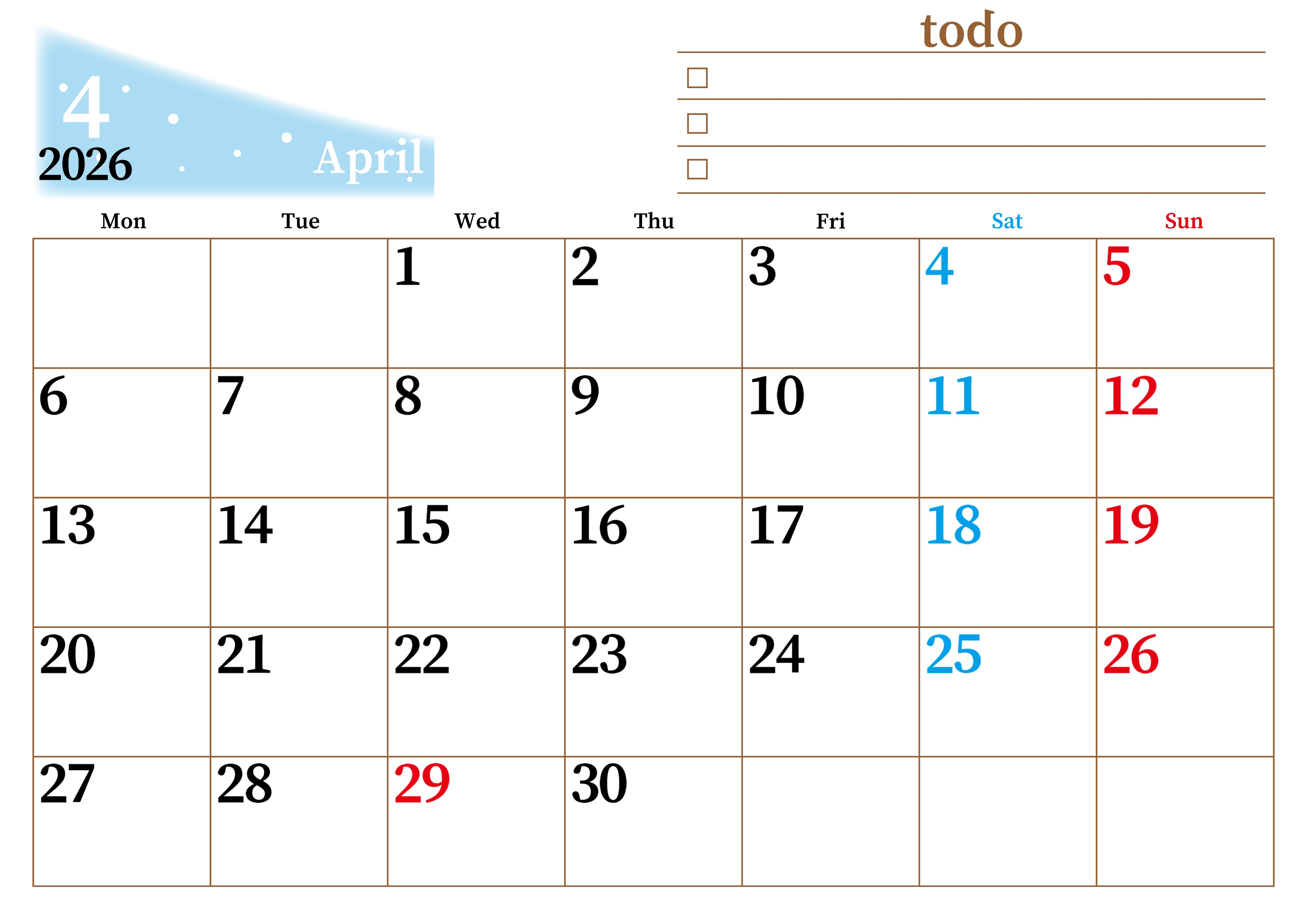 2026年4月カレンダーは横型月曜始まりでToDoリストつきです。毎月色違いで継続の習慣化が簡単にできます。ダウンロードは無料なのでおすすめです。(2026-01410401)