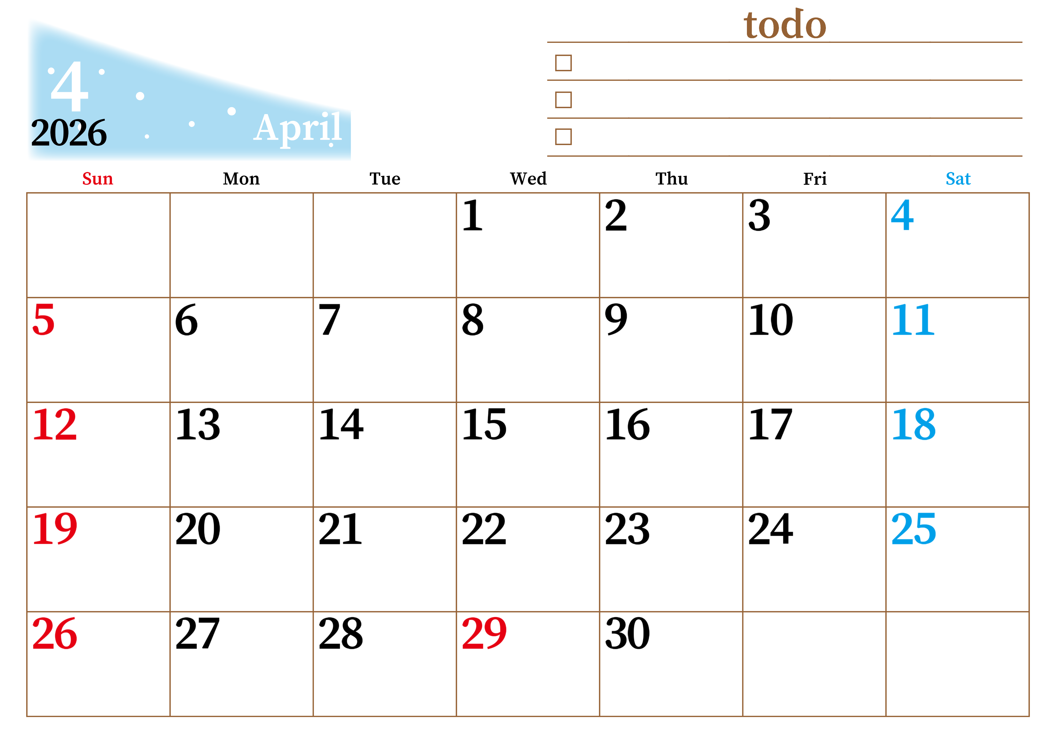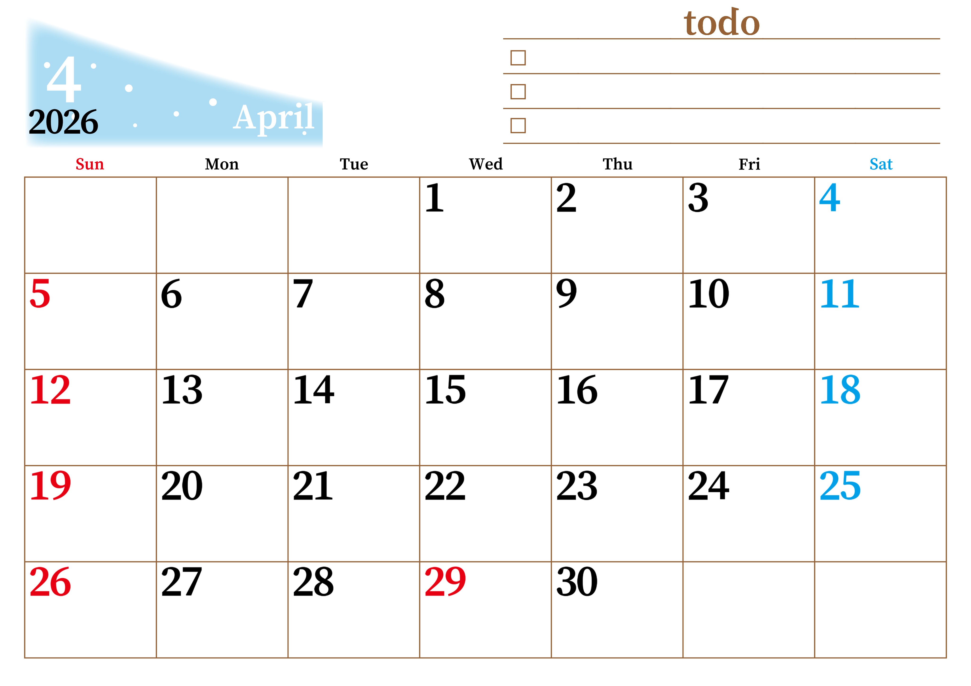 2026年4月カレンダーは横型日曜始まりでToDoリストつきです。毎月色違いで継続の習慣化が簡単にできます。ダウンロードは無料なのでおすすめです。(2026-01410400)
