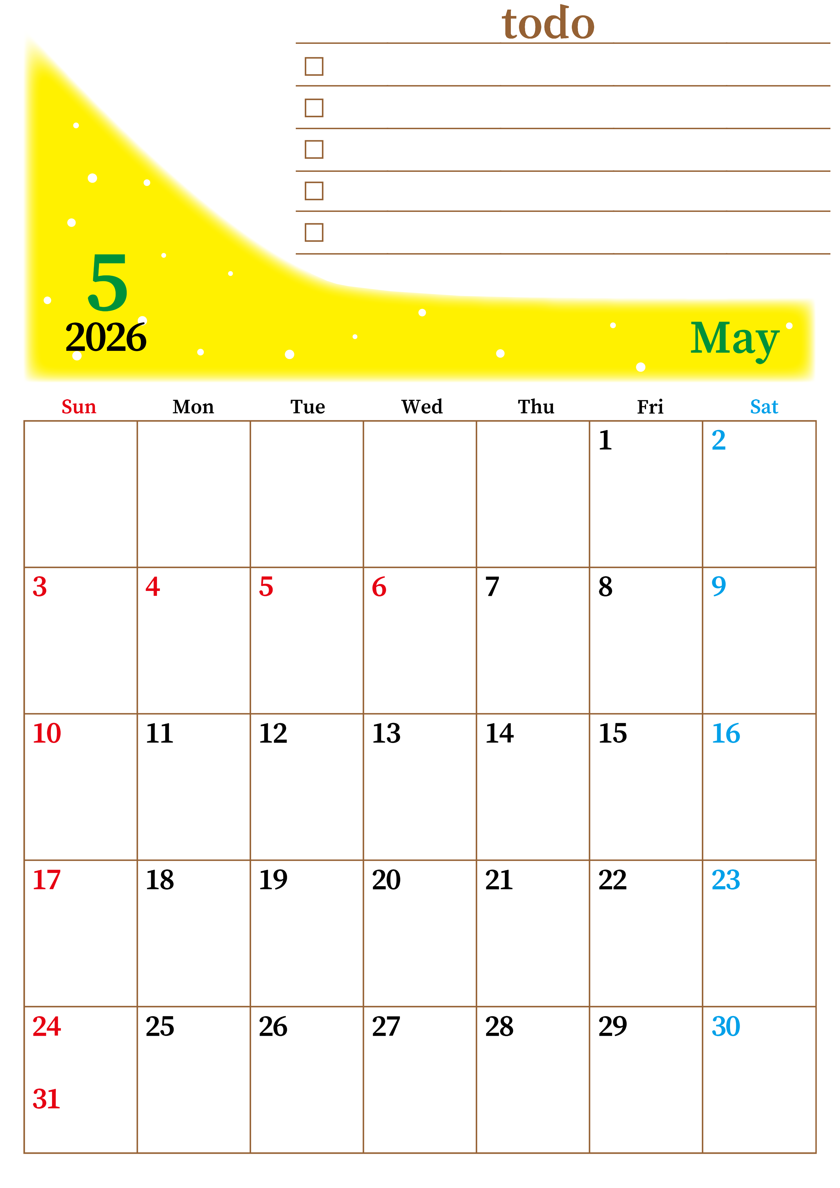 2026年・無料のカレンダーテンプレート 2026年5月カレンダーは縦型日曜始まりでToDoリストつき!毎月色違いで継続の習慣化が簡単!ダウンロード無料(2026-01410510) 素材状デザイン王 2025年4月12日 2026年5月カレンダーは縦型日曜始まりでToDoリストつきです。毎月色違いで継続の習慣化が簡単にできます。ダウンロードは無料なのでおすすめです。(2026-01410510) 5月 縦型のカレンダー 日曜始まり ToDoリスト カレンダーデザイン-0141