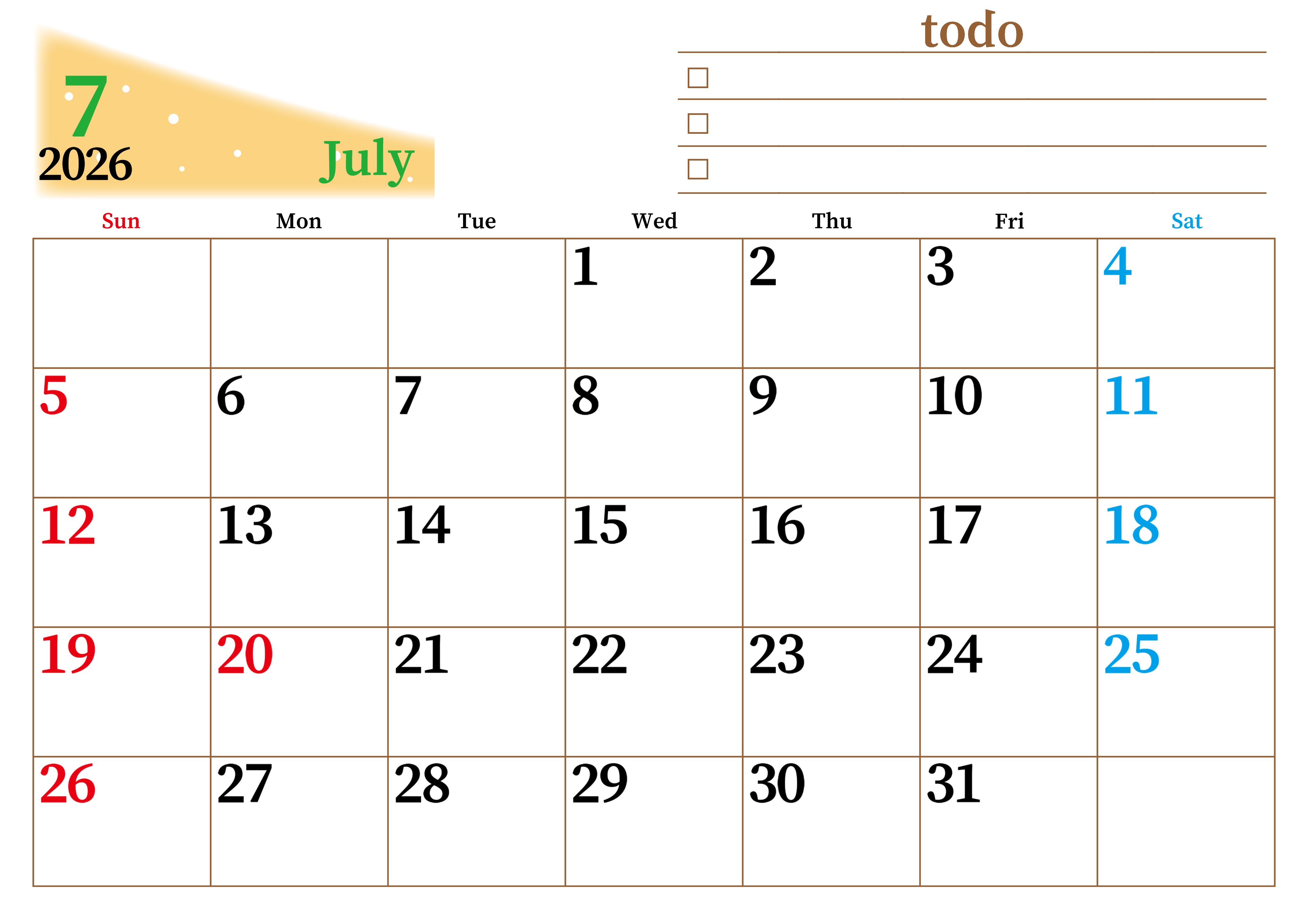 2026年・無料のカレンダーテンプレート 2026年7月カレンダーは横型日曜始まりでToDoリストつき!毎月色違いで継続の習慣化が簡単!ダウンロード無料(2026-01410700) 素材状デザイン王 2025年4月12日 2026年7月カレンダーは横型日曜始まりでToDoリストつきです。毎月色違いで継続の習慣化が簡単にできます。ダウンロードは無料なのでおすすめです。(2026-01410700) 7月 横型のカレンダー 日曜始まり ToDoリスト カレンダーデザイン-0141