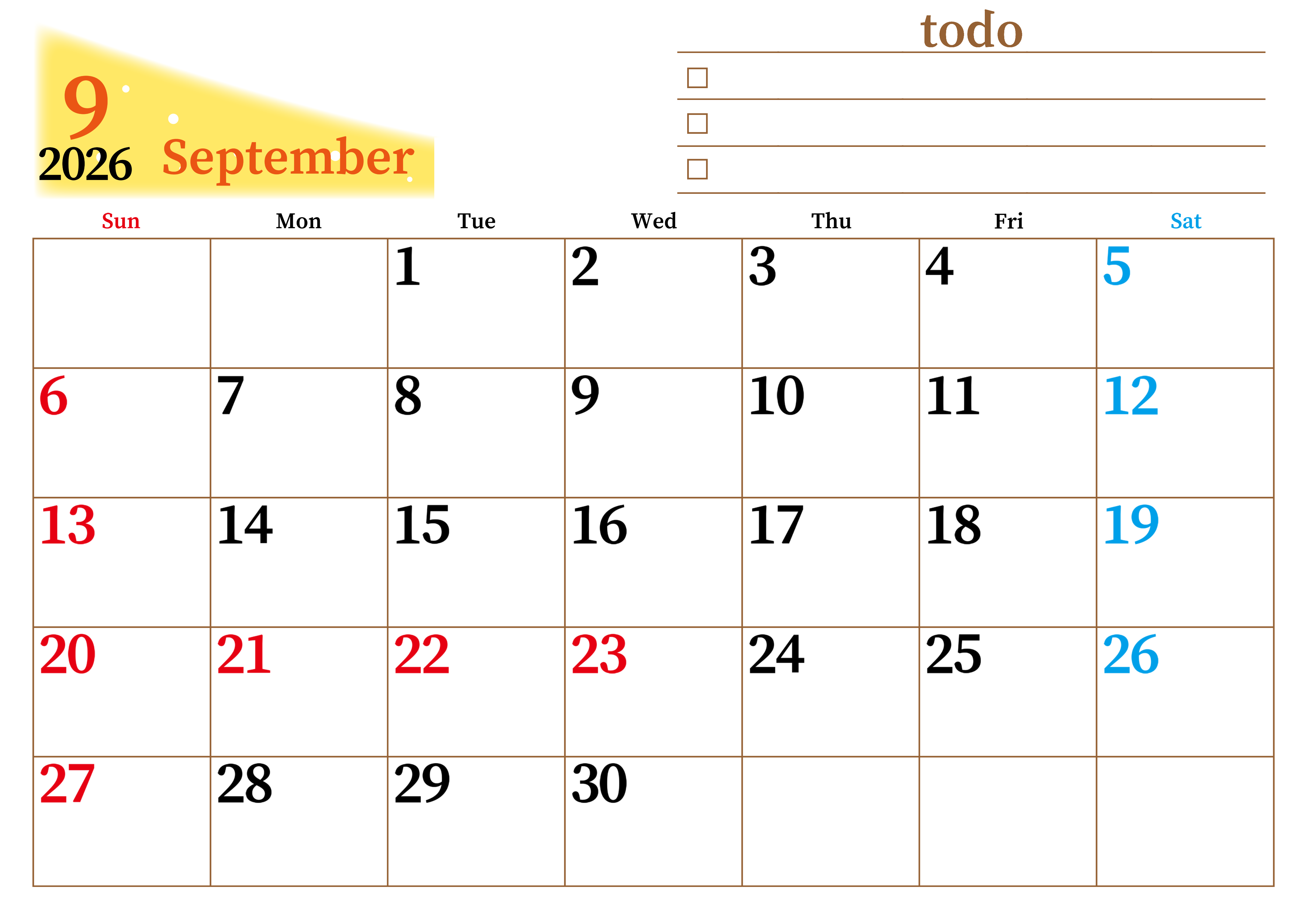 2026年・無料のカレンダーテンプレート 2026年9月カレンダーは横型日曜始まりでToDoリストつき!毎月色違いで継続の習慣化が簡単!ダウンロード無料(2026-01410900) 素材状デザイン王 2025年4月12日 2026年9月カレンダーは横型日曜始まりでToDoリストつきです。毎月色違いで継続の習慣化が簡単にできます。ダウンロードは無料なのでおすすめです。(2026-01410900) 9月 横型のカレンダー 日曜始まり ToDoリスト カレンダーデザイン-0141