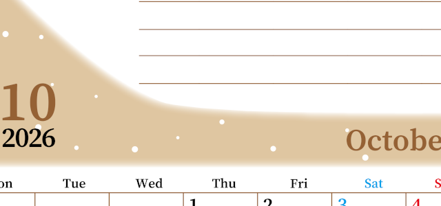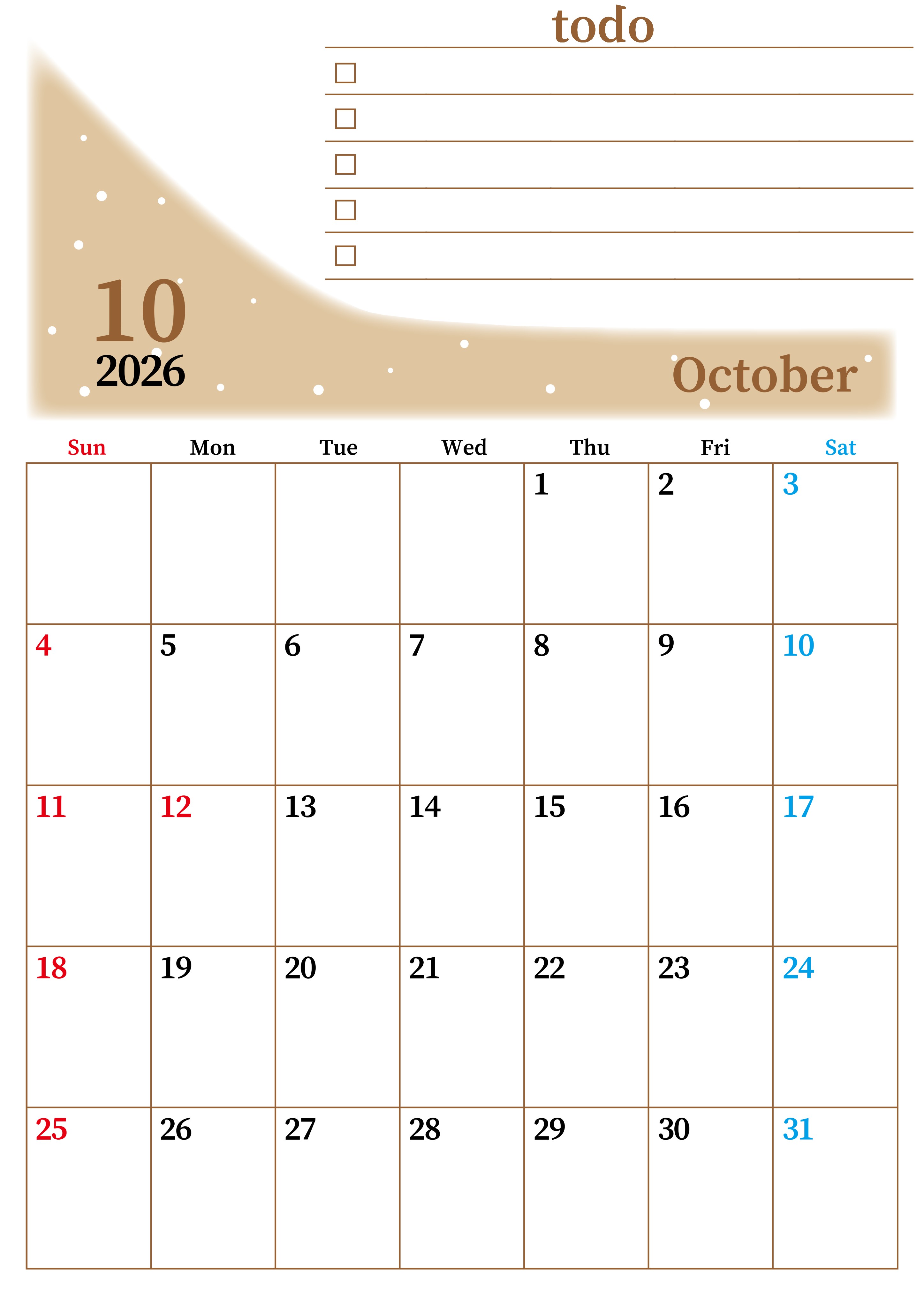 2026年10月カレンダーは縦型日曜始まりでToDoリストつきです。毎月色違いで継続の習慣化が簡単にできます。ダウンロードは無料なのでおすすめです。(2026-01411010)
