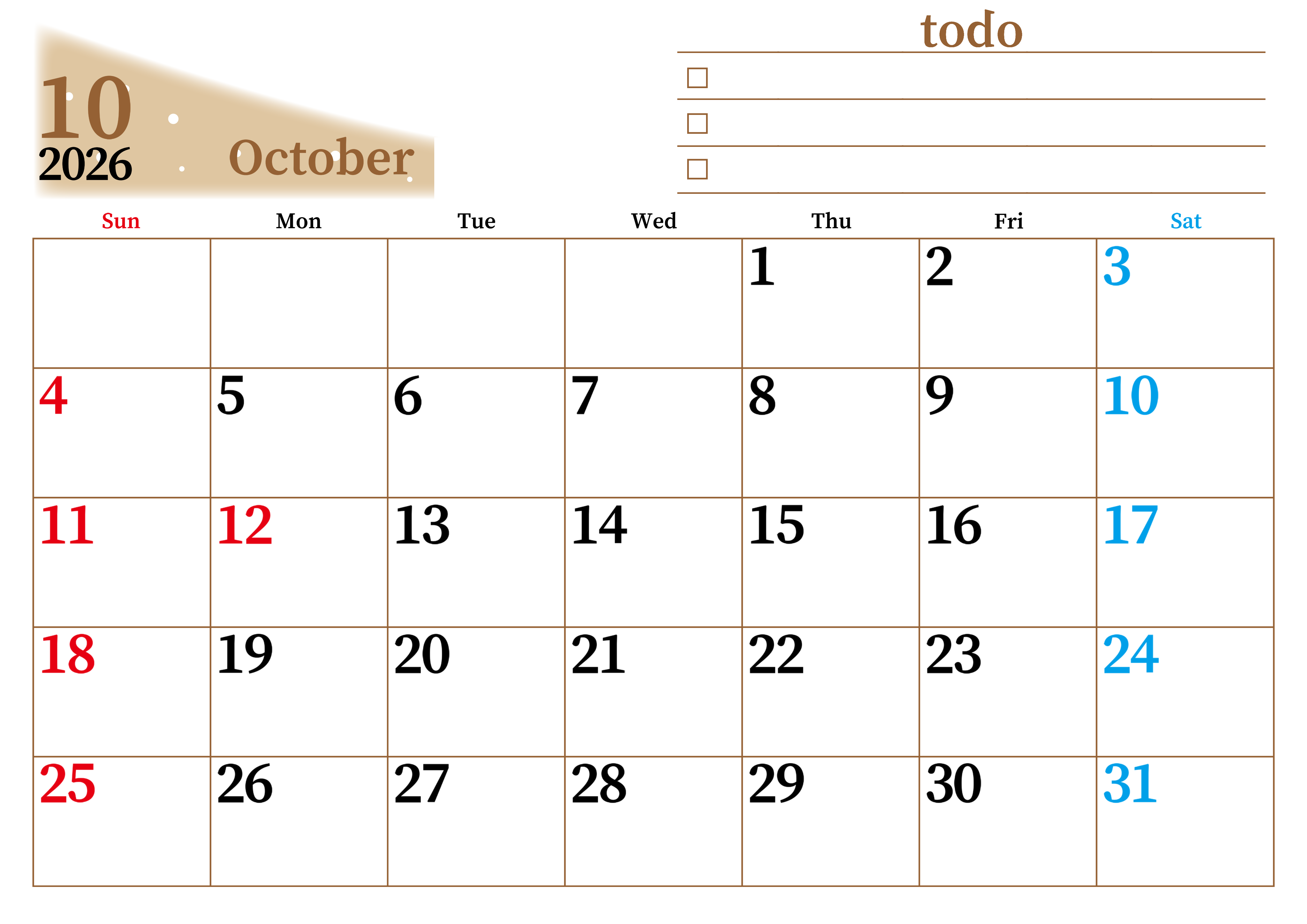 2026年・無料のカレンダーテンプレート 2026年10月カレンダーは横型日曜始まりでToDoリストつき!毎月色違いで継続の習慣化が簡単!ダウンロード無料(2026-01411000) 素材状デザイン王 2025年4月12日 2026年10月カレンダーは横型日曜始まりでToDoリストつきです。毎月色違いで継続の習慣化が簡単にできます。ダウンロードは無料なのでおすすめです。(2026-01411000) 10月 横型のカレンダー 日曜始まり ToDoリスト カレンダーデザイン-0141