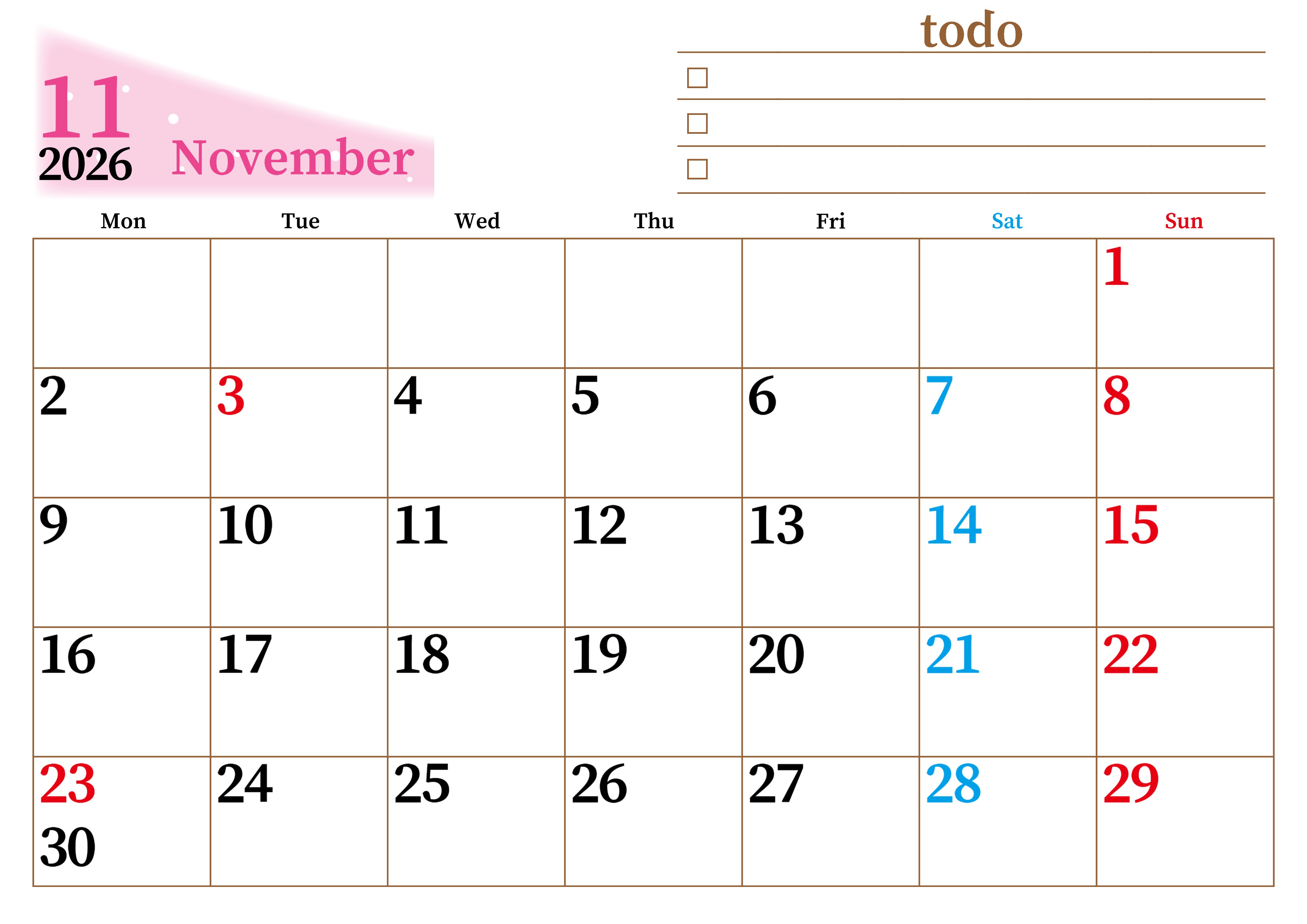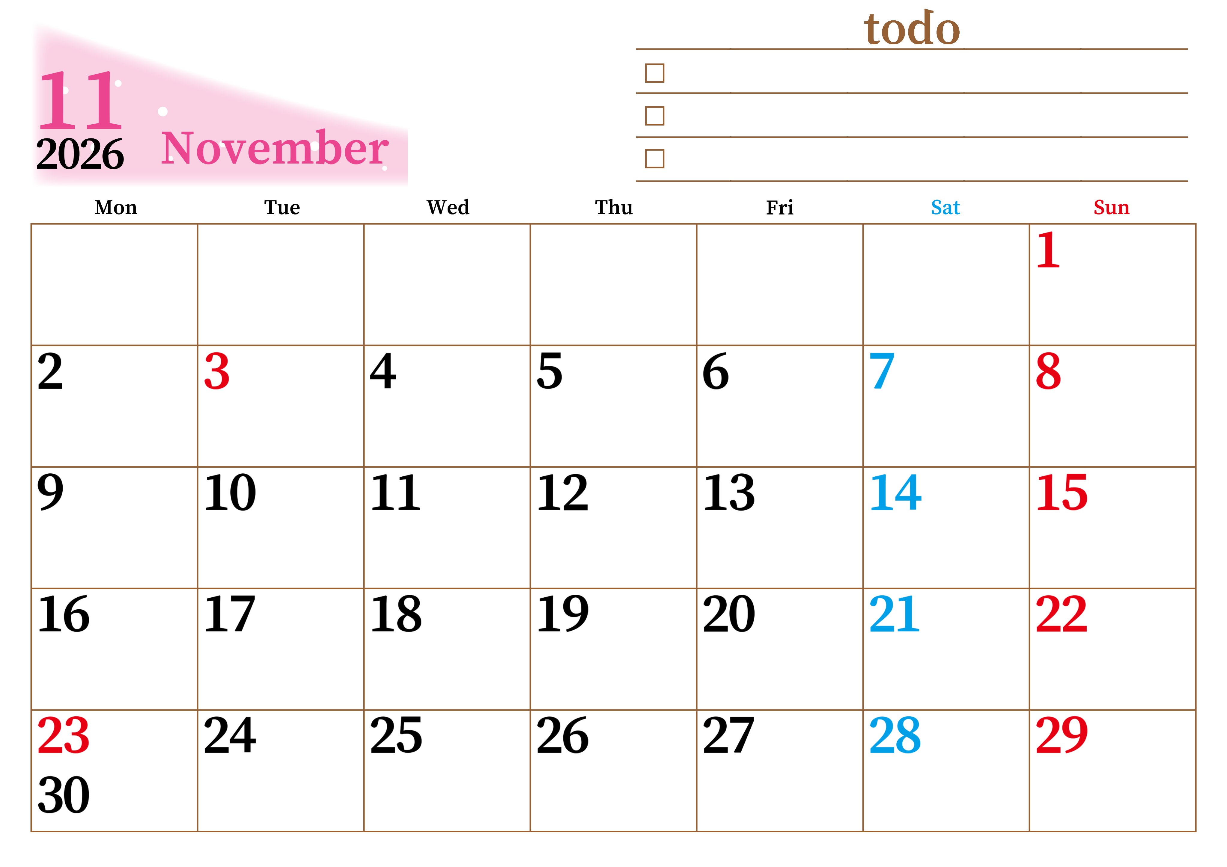 2026年・無料のカレンダーテンプレート 2026年11月カレンダーは横型月曜始まりでToDoリストつき!毎月色違いで継続の習慣化が簡単!ダウンロード無料(2026-01411101) 素材状デザイン王 2025年4月12日 2026年11月カレンダーは横型月曜始まりでToDoリストつきです。毎月色違いで継続の習慣化が簡単にできます。ダウンロードは無料なのでおすすめです。(2026-01411101) 11月 横型のカレンダー 月曜始まり ToDoリスト カレンダーデザイン-0141