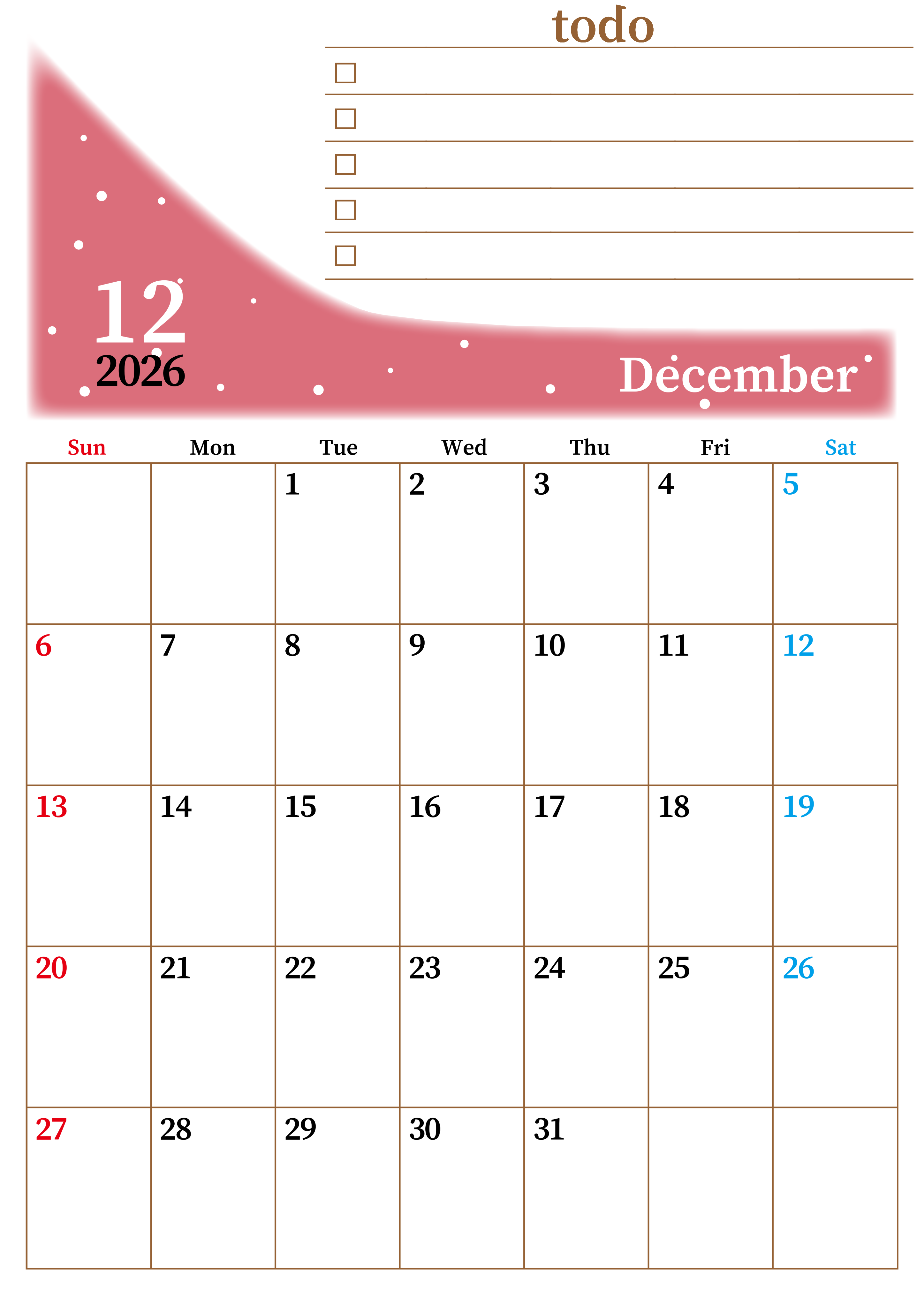 2026年・無料のカレンダーテンプレート 2026年12月カレンダーは縦型日曜始まりでToDoリストつき!毎月色違いで継続の習慣化が簡単!ダウンロード無料(2026-01411210) 素材状デザイン王 2025年4月12日 2026年12月カレンダーは縦型日曜始まりでToDoリストつきです。毎月色違いで継続の習慣化が簡単にできます。ダウンロードは無料なのでおすすめです。(2026-01411210) 12月 縦型のカレンダー 日曜始まり ToDoリスト カレンダーデザイン-0141