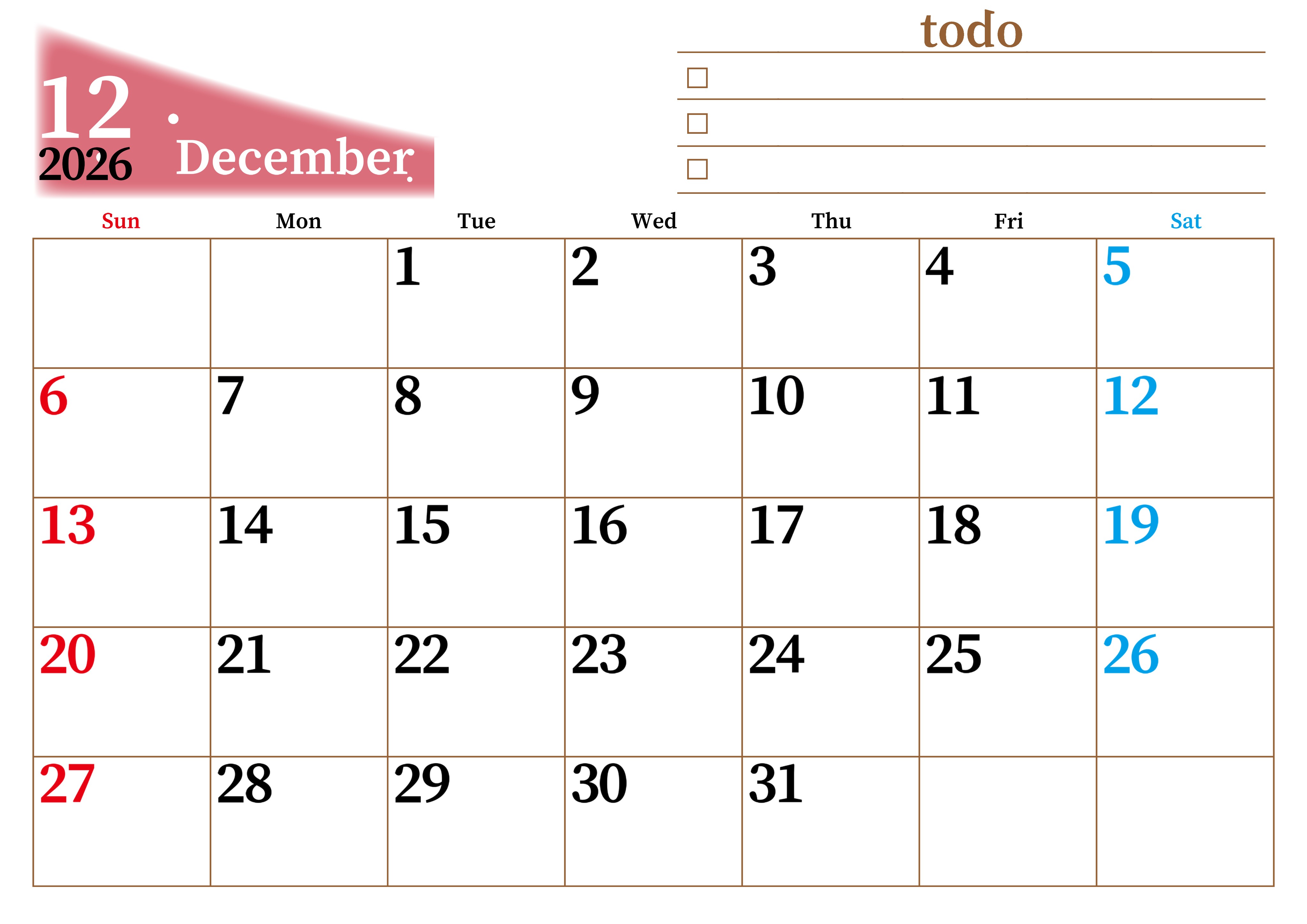 2026年・無料のカレンダーテンプレート 2026年12月カレンダーは横型日曜始まりでToDoリストつき!毎月色違いで継続の習慣化が簡単!ダウンロード無料(2026-01411200) 素材状デザイン王 2025年4月12日 2026年12月カレンダーは横型日曜始まりでToDoリストつきです。毎月色違いで継続の習慣化が簡単にできます。ダウンロードは無料なのでおすすめです。(2026-01411200) 12月 横型のカレンダー 日曜始まり ToDoリスト カレンダーデザイン-0141