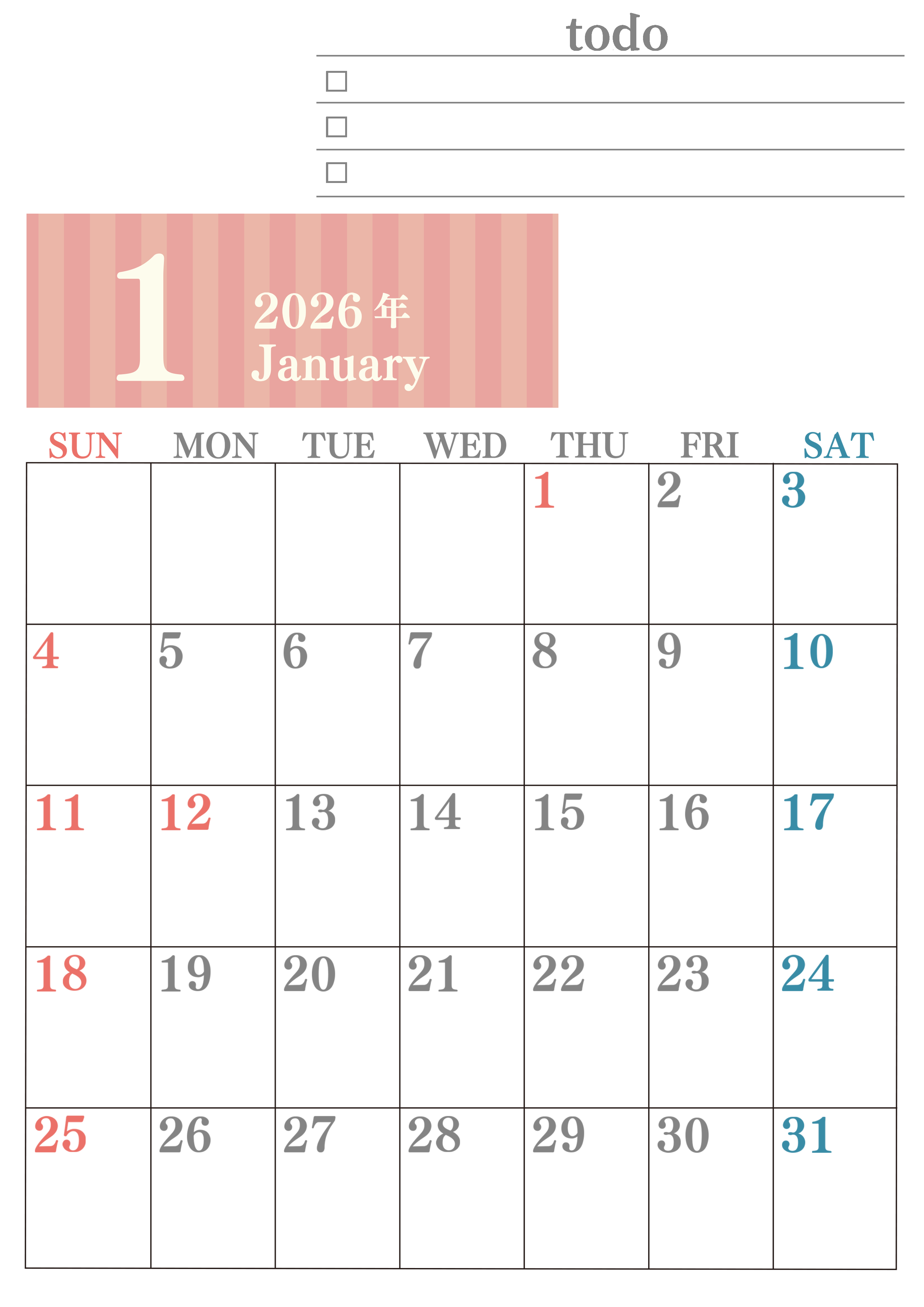 2026年・無料のカレンダーテンプレート 2026年1月カレンダーは縦型日曜始まりで使いやすい!勉強の計画におすすめのToDoリストつき:無料(2026-01420110) 素材状デザイン王 2025年4月12日 2026年1月カレンダーは縦型日曜始まりで使いやすいです。勉強の計画におすすめのToDoリストつきなので受験や資格取得のモチベになります。無料でダウンロードを気軽に行えます。(2026-01420110) 1月 縦型のカレンダー 日曜始まり ToDoリスト カレンダーデザイン-0142
