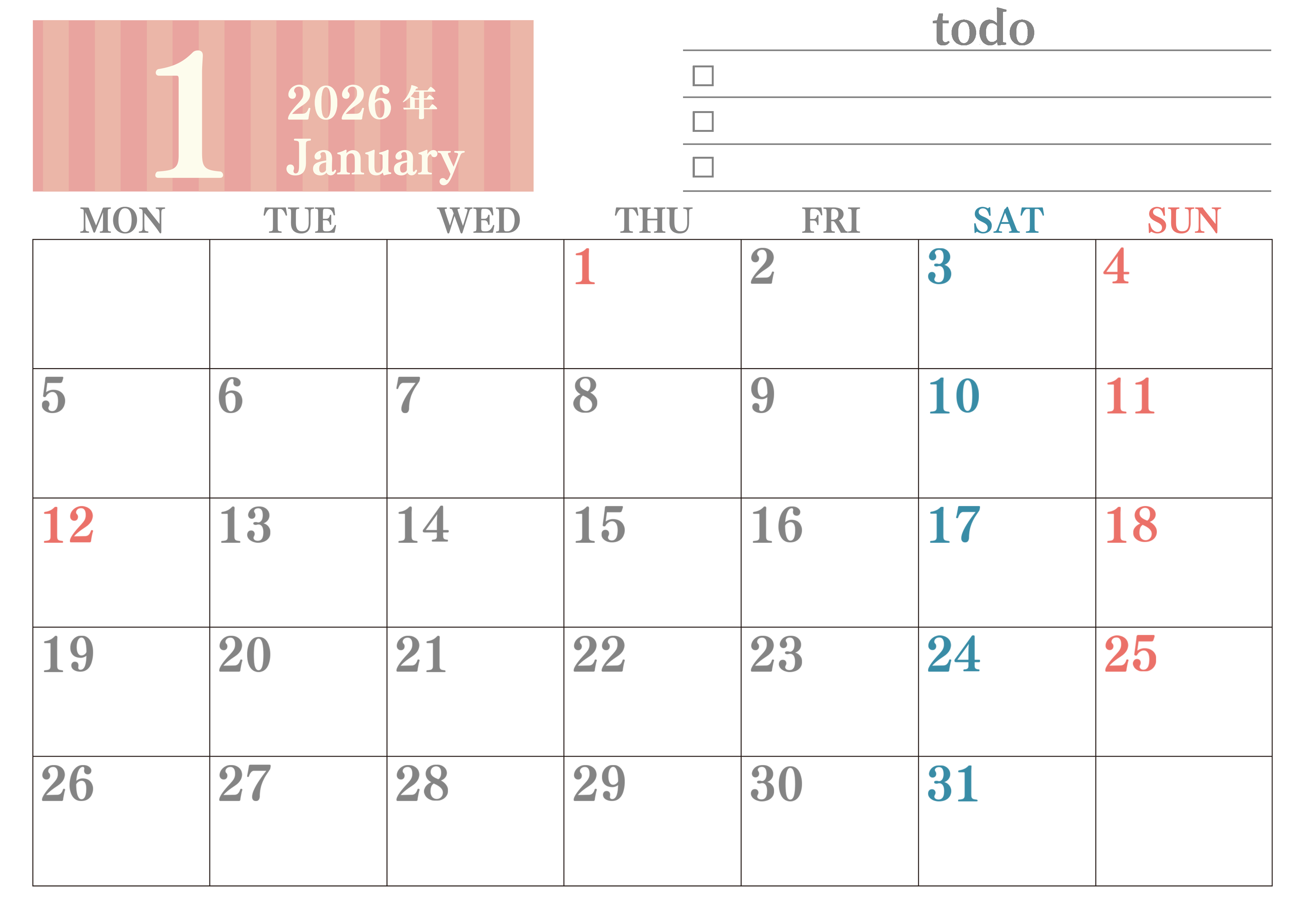 2026年1月カレンダーは横型月曜始まりで使いやすいです。勉強の計画におすすめのToDoリストつきなので受験や資格取得のモチベになります。無料でダウンロードを気軽に行えます。(2026-01420101)