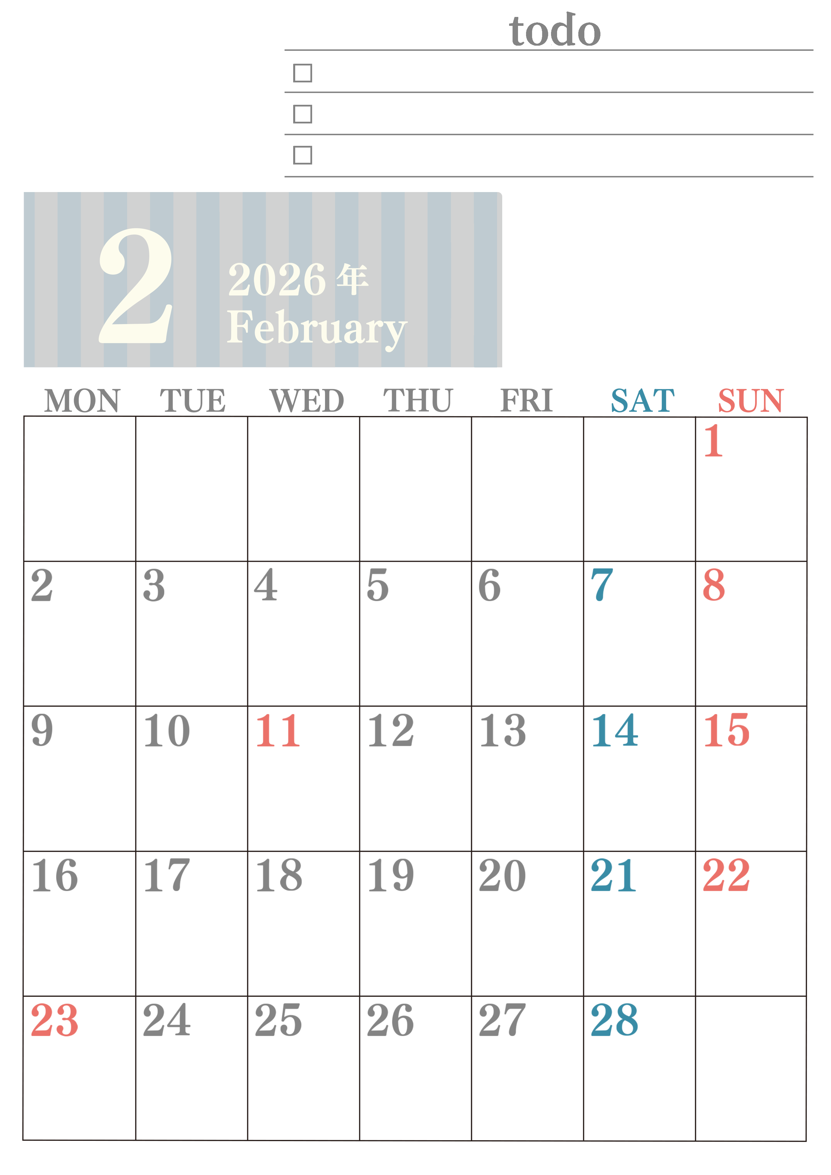 2026年・無料のカレンダーテンプレート 2026年2月カレンダーは縦型月曜始まりで使いやすい!勉強の計画におすすめのToDoリストつき:無料(2026-01420211) 素材状デザイン王 2025年4月12日 2026年2月カレンダーは縦型月曜始まりで使いやすいです。勉強の計画におすすめのToDoリストつきなので受験や資格取得のモチベになります。無料でダウンロードを気軽に行えます。(2026-01420211) 2月 縦型のカレンダー 月曜始まり ToDoリスト カレンダーデザイン-0142