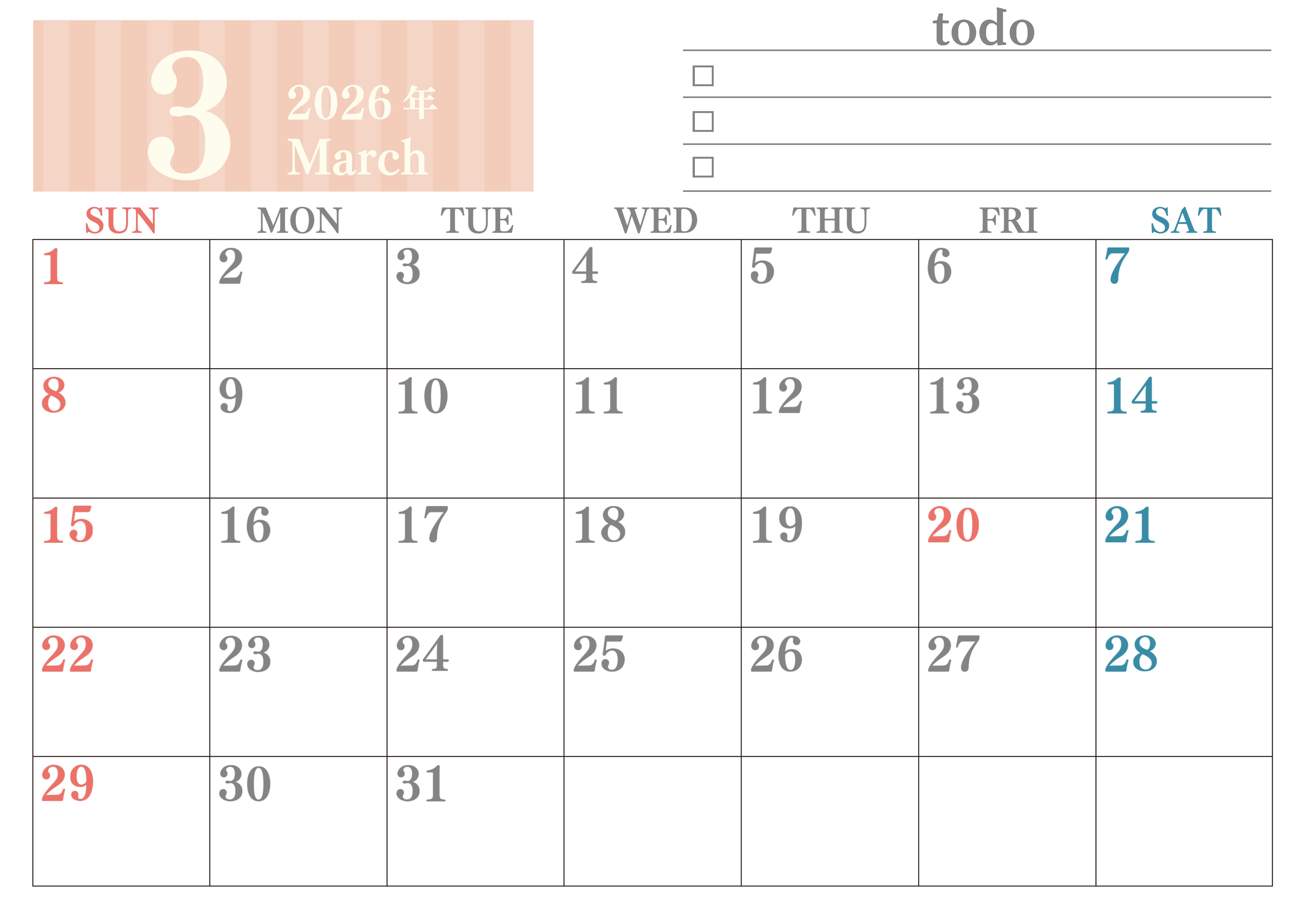 2026年3月カレンダーは横型日曜始まりで使いやすいです。勉強の計画におすすめのToDoリストつきなので受験や資格取得のモチベになります。無料でダウンロードを気軽に行えます。(2026-01420300)