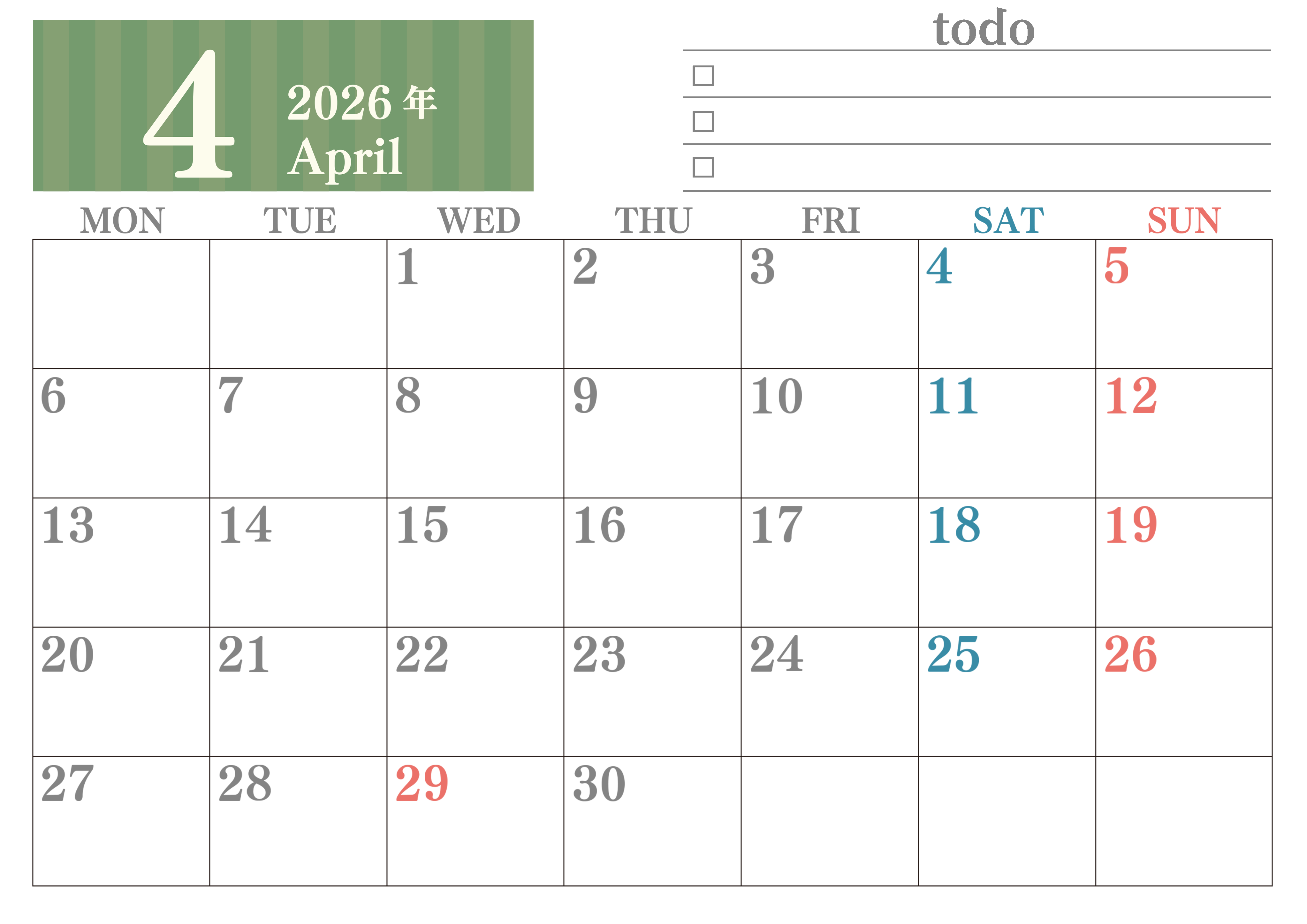 2026年・無料のカレンダーテンプレート 2026年4月カレンダーは横型月曜始まりで使いやすい!勉強の計画におすすめのToDoリストつき:無料(2026-01420401) 素材状デザイン王 2025年4月12日 2026年4月カレンダーは横型月曜始まりで使いやすいです。勉強の計画におすすめのToDoリストつきなので受験や資格取得のモチベになります。無料でダウンロードを気軽に行えます。(2026-01420401) 4月 横型のカレンダー 月曜始まり ToDoリスト カレンダーデザイン-0142