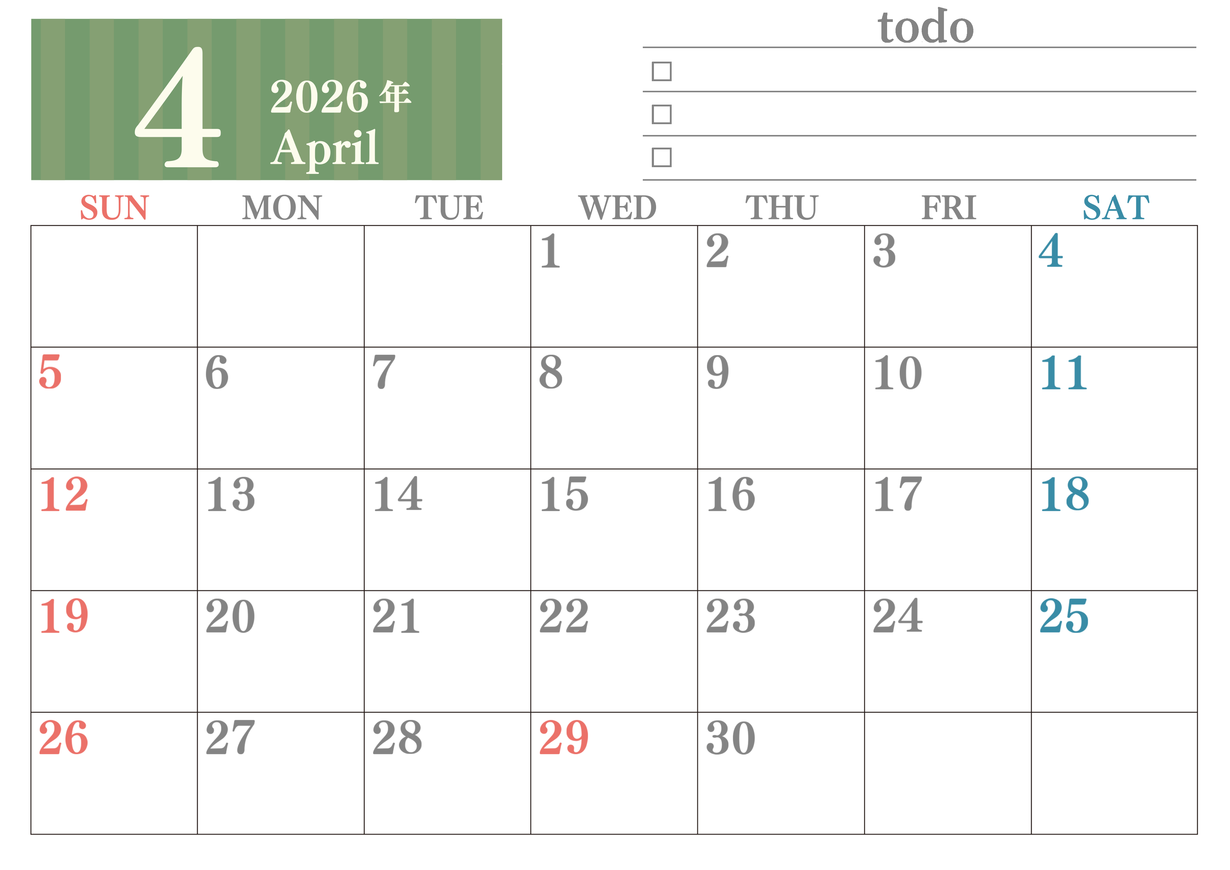 2026年4月カレンダーは横型日曜始まりで使いやすいです。勉強の計画におすすめのToDoリストつきなので受験や資格取得のモチベになります。無料でダウンロードを気軽に行えます。(2026-01420400)