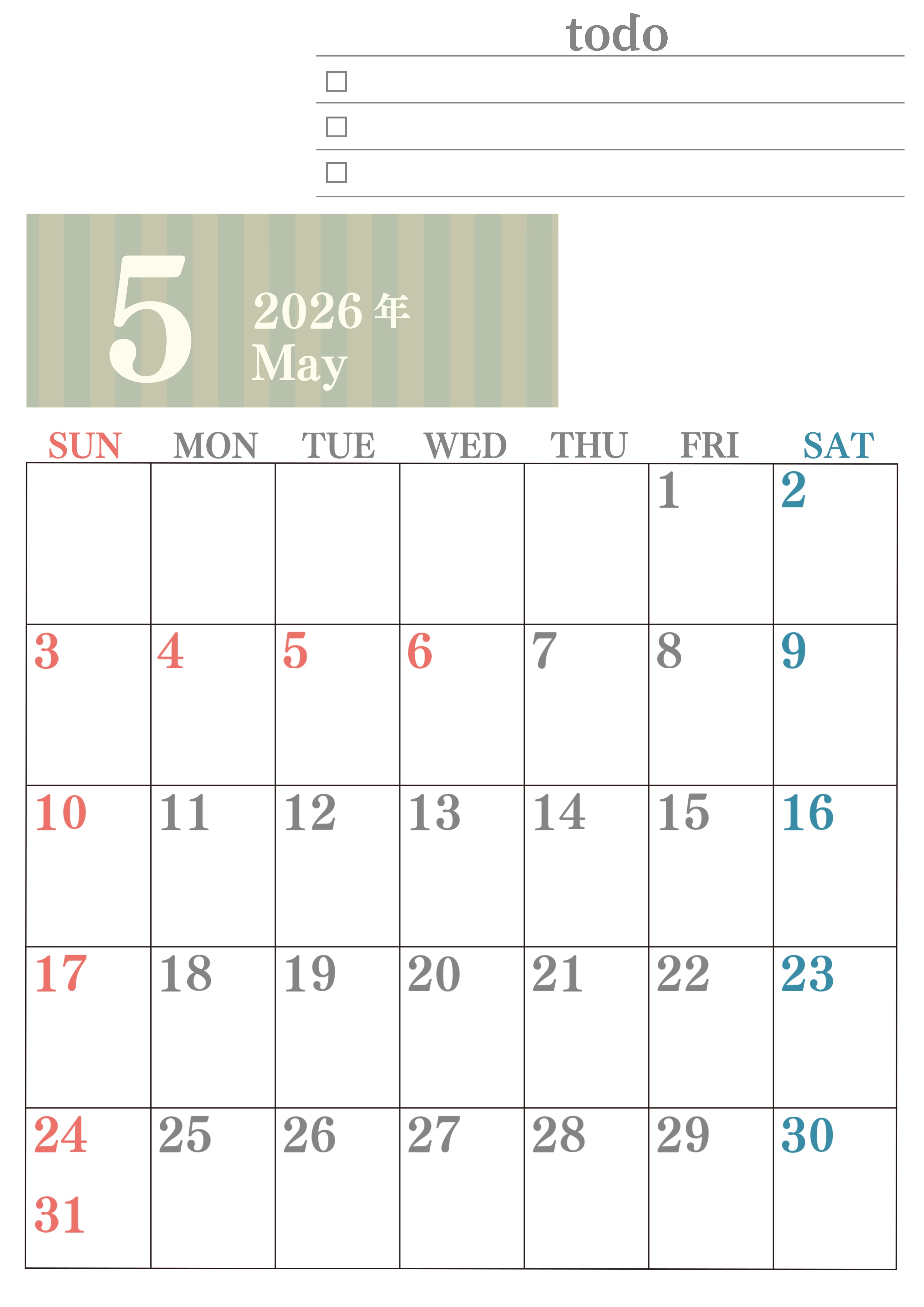 2026年・無料のカレンダーテンプレート 2026年5月カレンダーは縦型日曜始まりで使いやすい!勉強の計画におすすめのToDoリストつき:無料(2026-01420510) 素材状デザイン王 2025年4月12日 2026年5月カレンダーは縦型日曜始まりで使いやすいです。勉強の計画におすすめのToDoリストつきなので受験や資格取得のモチベになります。無料でダウンロードを気軽に行えます。(2026-01420510) 5月 縦型のカレンダー 日曜始まり ToDoリスト カレンダーデザイン-0142
