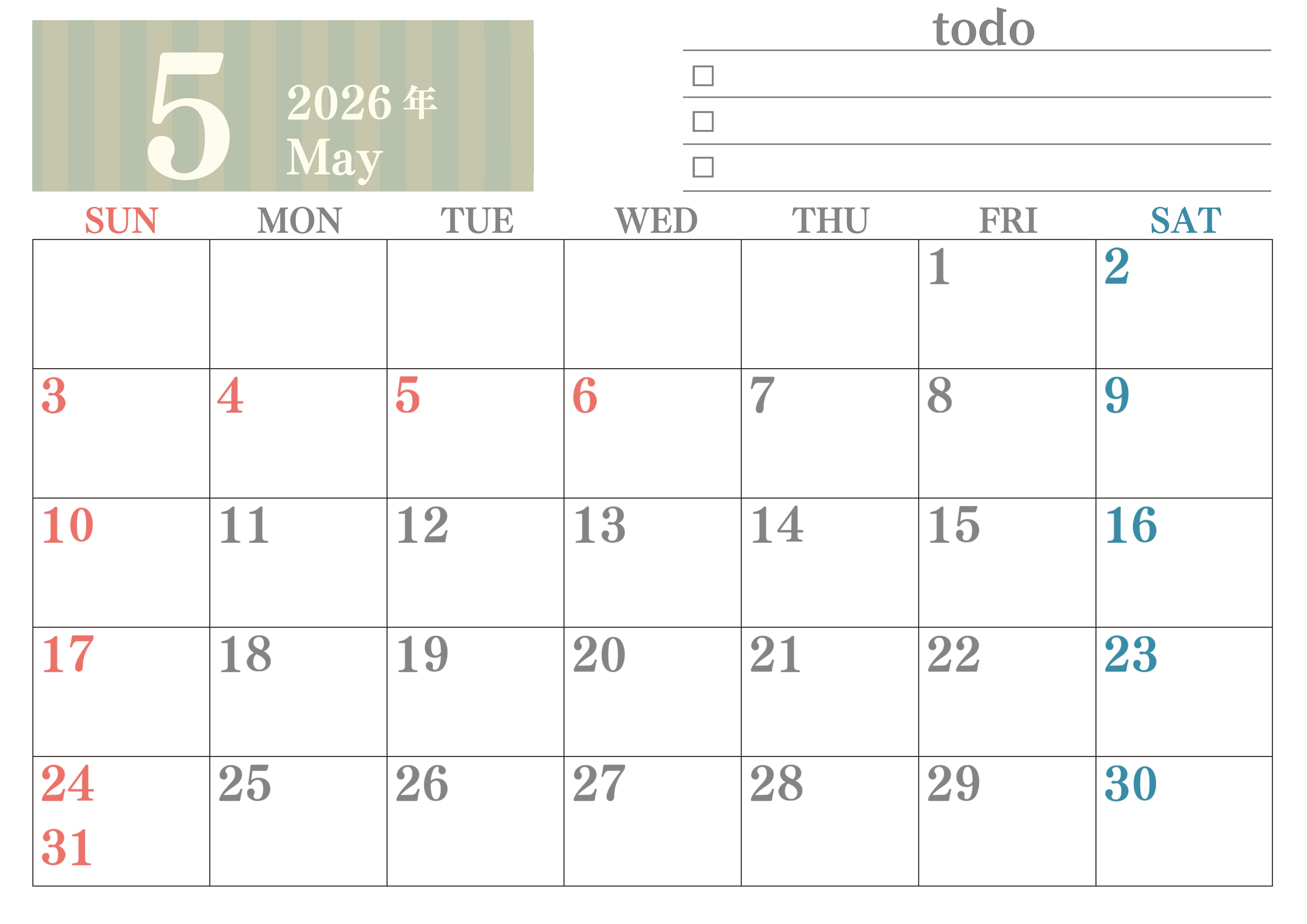 2026年・無料のカレンダーテンプレート 2026年5月カレンダーは横型日曜始まりで使いやすい!勉強の計画におすすめのToDoリストつき:無料(2026-01420500) 素材状デザイン王 2025年4月12日 2026年5月カレンダーは横型日曜始まりで使いやすいです。勉強の計画におすすめのToDoリストつきなので受験や資格取得のモチベになります。無料でダウンロードを気軽に行えます。(2026-01420500) 5月 横型のカレンダー 日曜始まり ToDoリスト カレンダーデザイン-0142