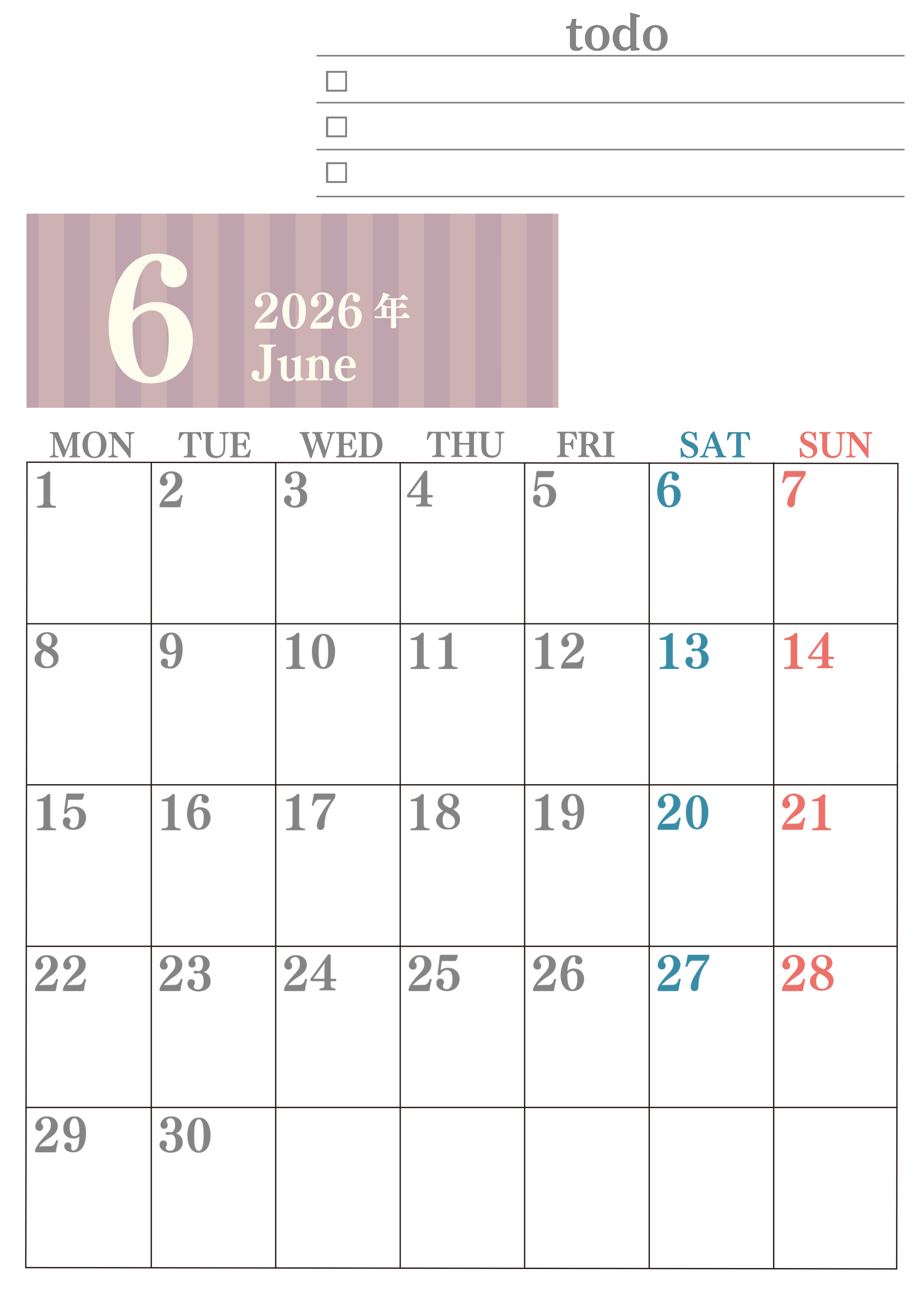 2026年・無料のカレンダーテンプレート 2026年6月カレンダーは縦型月曜始まりで使いやすい!勉強の計画におすすめのToDoリストつき:無料(2026-01420611) 素材状デザイン王 2025年4月12日 2026年6月カレンダーは縦型月曜始まりで使いやすいです。勉強の計画におすすめのToDoリストつきなので受験や資格取得のモチベになります。無料でダウンロードを気軽に行えます。(2026-01420611) 6月 縦型のカレンダー 月曜始まり ToDoリスト カレンダーデザイン-0142