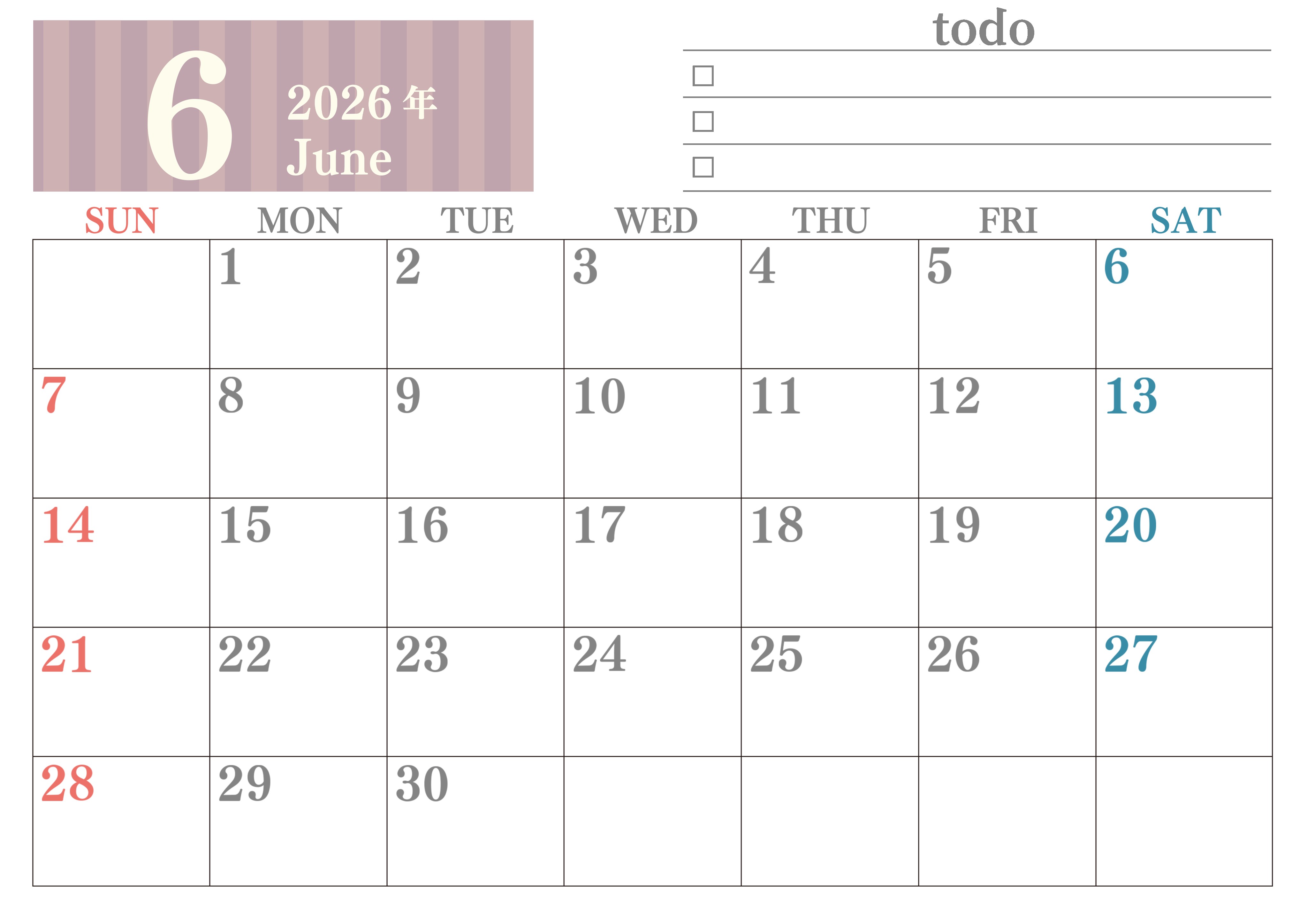 2026年・無料のカレンダーテンプレート 2026年6月カレンダーは横型日曜始まりで使いやすい!勉強の計画におすすめのToDoリストつき:無料(2026-01420600) 素材状デザイン王 2025年4月12日 2026年6月カレンダーは横型日曜始まりで使いやすいです。勉強の計画におすすめのToDoリストつきなので受験や資格取得のモチベになります。無料でダウンロードを気軽に行えます。(2026-01420600) 6月 横型のカレンダー 日曜始まり ToDoリスト カレンダーデザイン-0142
