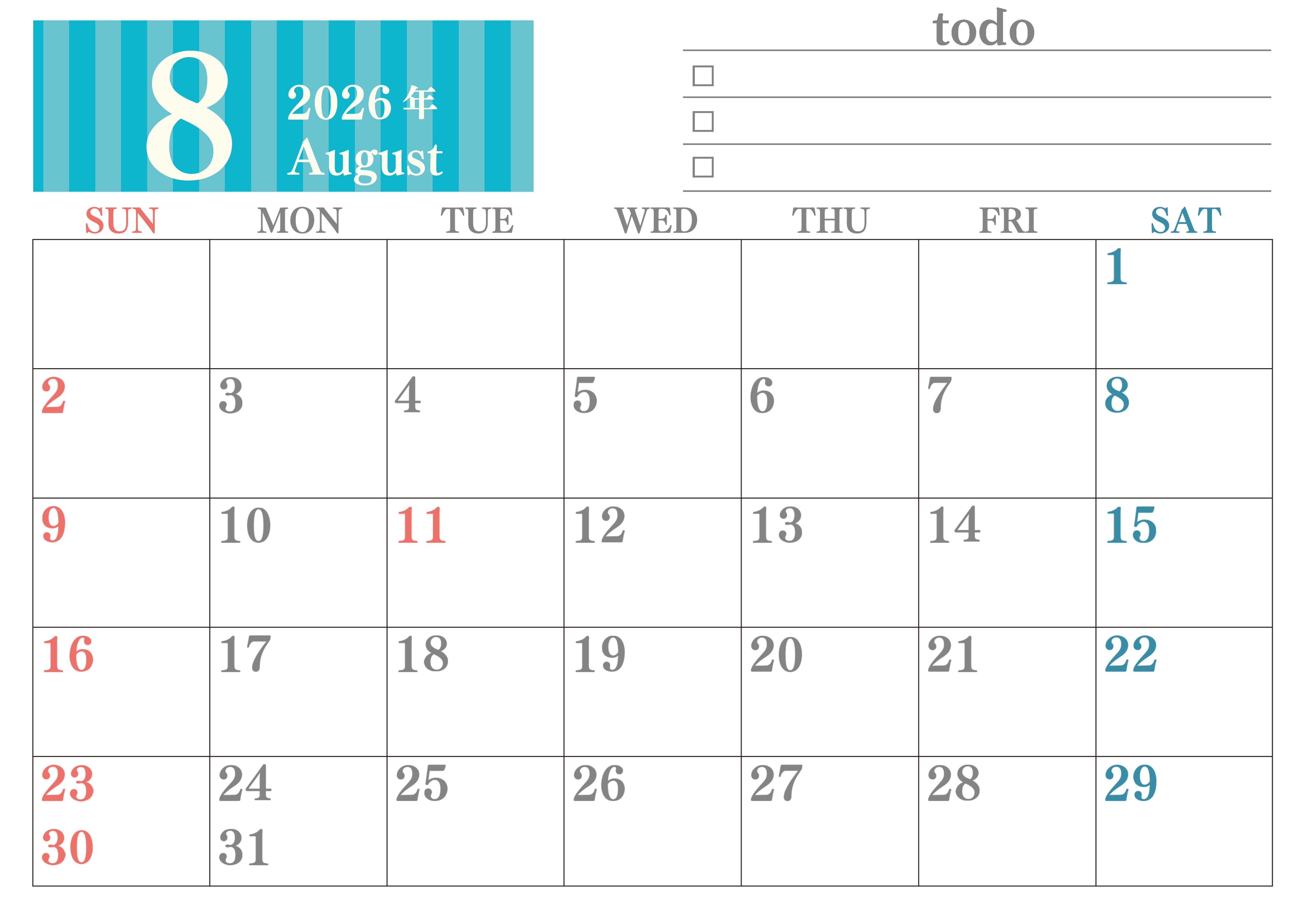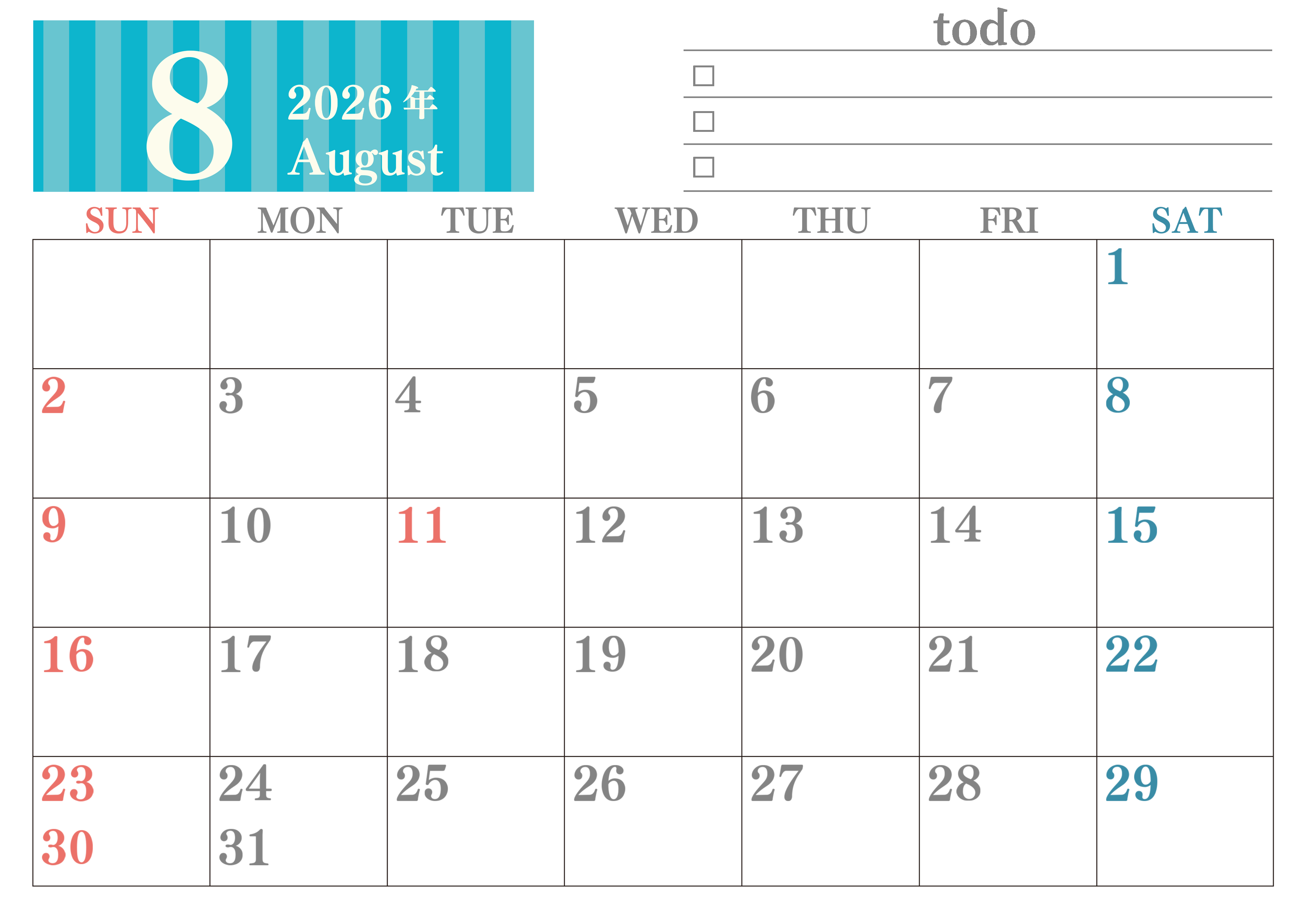 2026年8月カレンダーは横型日曜始まりで使いやすいです。勉強の計画におすすめのToDoリストつきなので受験や資格取得のモチベになります。無料でダウンロードを気軽に行えます。(2026-01420800)