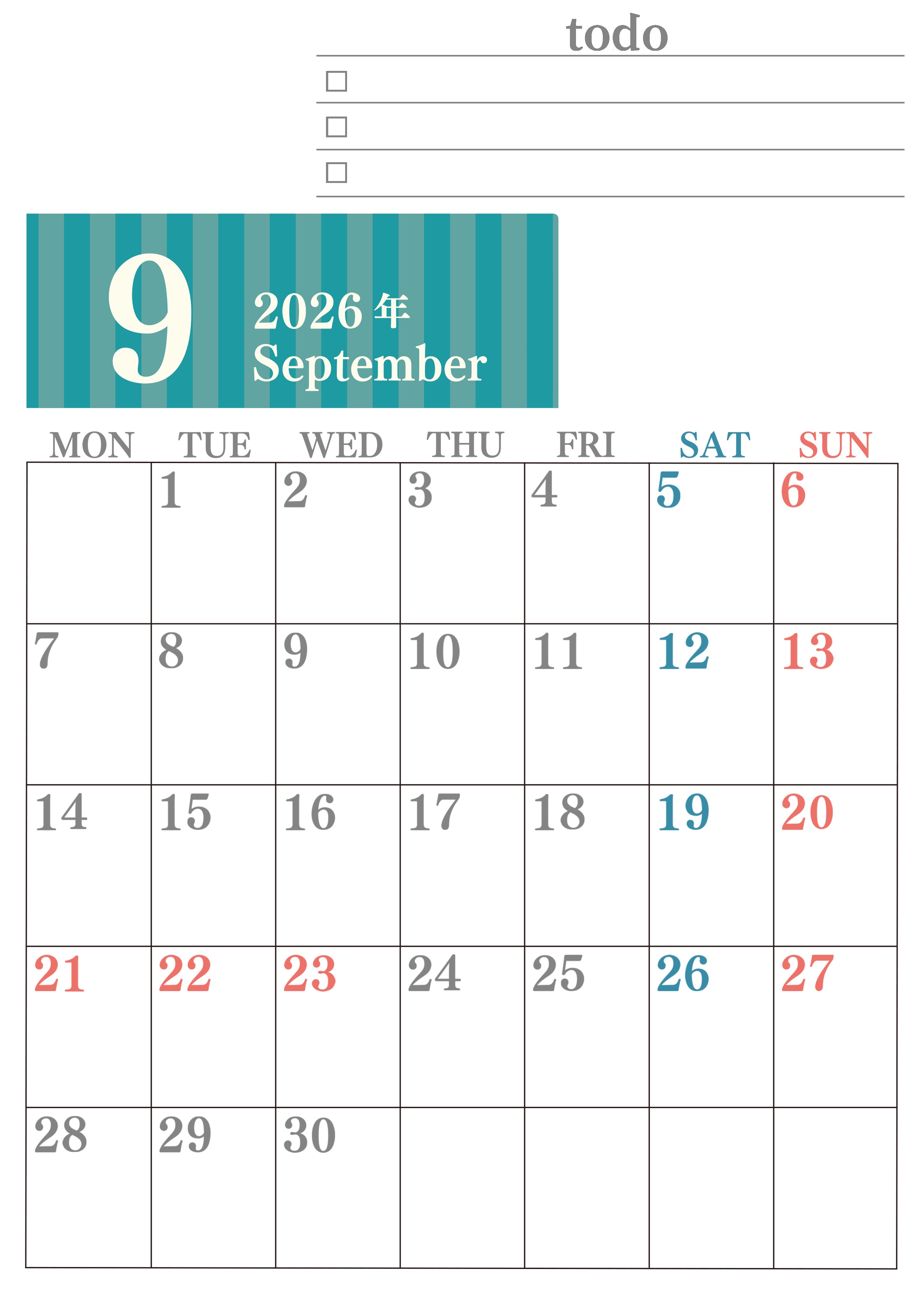 2026年・無料のカレンダーテンプレート 2026年9月カレンダーは縦型月曜始まりで使いやすい!勉強の計画におすすめのToDoリストつき:無料(2026-01420911) 素材状デザイン王 2025年4月12日 2026年9月カレンダーは縦型月曜始まりで使いやすいです。勉強の計画におすすめのToDoリストつきなので受験や資格取得のモチベになります。無料でダウンロードを気軽に行えます。(2026-01420911) 9月 縦型のカレンダー 月曜始まり ToDoリスト カレンダーデザイン-0142