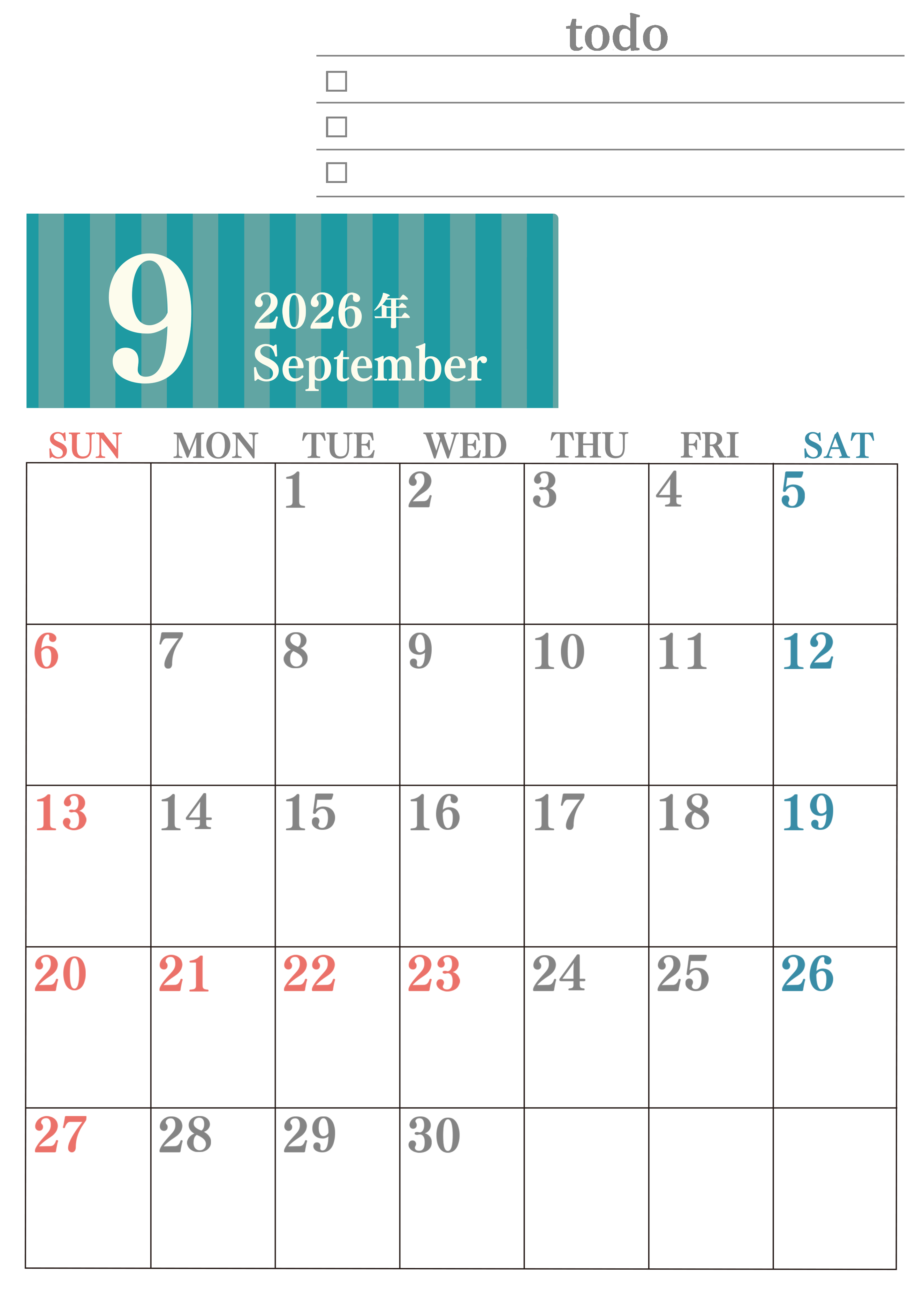 2026年・無料のカレンダーテンプレート 2026年9月カレンダーは縦型日曜始まりで使いやすい!勉強の計画におすすめのToDoリストつき:無料(2026-01420910) 素材状デザイン王 2025年4月12日 2026年9月カレンダーは縦型日曜始まりで使いやすいです。勉強の計画におすすめのToDoリストつきなので受験や資格取得のモチベになります。無料でダウンロードを気軽に行えます。(2026-01420910) 9月 縦型のカレンダー 日曜始まり ToDoリスト カレンダーデザイン-0142