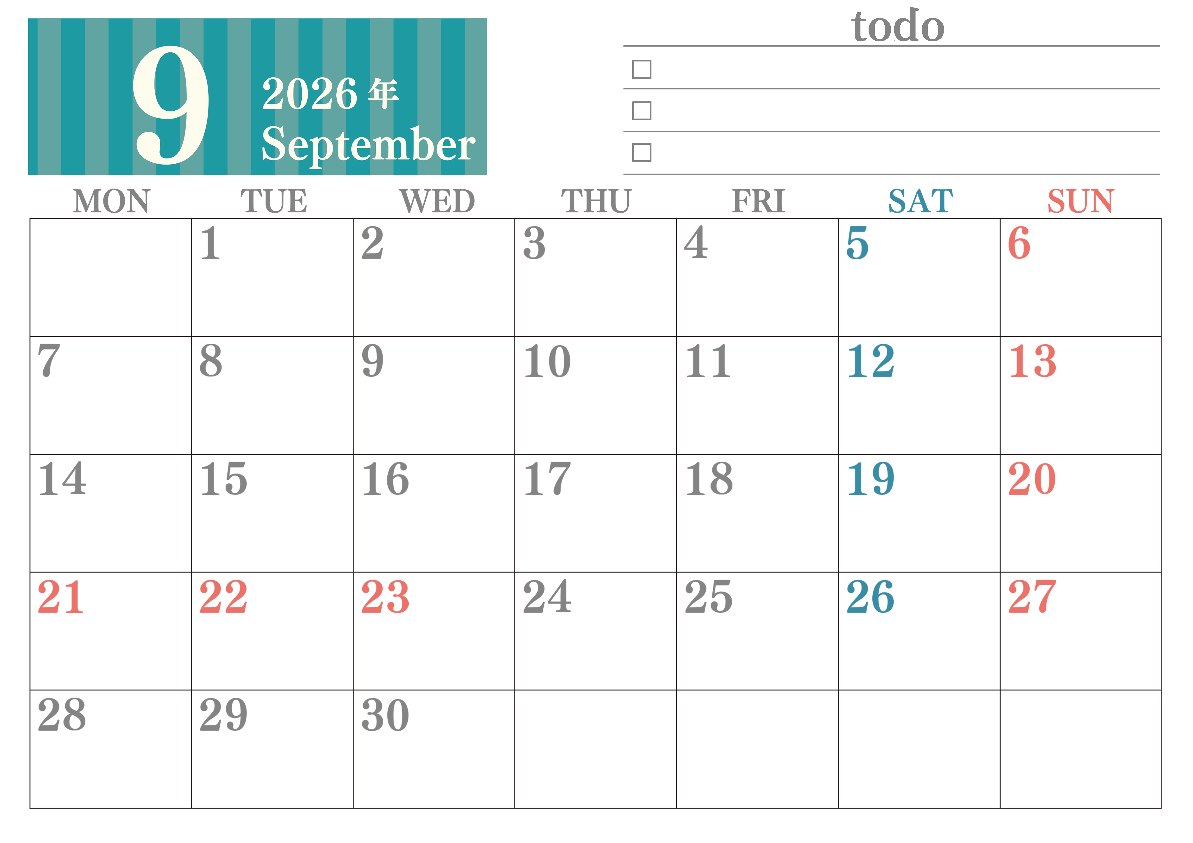 2026年9月カレンダーは横型月曜始まりで使いやすいです。勉強の計画におすすめのToDoリストつきなので受験や資格取得のモチベになります。無料でダウンロードを気軽に行えます。(2026-01420901)