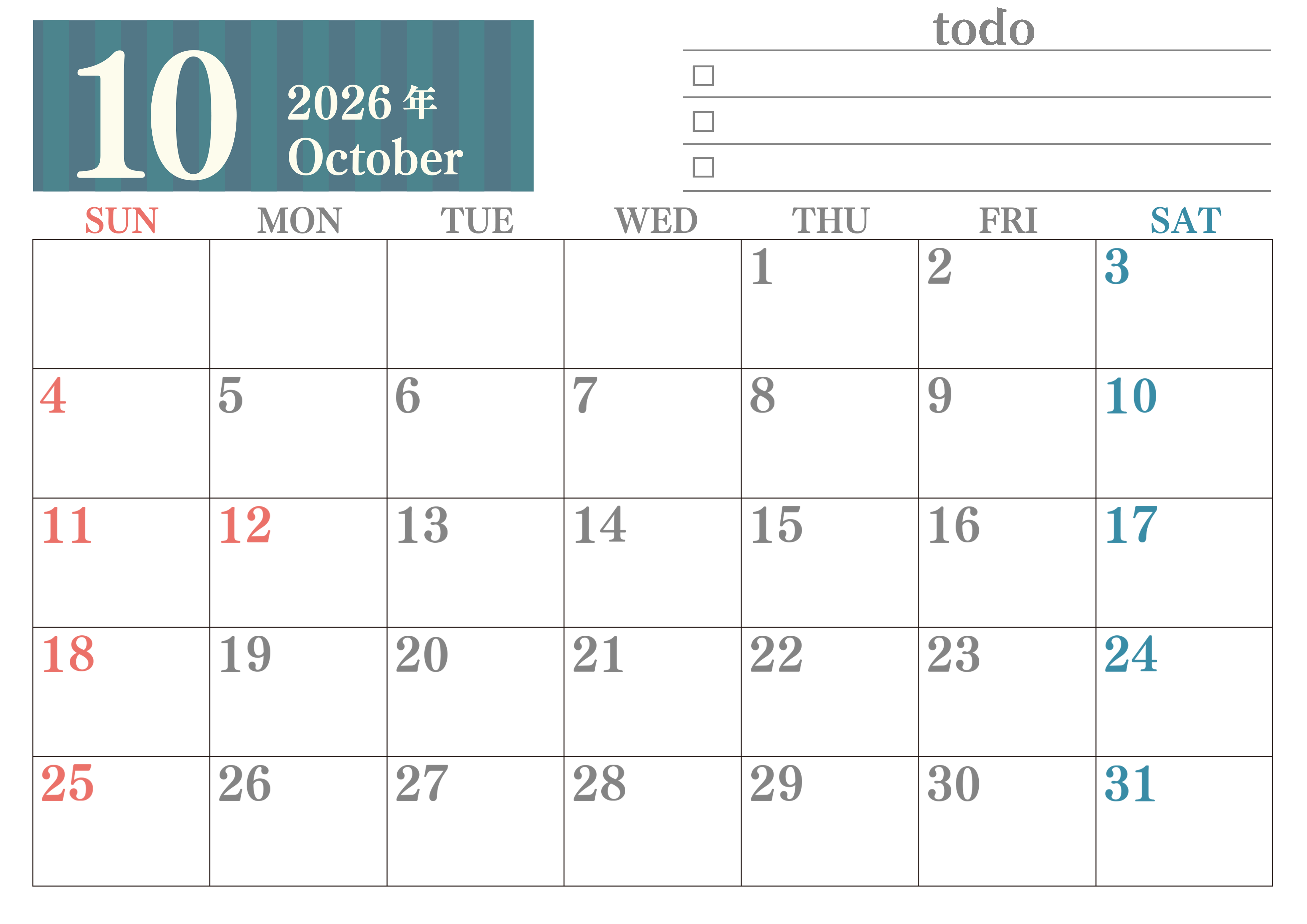 2026年・無料のカレンダーテンプレート 2026年10月カレンダーは横型日曜始まりで使いやすい!勉強の計画におすすめのToDoリストつき:無料(2026-01421000) 素材状デザイン王 2025年4月12日 2026年10月カレンダーは横型日曜始まりで使いやすいです。勉強の計画におすすめのToDoリストつきなので受験や資格取得のモチベになります。無料でダウンロードを気軽に行えます。(2026-01421000) 10月 横型のカレンダー 日曜始まり ToDoリスト カレンダーデザイン-0142