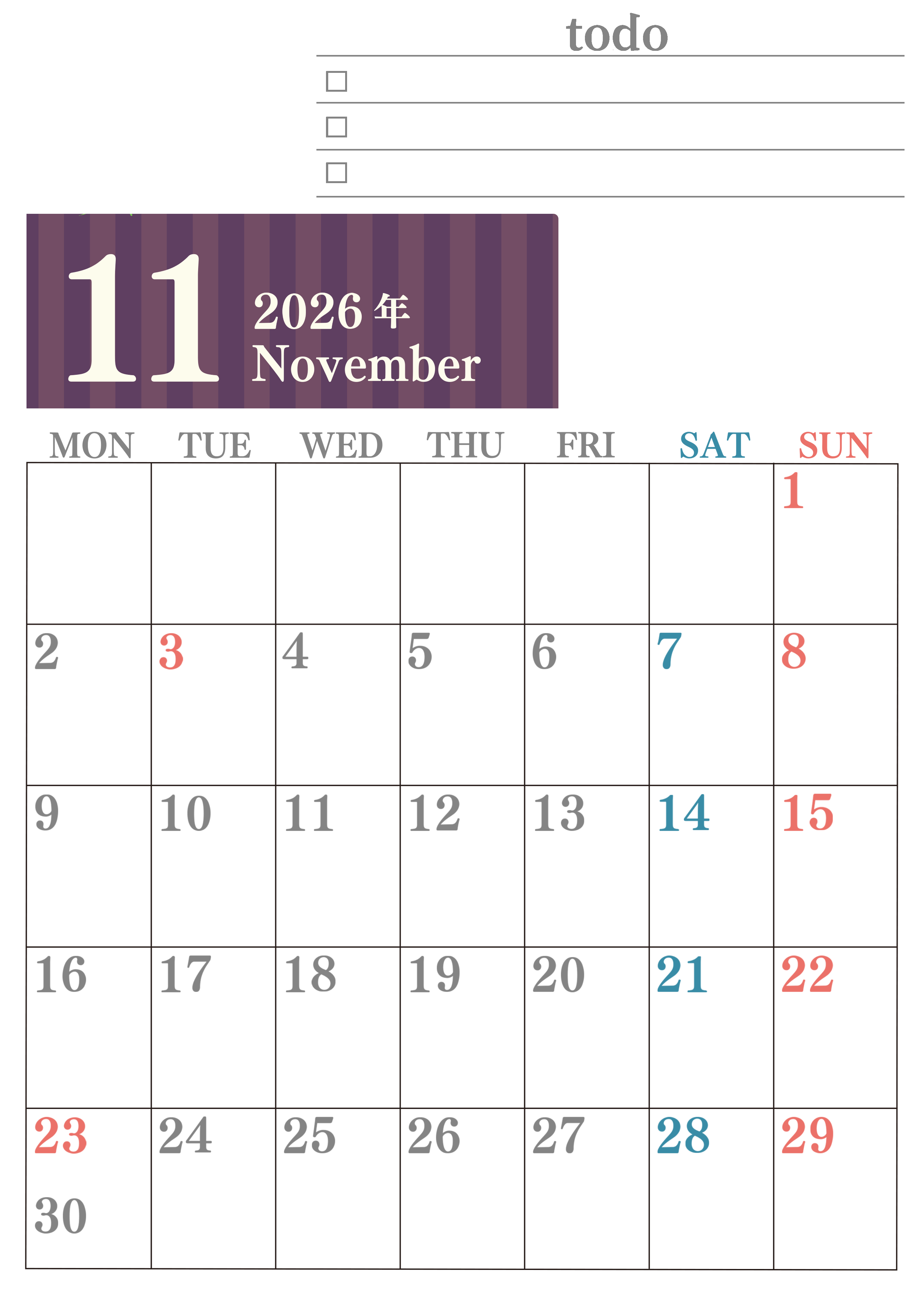 2026年・無料のカレンダーテンプレート 2026年11月カレンダーは縦型月曜始まりで使いやすい!勉強の計画におすすめのToDoリストつき:無料(2026-01421111) 素材状デザイン王 2025年4月12日 2026年11月カレンダーは縦型月曜始まりで使いやすいです。勉強の計画におすすめのToDoリストつきなので受験や資格取得のモチベになります。無料でダウンロードを気軽に行えます。(2026-01421111) 11月 縦型のカレンダー 月曜始まり ToDoリスト カレンダーデザイン-0142