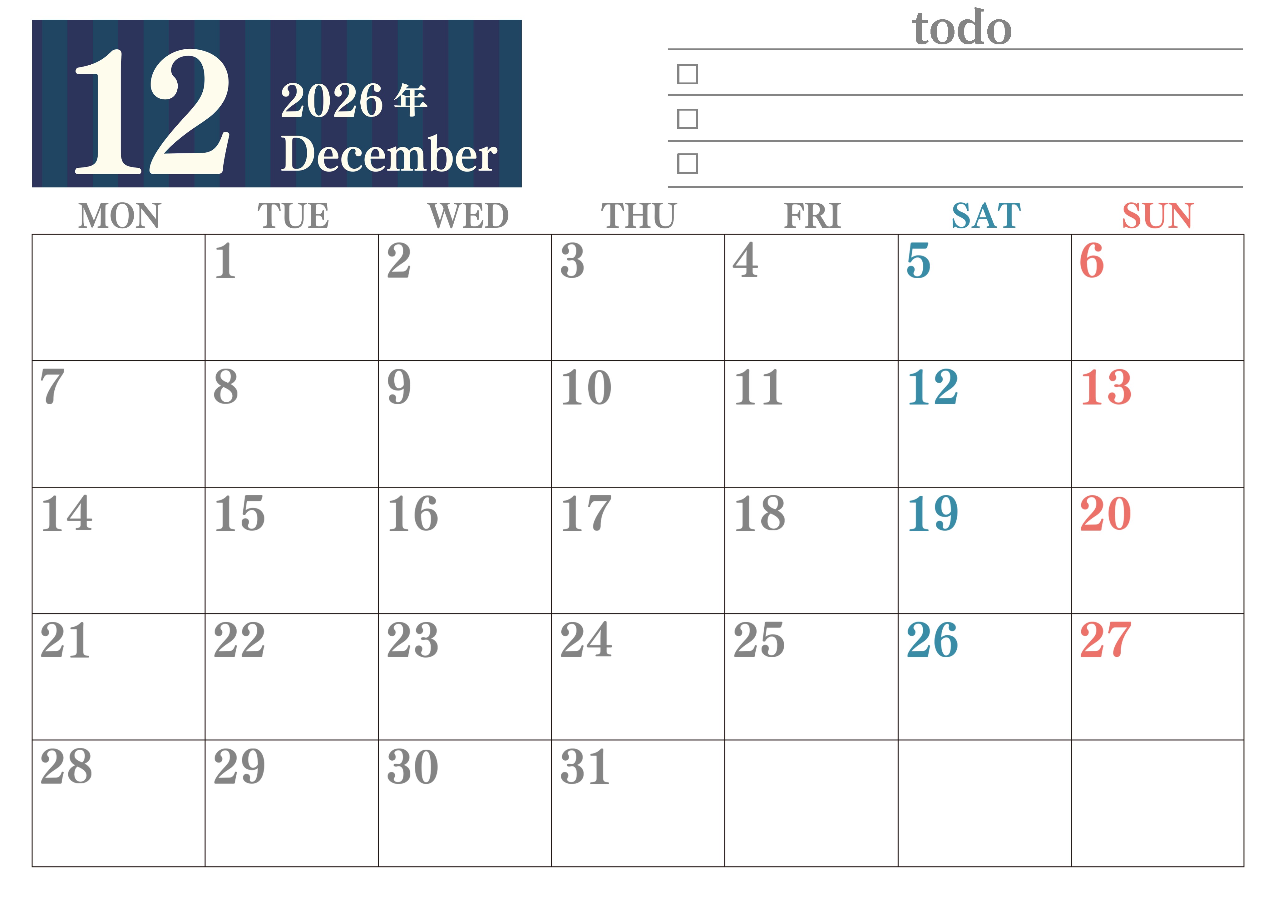 2026年・無料のカレンダーテンプレート 2026年12月カレンダーは横型月曜始まりで使いやすい!勉強の計画におすすめのToDoリストつき:無料(2026-01421201) 素材状デザイン王 2025年4月12日 2026年12月カレンダーは横型月曜始まりで使いやすいです。勉強の計画におすすめのToDoリストつきなので受験や資格取得のモチベになります。無料でダウンロードを気軽に行えます。(2026-01421201) 12月 横型のカレンダー 月曜始まり ToDoリスト カレンダーデザイン-0142