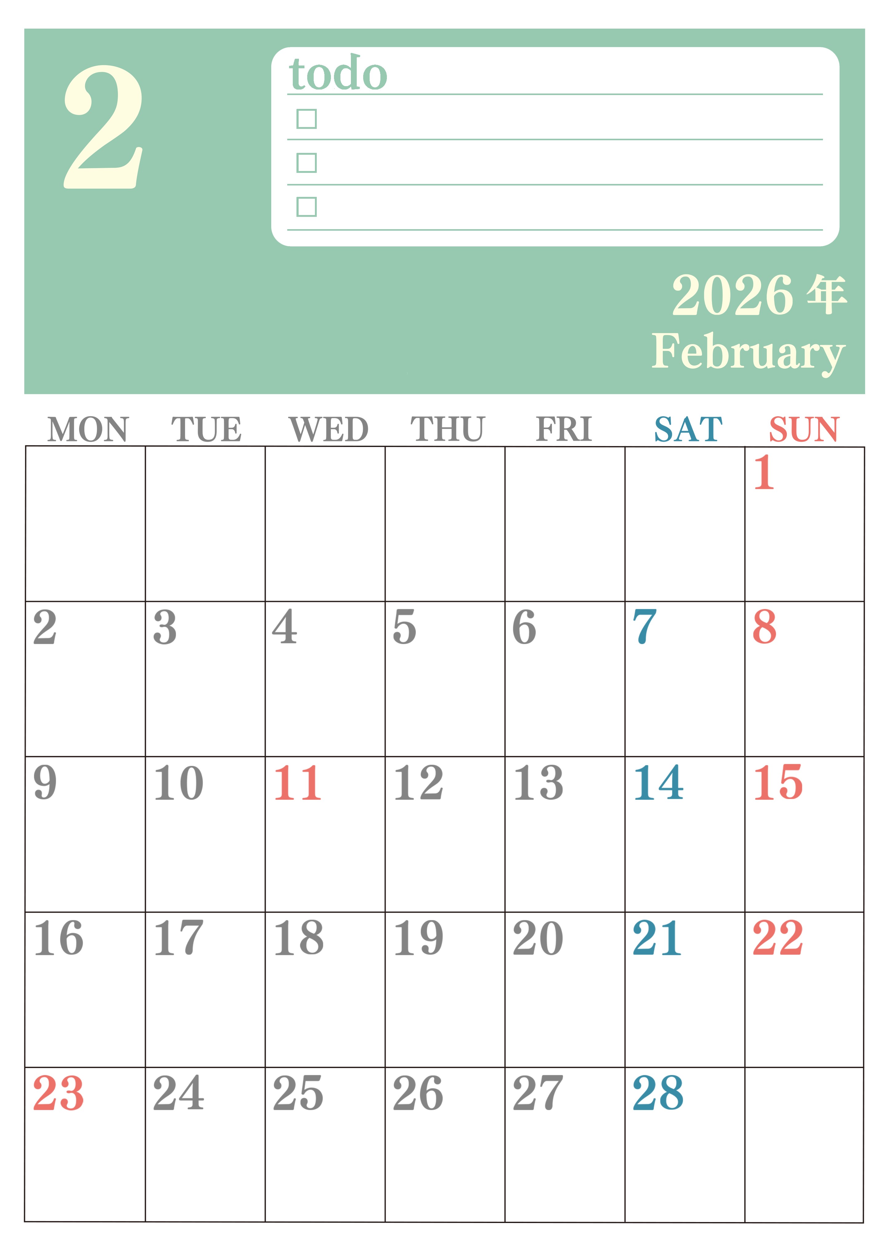 2026年・無料のカレンダーテンプレート 2026年2月カレンダーは縦型月曜始まり!シンプルなToDoリストで勉強効率UP!無料/A4印刷(2026-01430211) 素材状デザイン王 2025年4月12日 2026年2月カレンダーは縦型月曜始まりです。シンプルなToDoリストを使って勉強の効率UPしましょう。無料ダウンロード・印刷で実用的です。(2026-01430211) 2月 縦型のカレンダー 月曜始まり ToDoリスト カレンダーデザイン-0143