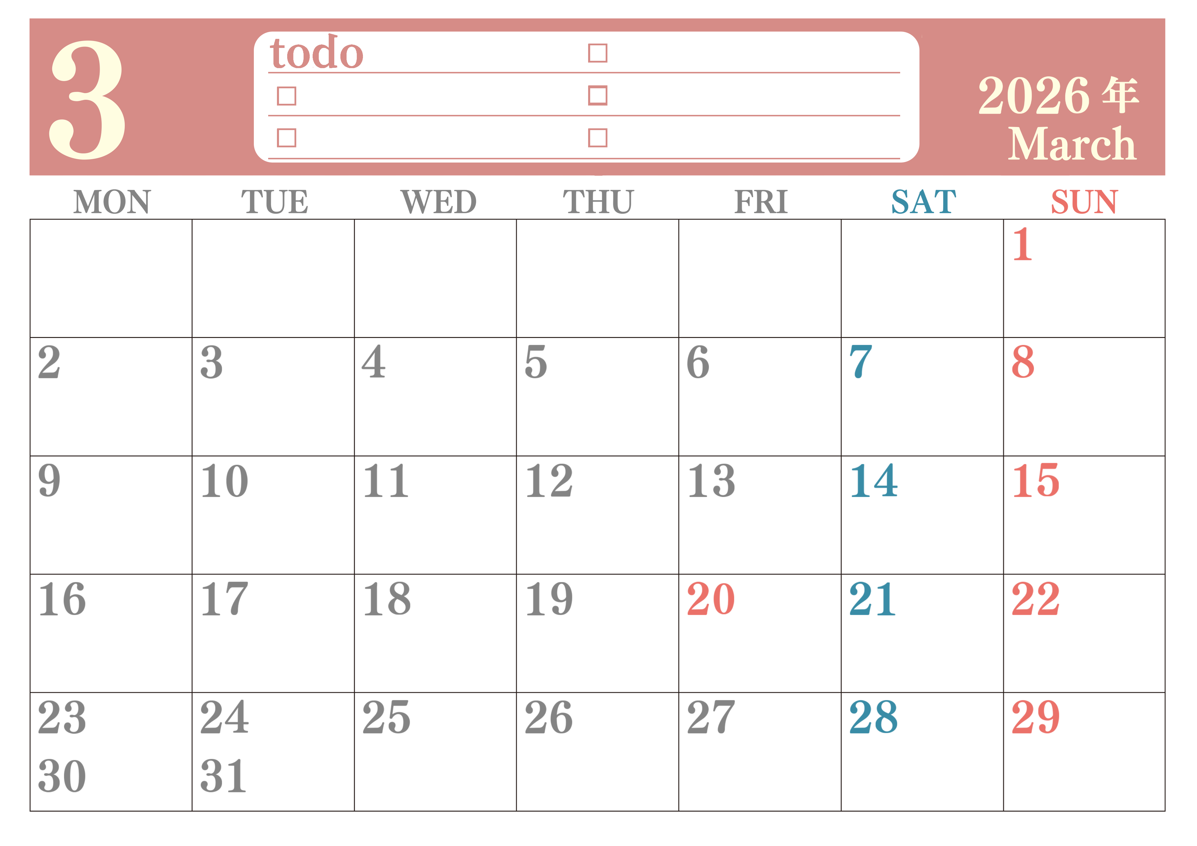 2026年3月カレンダーは横型月曜始まり!シンプルなToDoリストで勉強効率UP!無料/A4印刷(2026-01430301)