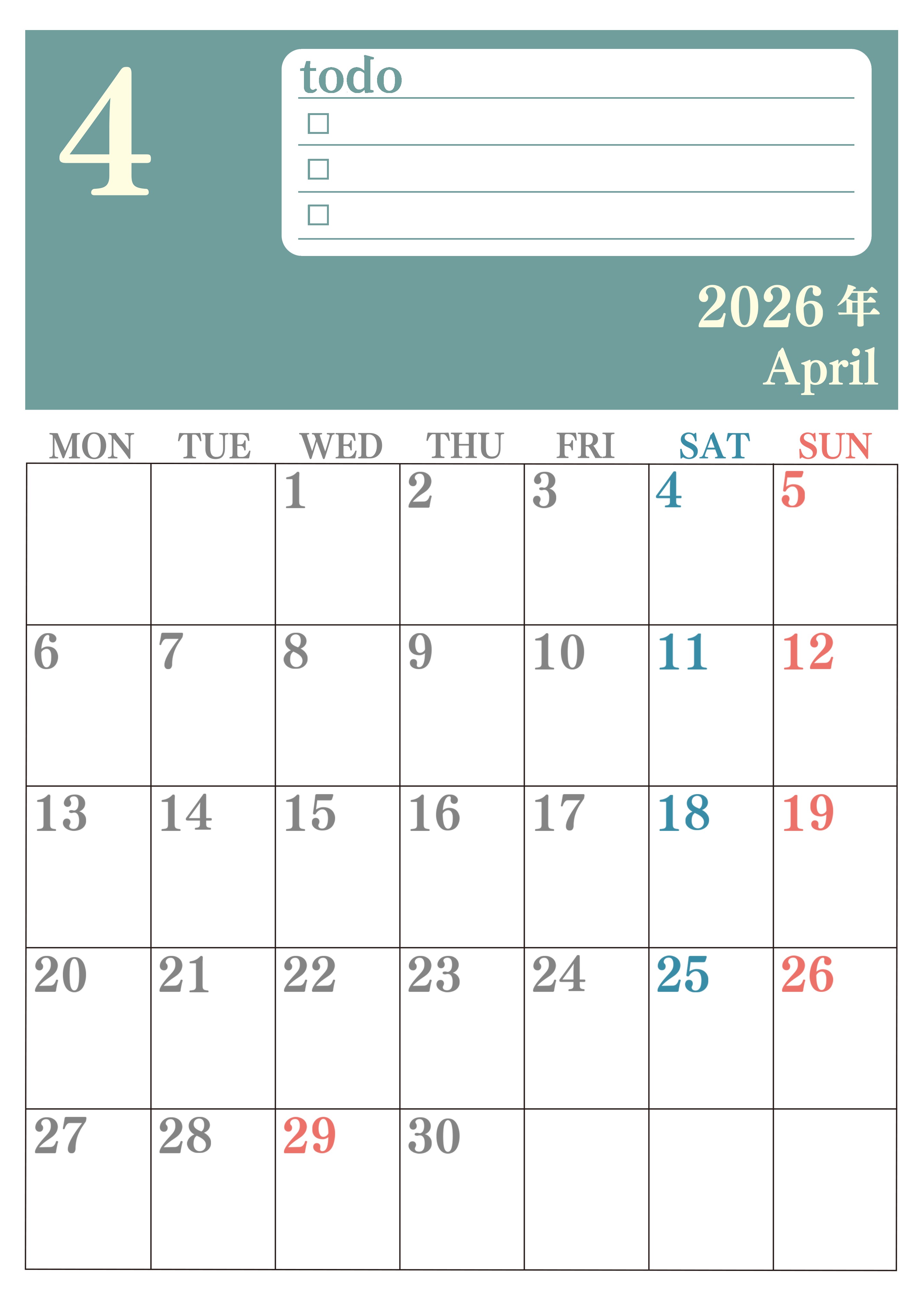 2026年・無料のカレンダーテンプレート 2026年4月カレンダーは縦型月曜始まり!シンプルなToDoリストで勉強効率UP!無料/A4印刷(2026-01430411) 素材状デザイン王 2025年4月12日 2026年4月カレンダーは縦型月曜始まりです。シンプルなToDoリストを使って勉強の効率UPしましょう。無料ダウンロード・印刷で実用的です。(2026-01430411) 4月 縦型のカレンダー 月曜始まり ToDoリスト カレンダーデザイン-0143