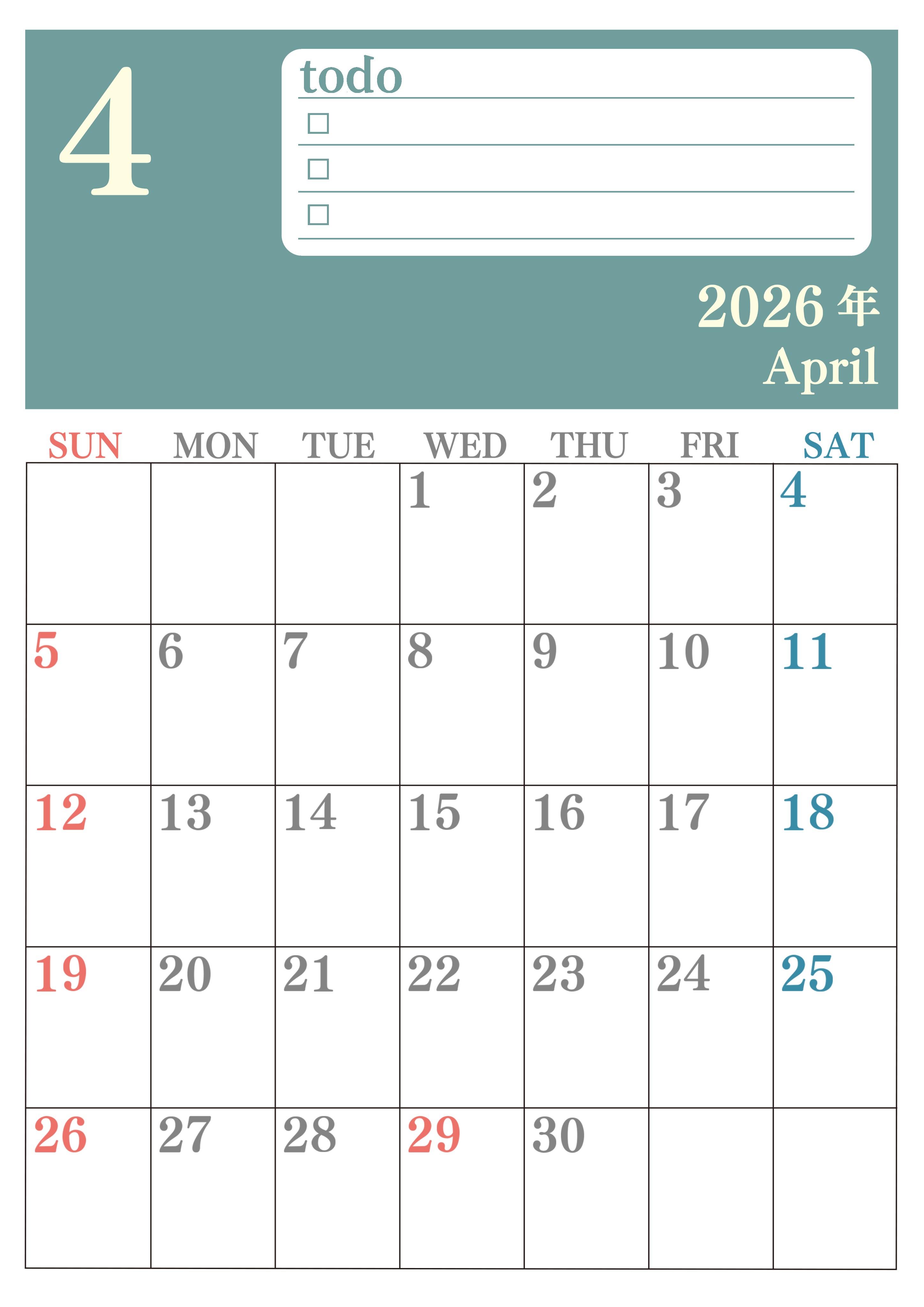 2026年・無料のカレンダーテンプレート 2026年4月カレンダーは縦型日曜始まり!シンプルなToDoリストで勉強効率UP!無料/A4印刷(2026-01430410) 素材状デザイン王 2025年4月12日 2026年4月カレンダーは縦型日曜始まりです。シンプルなToDoリストを使って勉強の効率UPしましょう。無料ダウンロード・印刷で実用的です。(2026-01430410) 4月 縦型のカレンダー 日曜始まり ToDoリスト カレンダーデザイン-0143