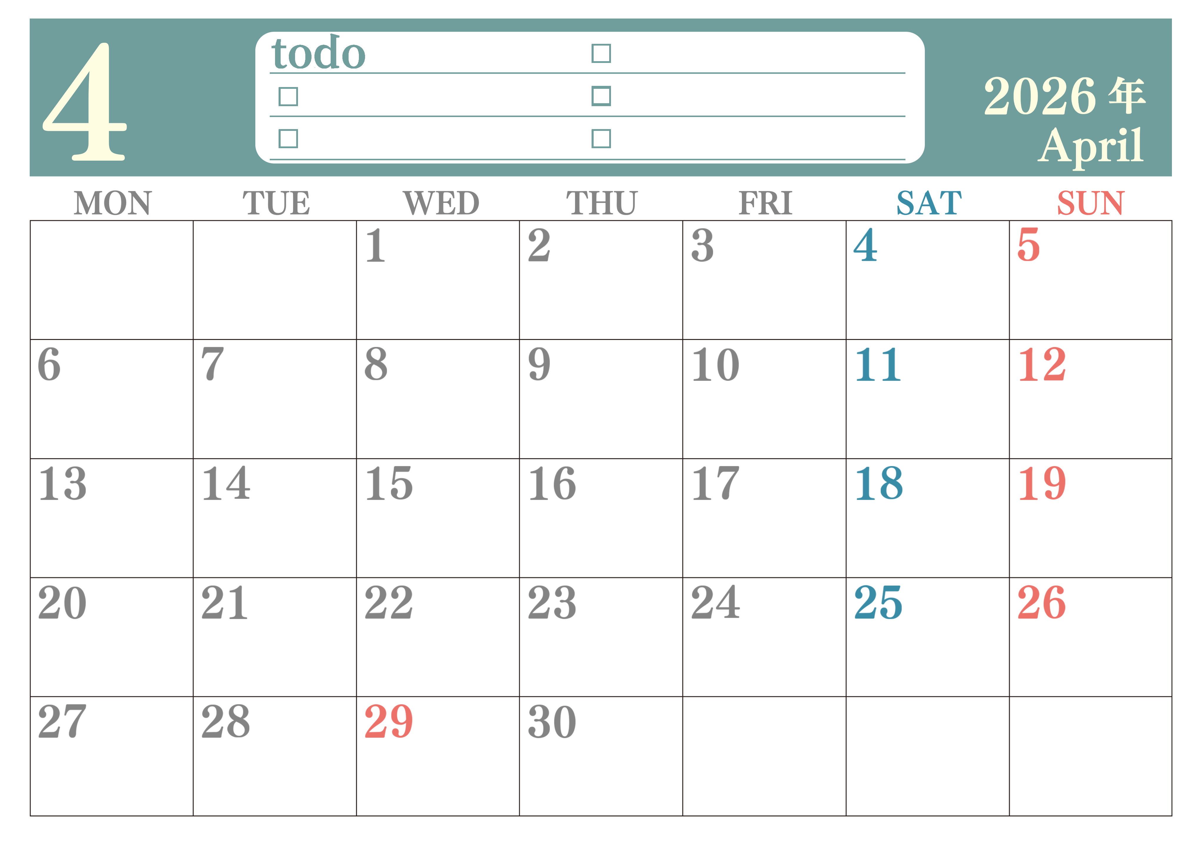 2026年・無料のカレンダーテンプレート 2026年4月カレンダーは横型月曜始まり!シンプルなToDoリストで勉強効率UP!無料/A4印刷(2026-01430401) 素材状デザイン王 2025年4月12日 2026年4月カレンダーは横型月曜始まりです。シンプルなToDoリストを使って勉強の効率UPしましょう。無料ダウンロード・印刷で実用的です。(2026-01430401) 4月 横型のカレンダー 月曜始まり ToDoリスト カレンダーデザイン-0143