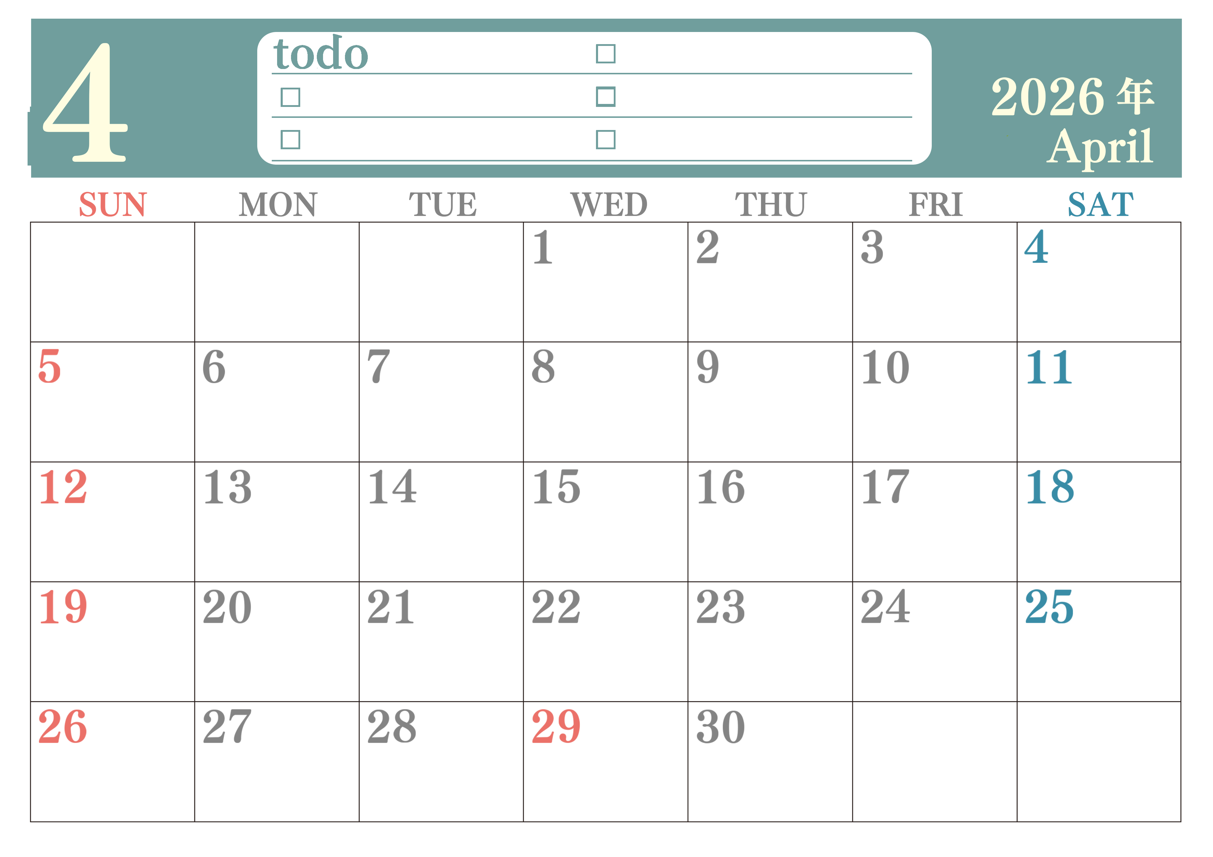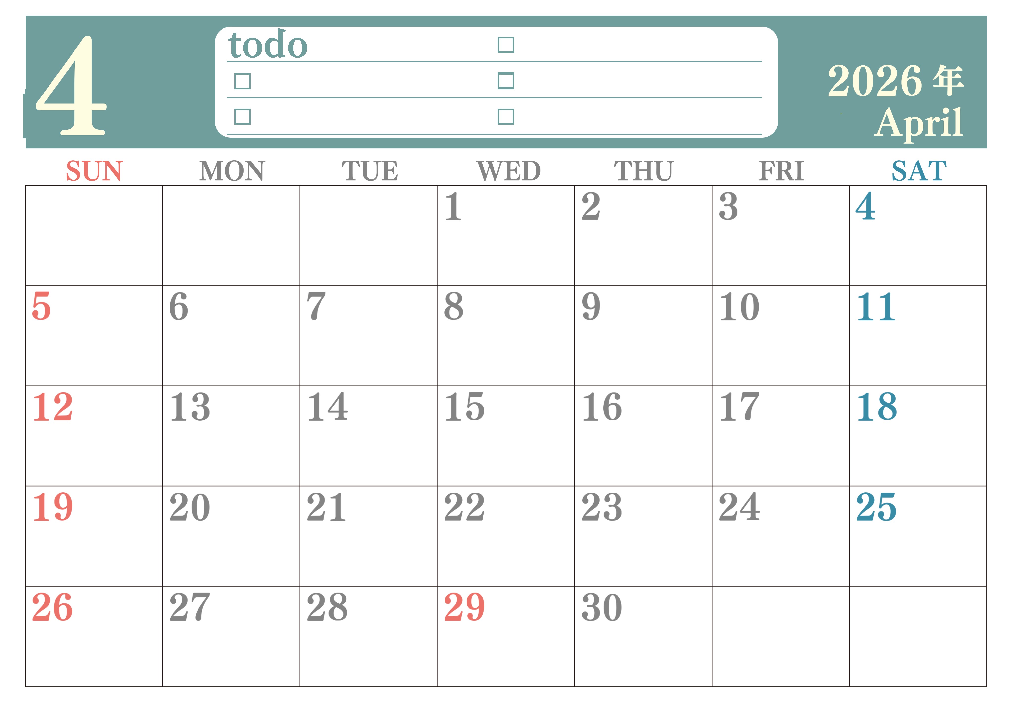 2026年4月カレンダーは横型日曜始まり!シンプルなToDoリストで勉強効率UP!無料/A4印刷(2026-01430400)