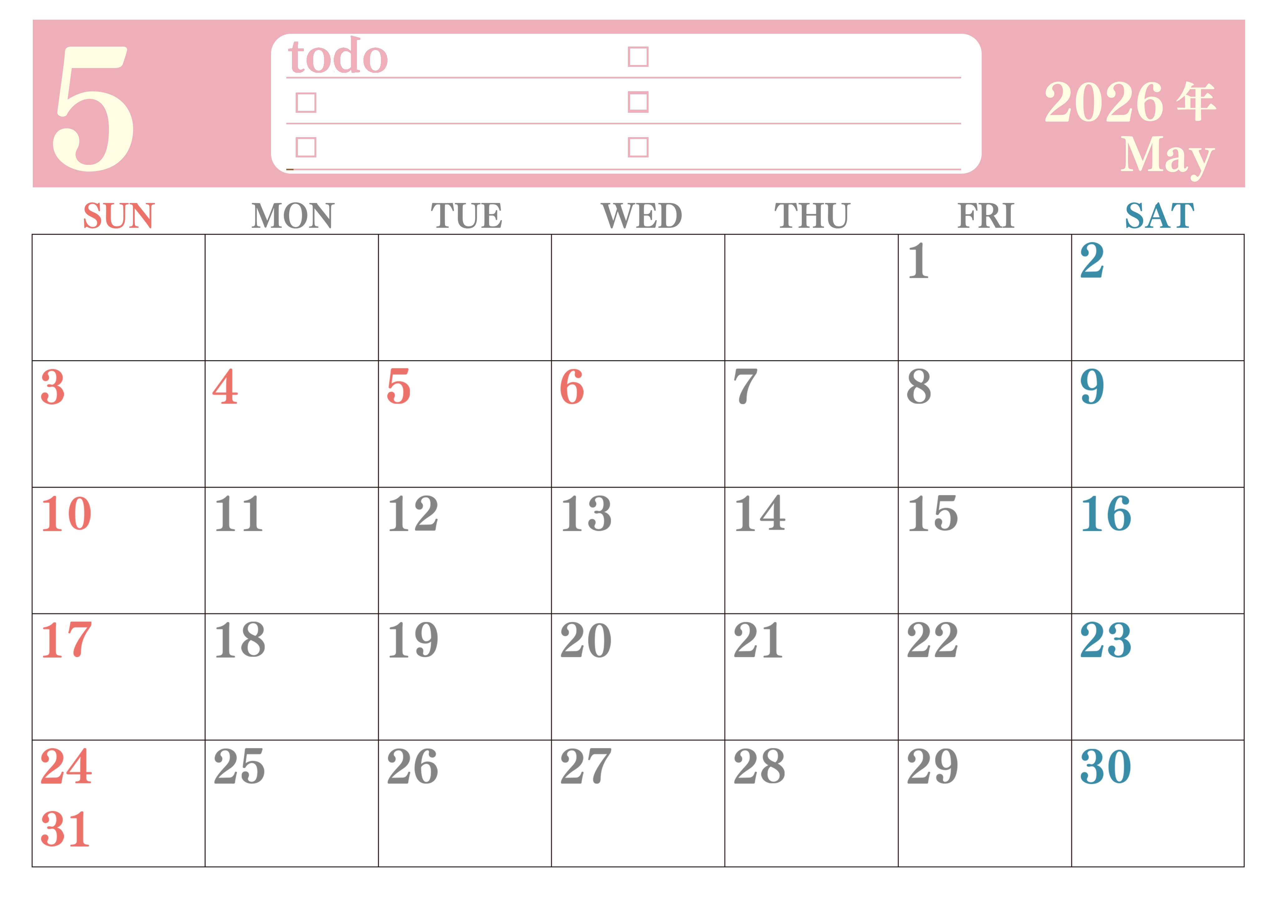 2026年5月カレンダーは横型日曜始まりです。シンプルなToDoリストを使って勉強の効率UPしましょう。無料ダウンロード・印刷で実用的です。(2026-01430500)