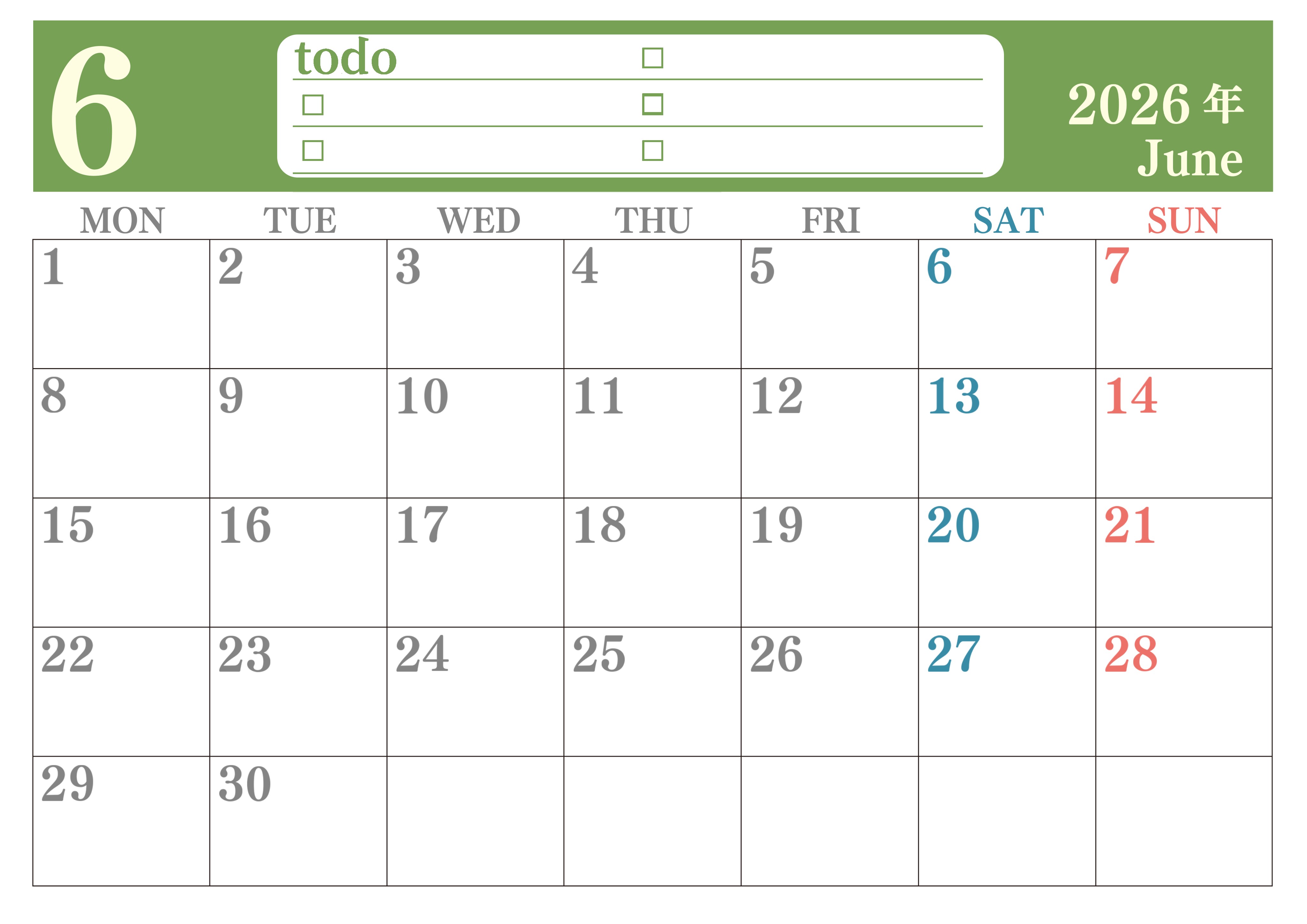 2026年6月カレンダーは横型月曜始まりです。シンプルなToDoリストを使って勉強の効率UPしましょう。無料ダウンロード・印刷で実用的です。(2026-01430601)