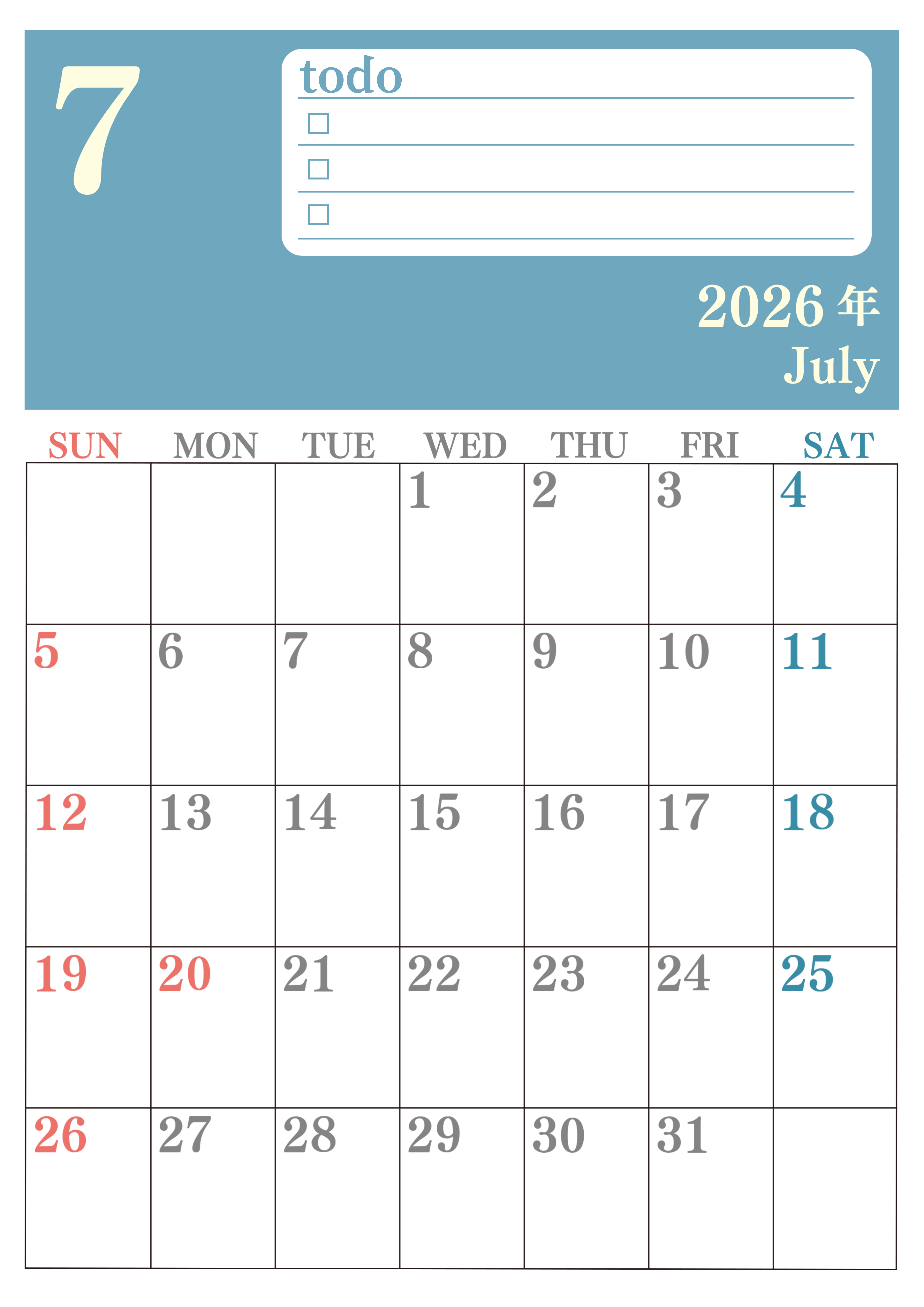 2026年7月カレンダーは縦型日曜始まりです。シンプルなToDoリストを使って勉強の効率UPしましょう。無料ダウンロード・印刷で実用的です。(2026-01430710)