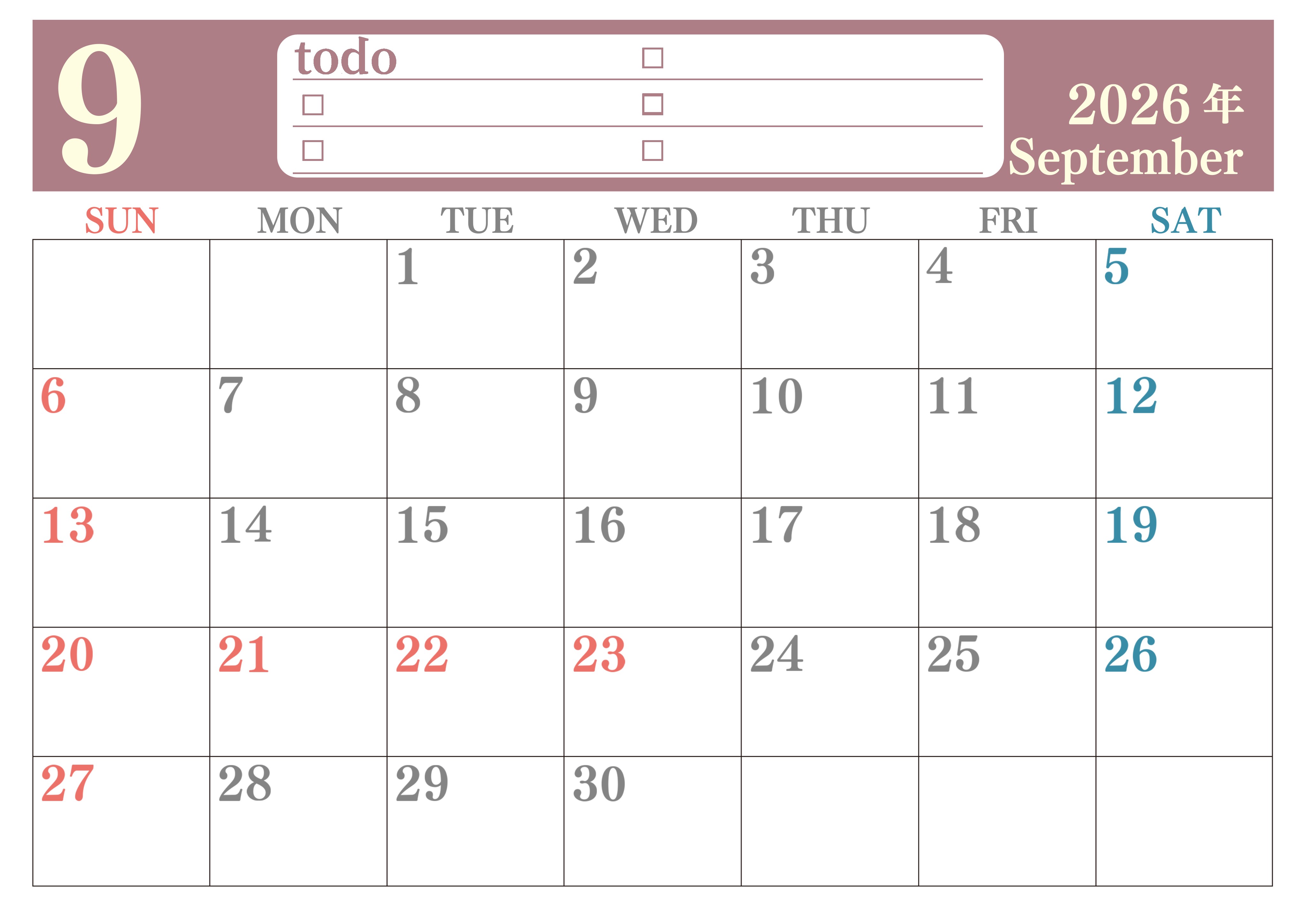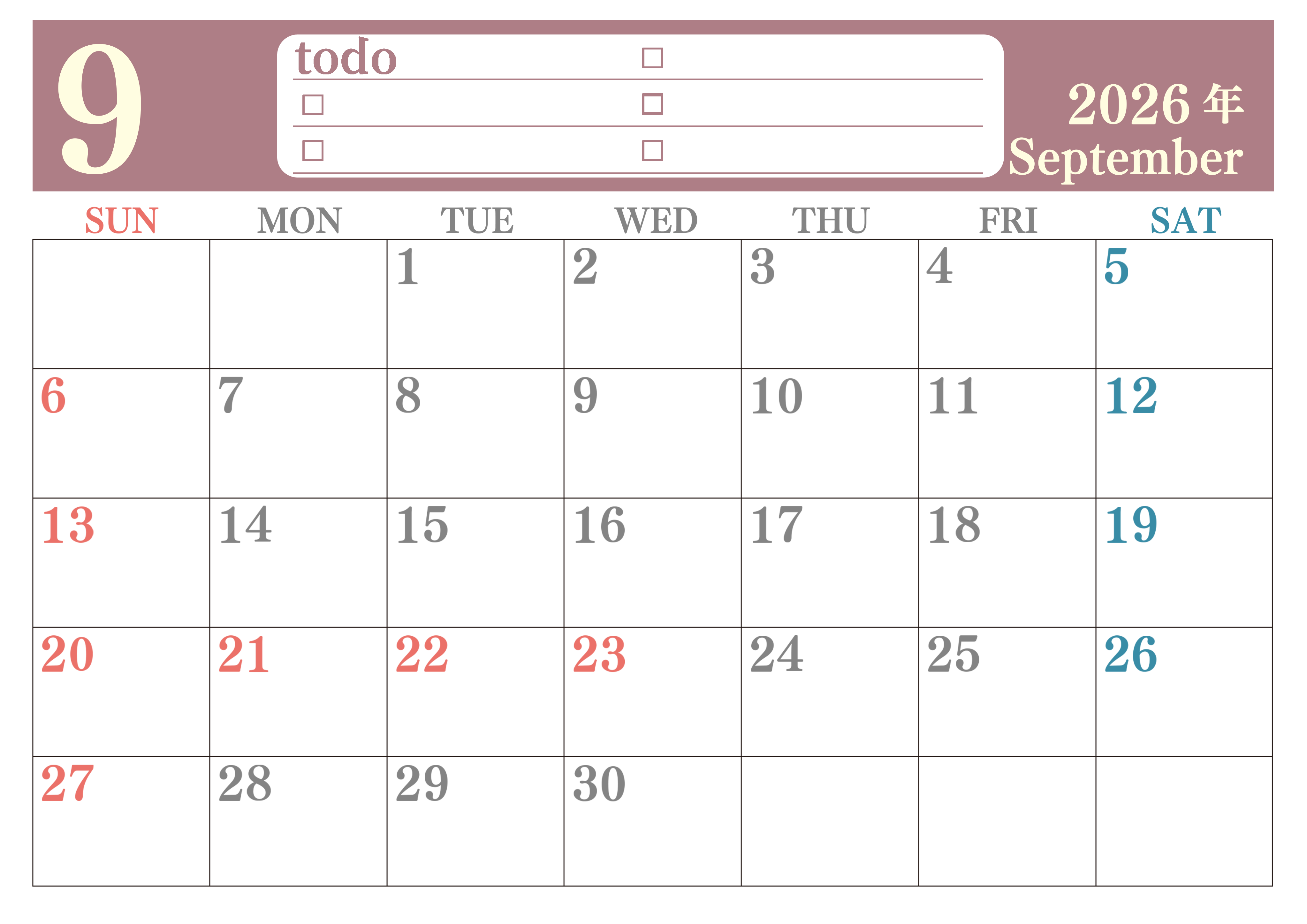 2026年9月カレンダーは横型日曜始まり!シンプルなToDoリストで勉強効率UP!無料/A4印刷(2026-01430900)