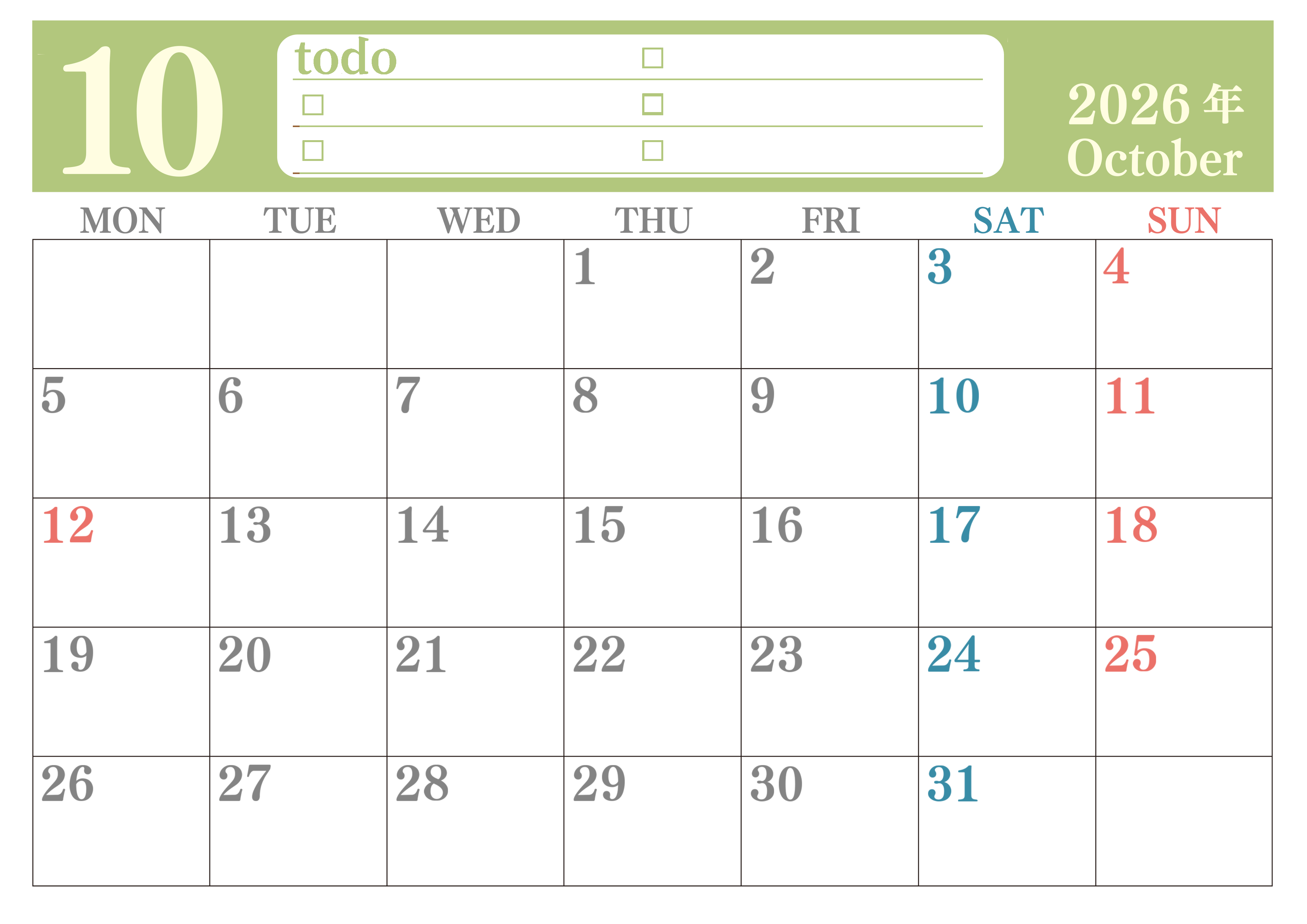 2026年・無料のカレンダーテンプレート 2026年10月カレンダーは横型月曜始まり!シンプルなToDoリストで勉強効率UP!無料/A4印刷(2026-01431001) 素材状デザイン王 2025年4月12日 2026年10月カレンダーは横型月曜始まりです。シンプルなToDoリストを使って勉強の効率UPしましょう。無料ダウンロード・印刷で実用的です。(2026-01431001) 10月 横型のカレンダー 月曜始まり ToDoリスト カレンダーデザイン-0143