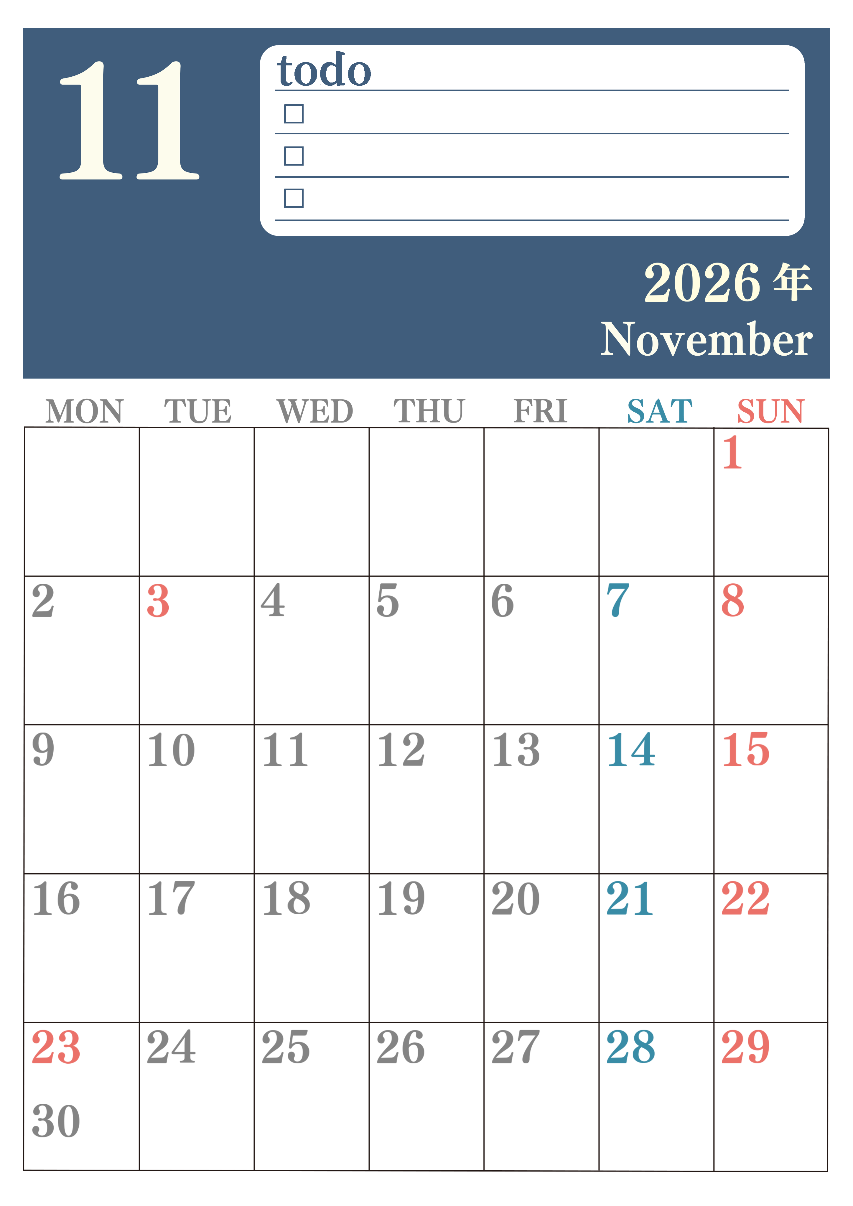 2026年・無料のカレンダーテンプレート 2026年11月カレンダーは縦型月曜始まり!シンプルなToDoリストで勉強効率UP!無料/A4印刷(2026-01431111) 素材状デザイン王 2025年4月12日 2026年11月カレンダーは縦型月曜始まりです。シンプルなToDoリストを使って勉強の効率UPしましょう。無料ダウンロード・印刷で実用的です。(2026-01431111) 11月 縦型のカレンダー 月曜始まり ToDoリスト カレンダーデザイン-0143