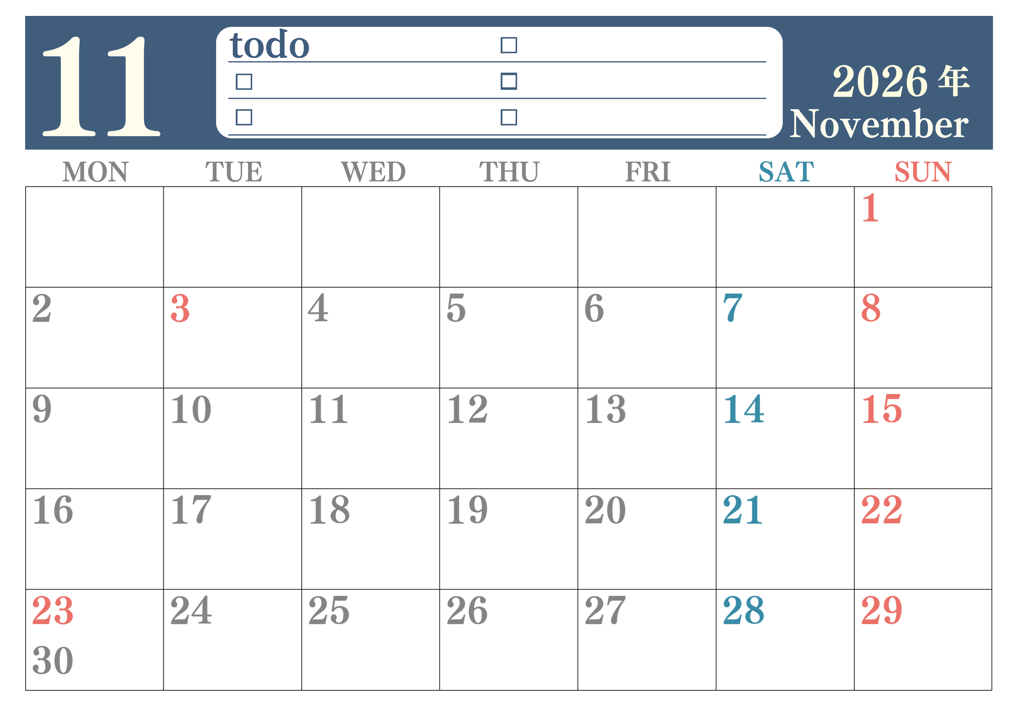 2026年・無料のカレンダーテンプレート 2026年11月カレンダーは横型月曜始まり!シンプルなToDoリストで勉強効率UP!無料/A4印刷(2026-01431101) 素材状デザイン王 2025年4月12日 2026年11月カレンダーは横型月曜始まりです。シンプルなToDoリストを使って勉強の効率UPしましょう。無料ダウンロード・印刷で実用的です。(2026-01431101) 11月 横型のカレンダー 月曜始まり ToDoリスト カレンダーデザイン-0143