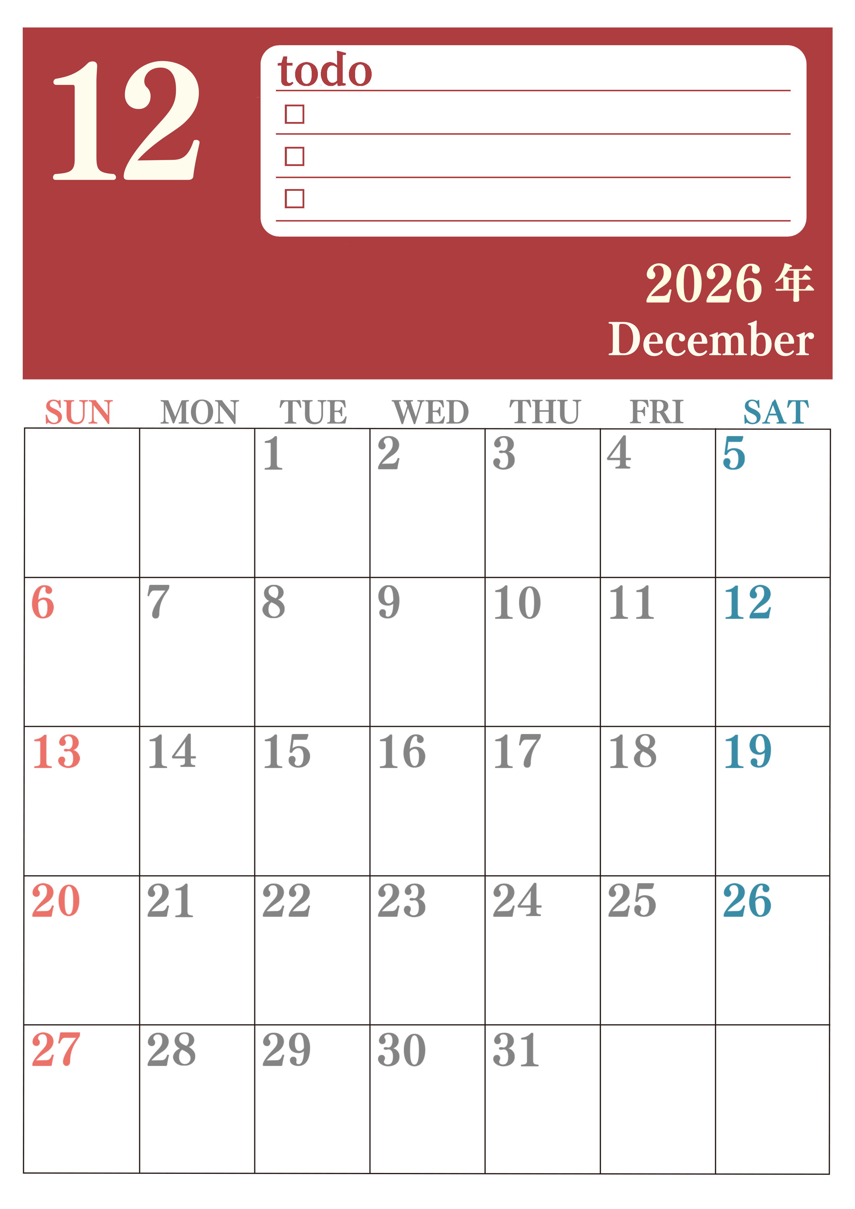 2026年12月カレンダーは縦型日曜始まり!シンプルなToDoリストで勉強効率UP!無料/A4印刷(2026-01431210)