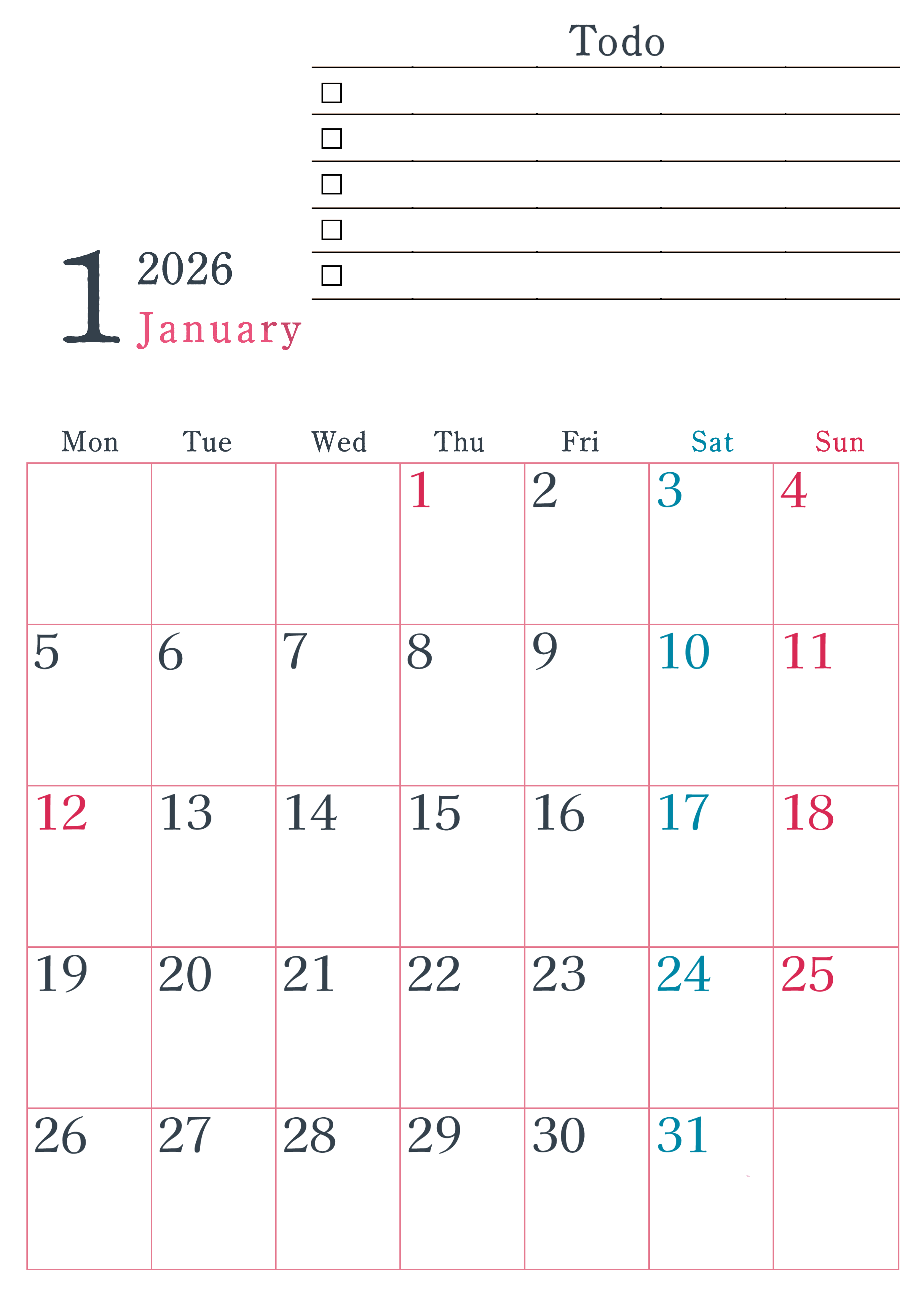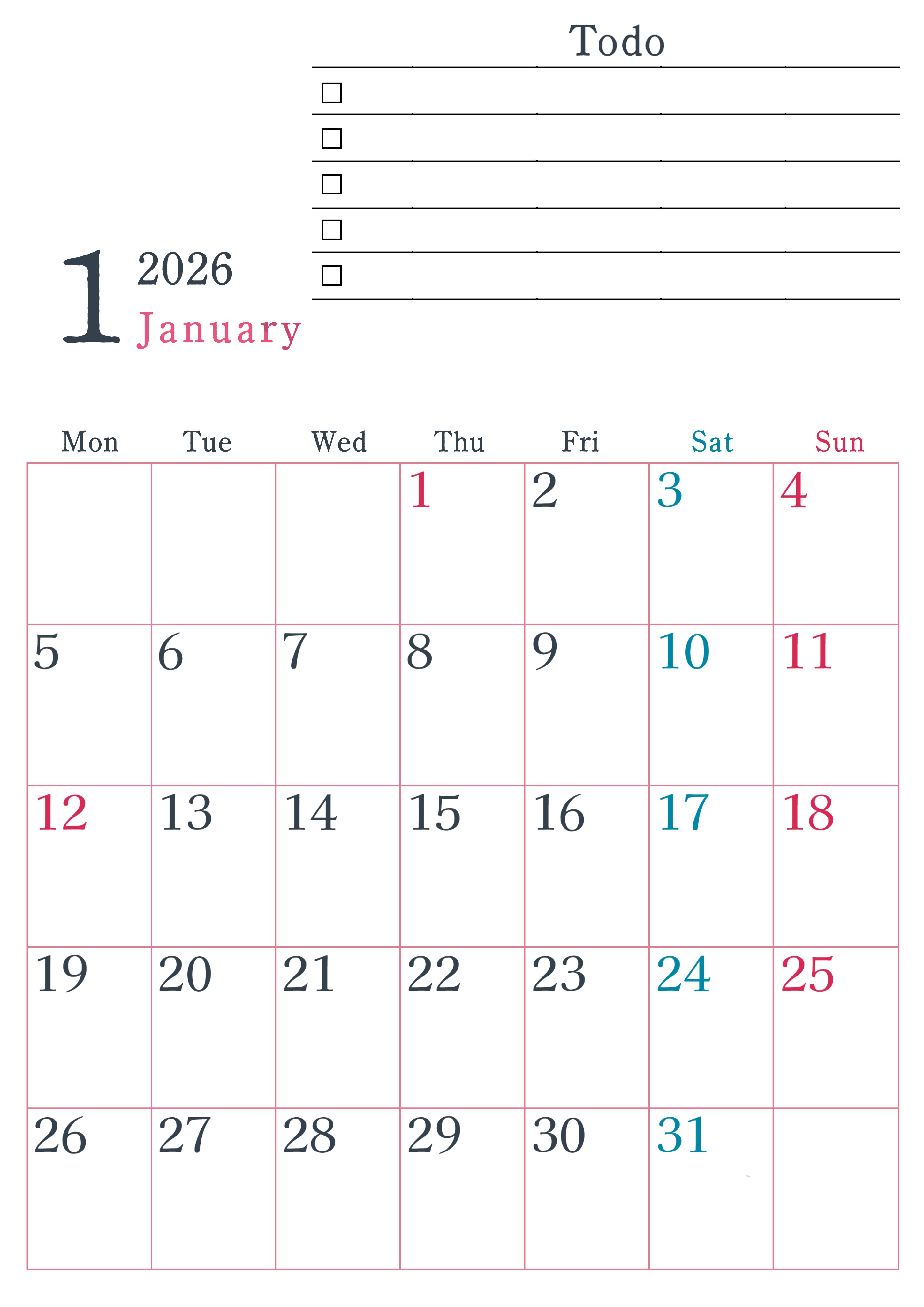 2026年・無料のカレンダーテンプレート 2026年1月カレンダーは縦型月曜始まりで使い方はシンプルなToDoリストつき♪無料ダウンロード・A4印刷(2026-01440111) 素材状デザイン王 2025年4月12日 2026年1月カレンダーは縦型月曜始まりで使い方はシンプルなToDoリストつきです。無料ダウンロードしてA4印刷しましょう。(2026-01440111) 1月 縦型のカレンダー 月曜始まり ToDoリスト カレンダーデザイン-0144