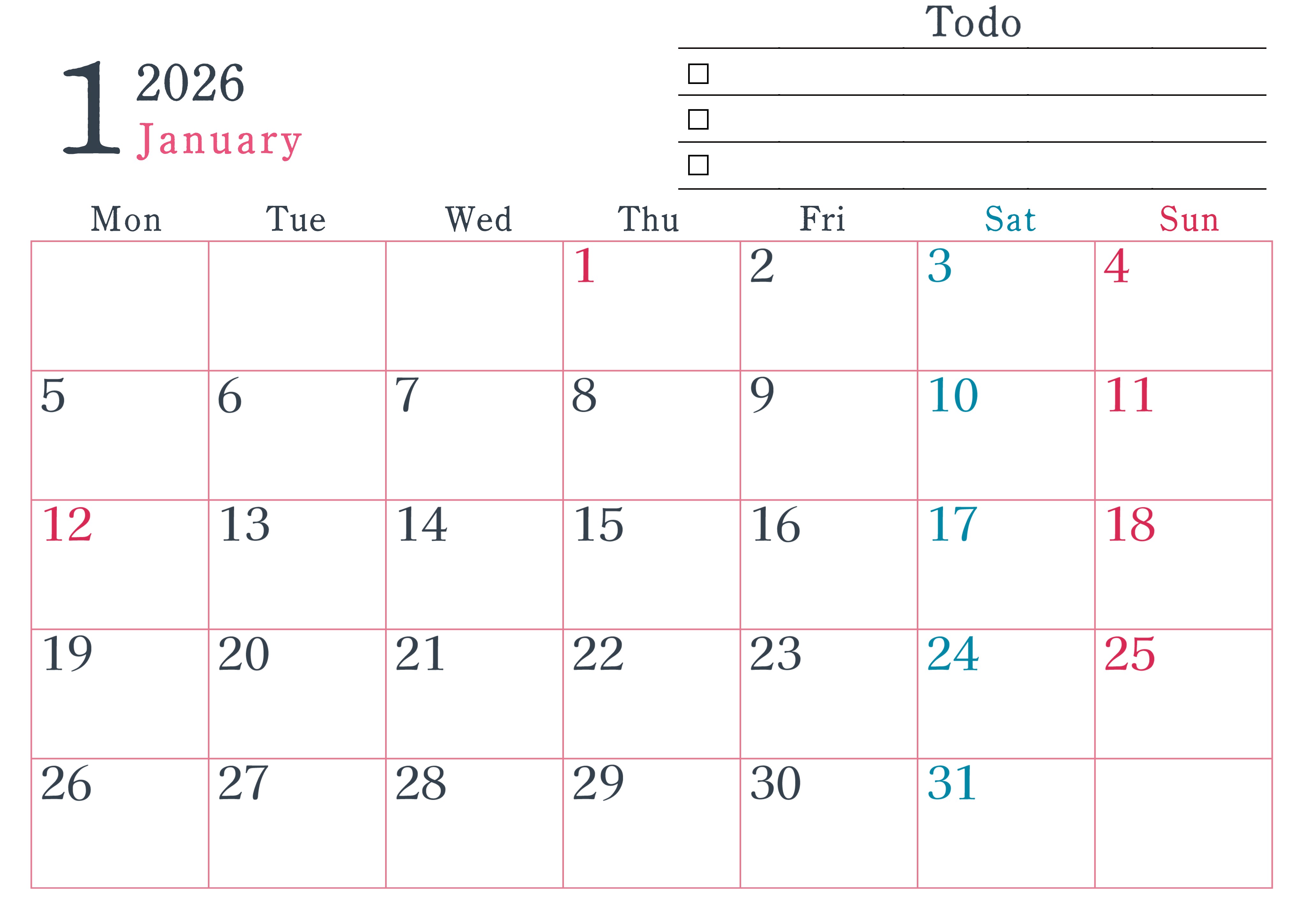 2026年1月カレンダーは横型月曜始まりで使い方はシンプルなToDoリストつきです。無料ダウンロードしてA4印刷しましょう。(2026-01440101)