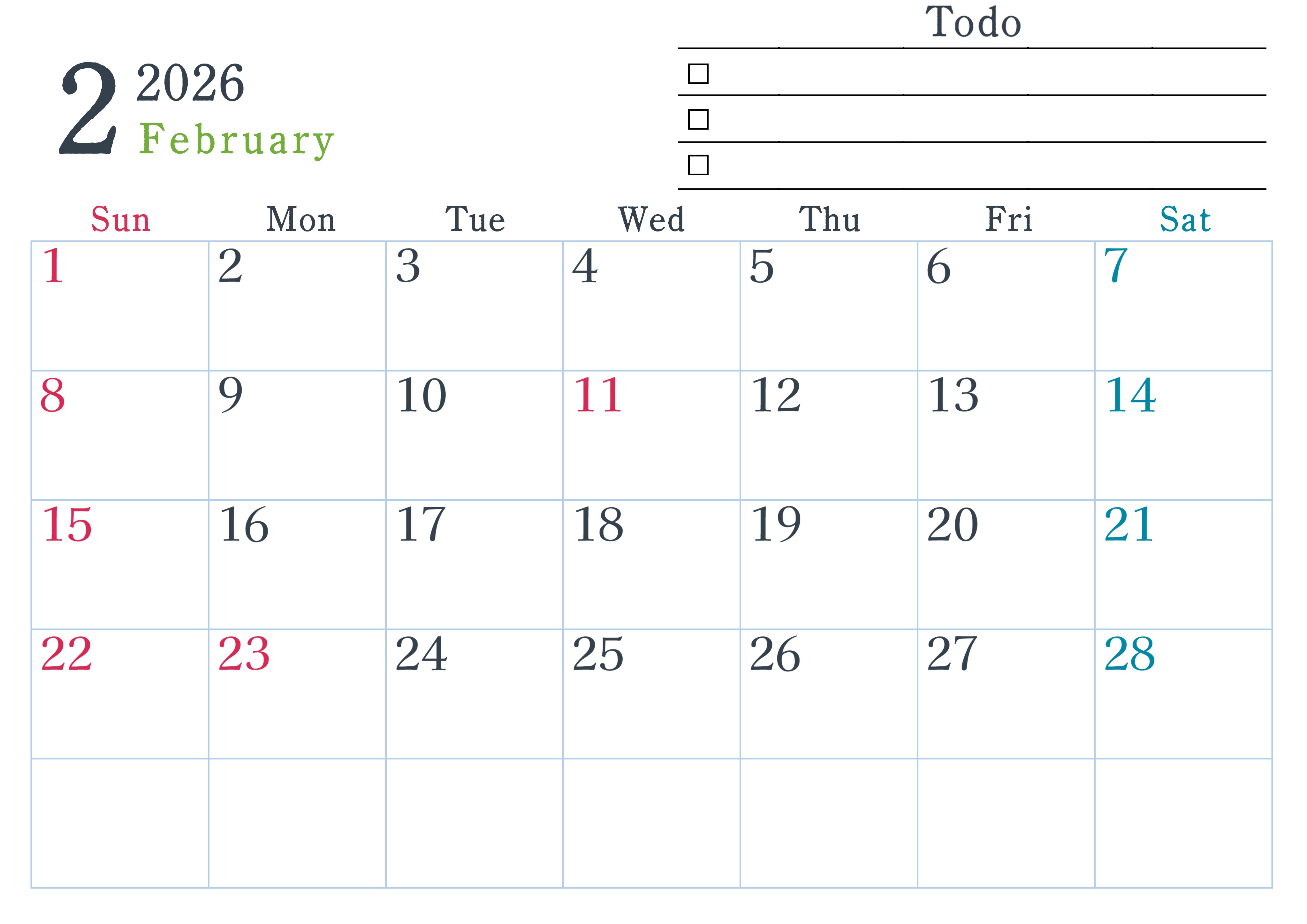 2026年2月カレンダーは横型日曜始まりで使い方はシンプルなToDoリストつきです。無料ダウンロードしてA4印刷しましょう。(2026-01440200)