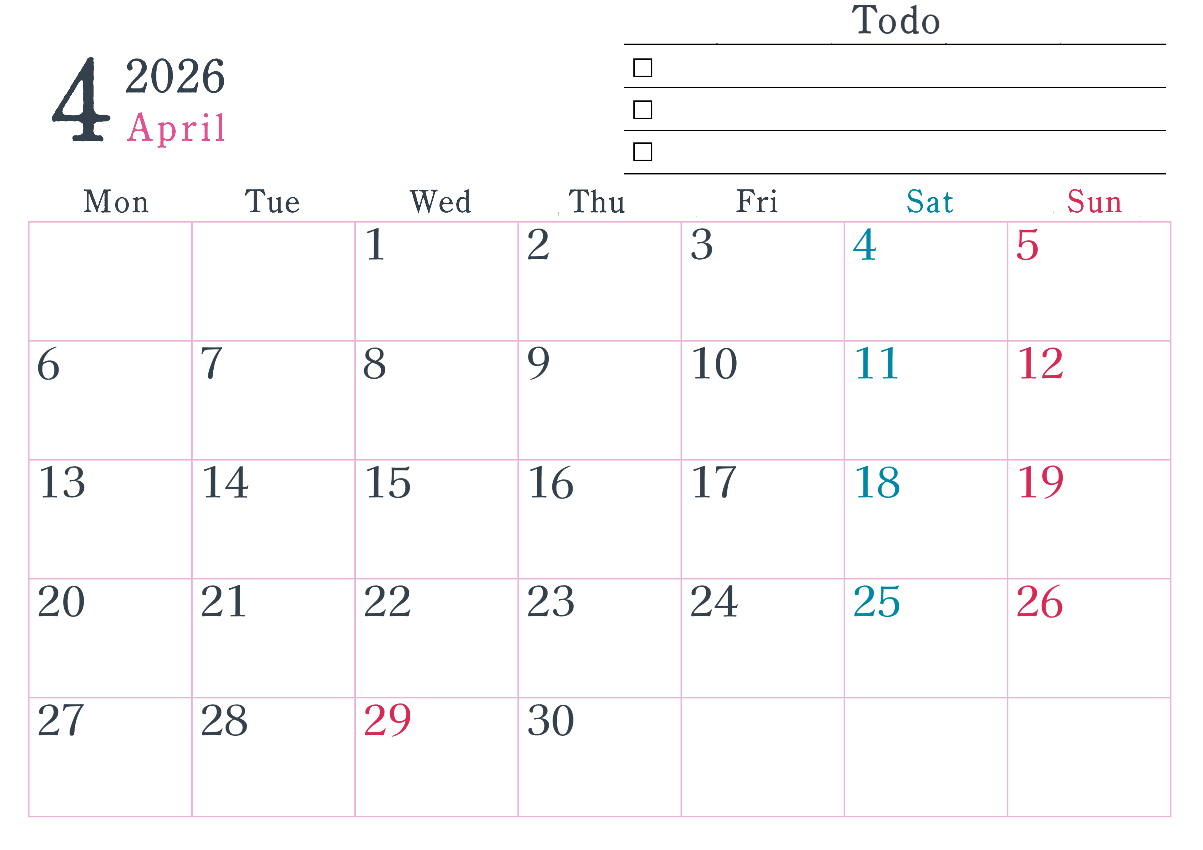 2026年4月カレンダーは横型月曜始まりで使い方はシンプルなToDoリストつきです。無料ダウンロードしてA4印刷しましょう。(2026-01440401)