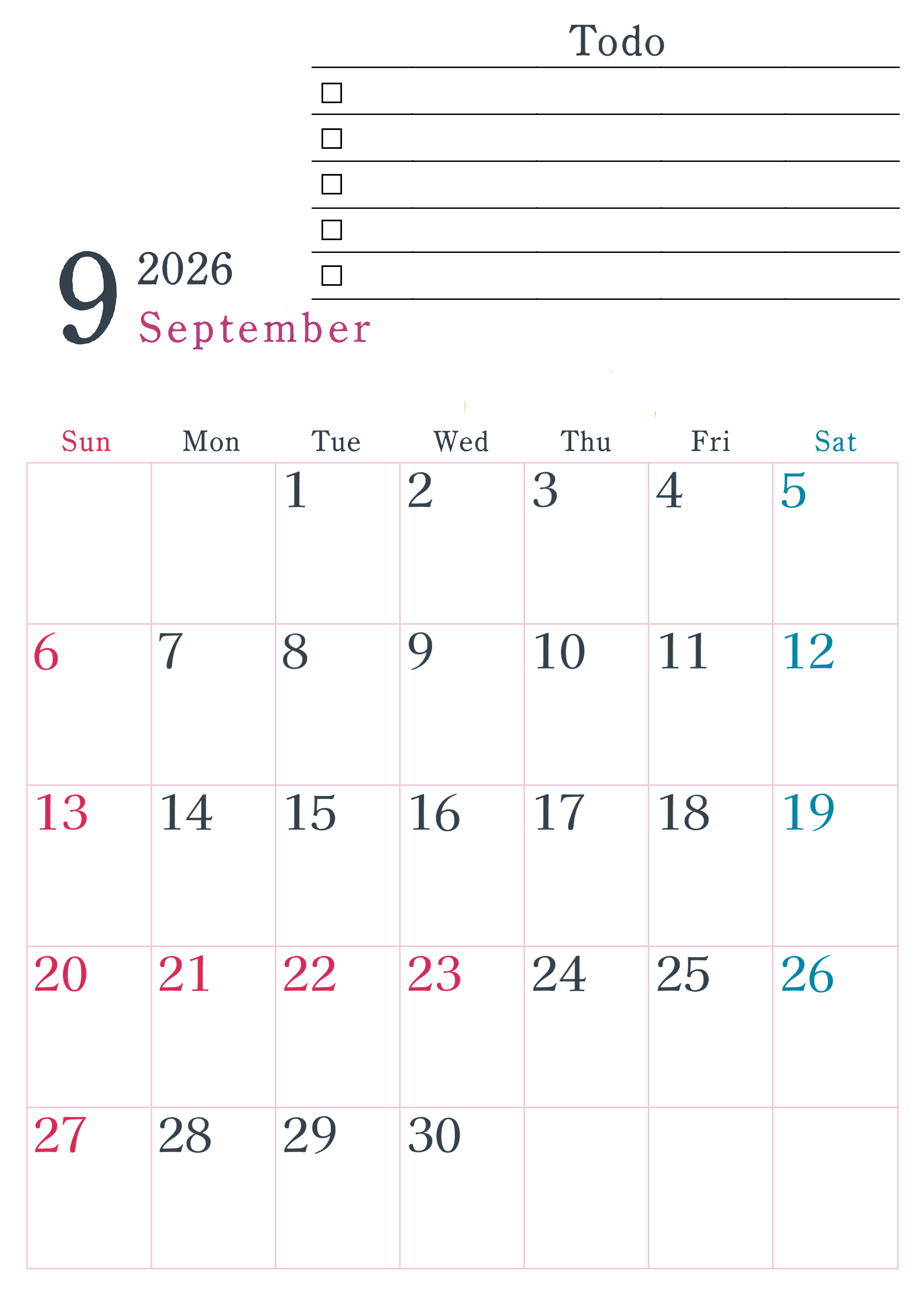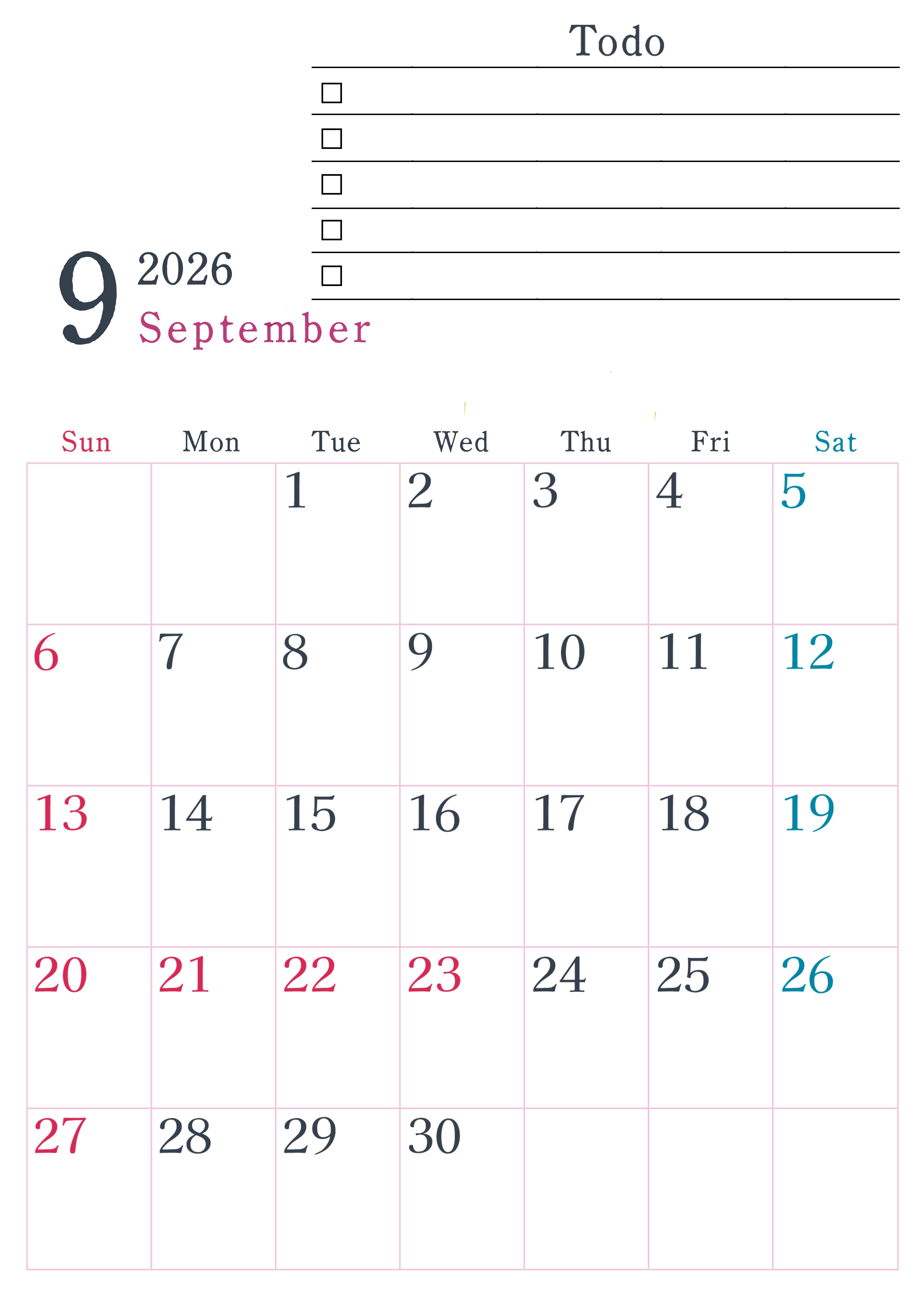 2026年9月カレンダーは縦型日曜始まりで使い方はシンプルなToDoリストつきです。無料ダウンロードしてA4印刷しましょう。(2026-01440910)