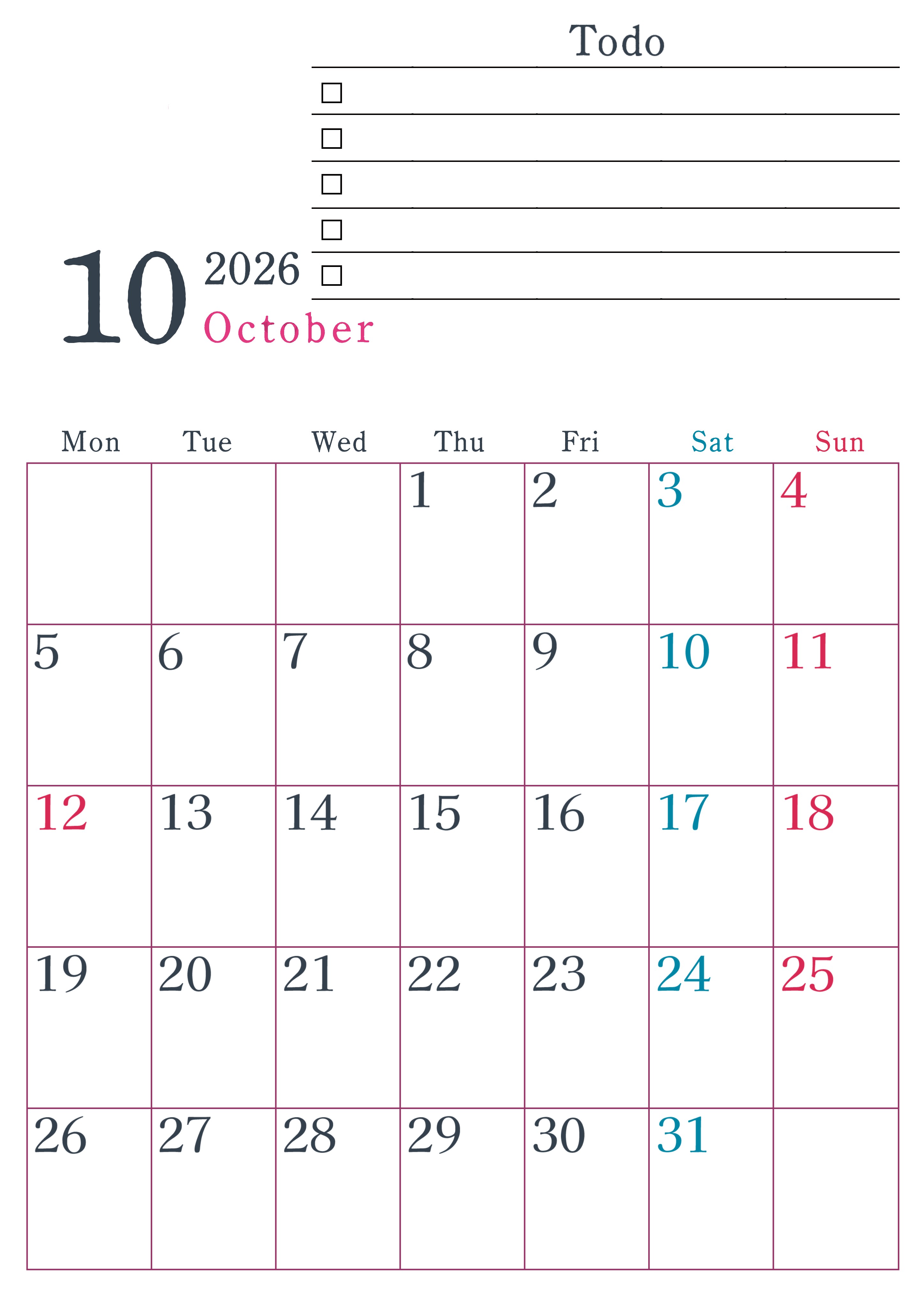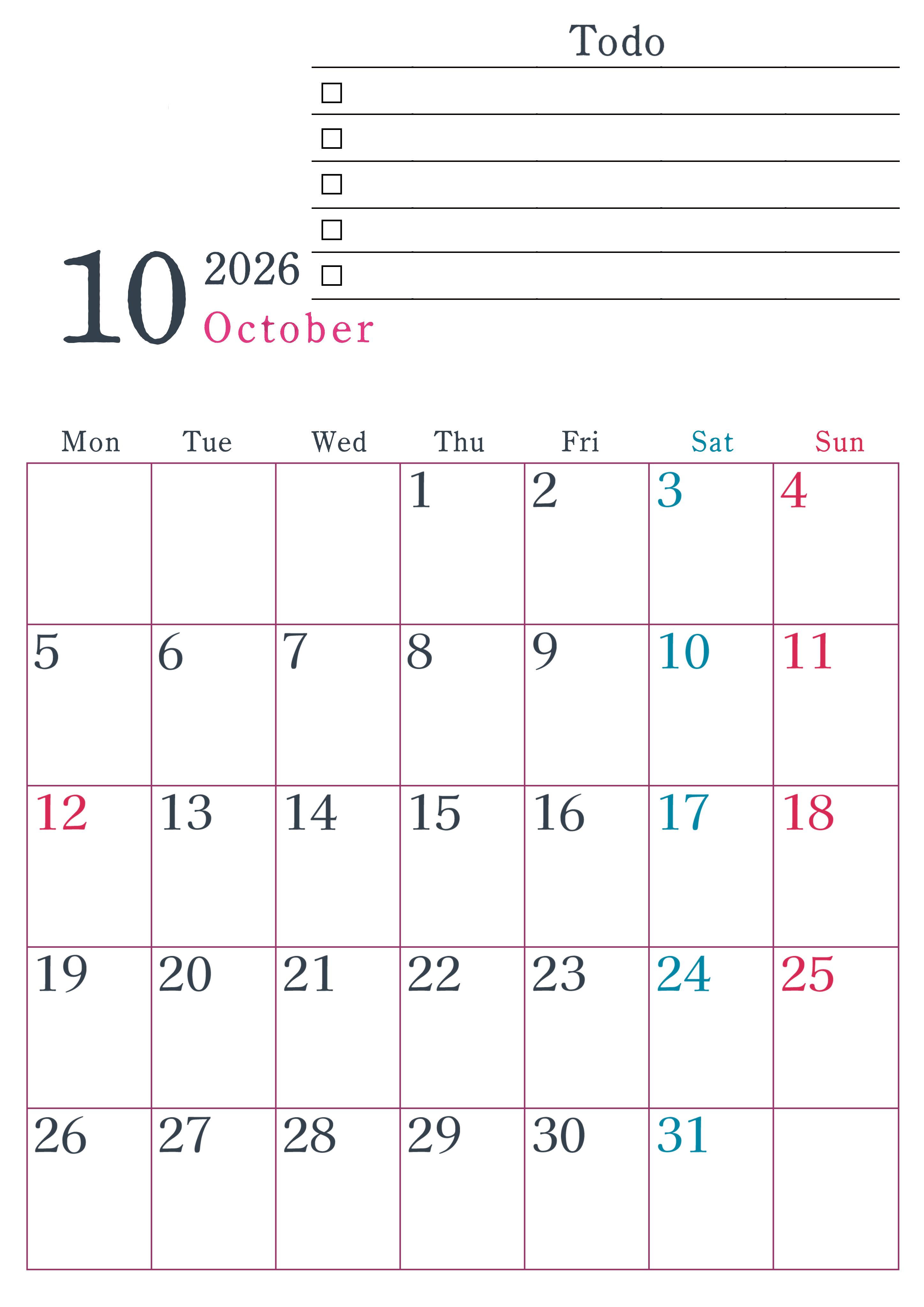 2026年・無料のカレンダーテンプレート 2026年10月カレンダーは縦型月曜始まりで使い方はシンプルなToDoリストつき♪無料ダウンロード・A4印刷(2026-01441011) 素材状デザイン王 2025年4月12日 2026年10月カレンダーは縦型月曜始まりで使い方はシンプルなToDoリストつきです。無料ダウンロードしてA4印刷しましょう。(2026-01441011) 10月 縦型のカレンダー 月曜始まり ToDoリスト カレンダーデザイン-0144