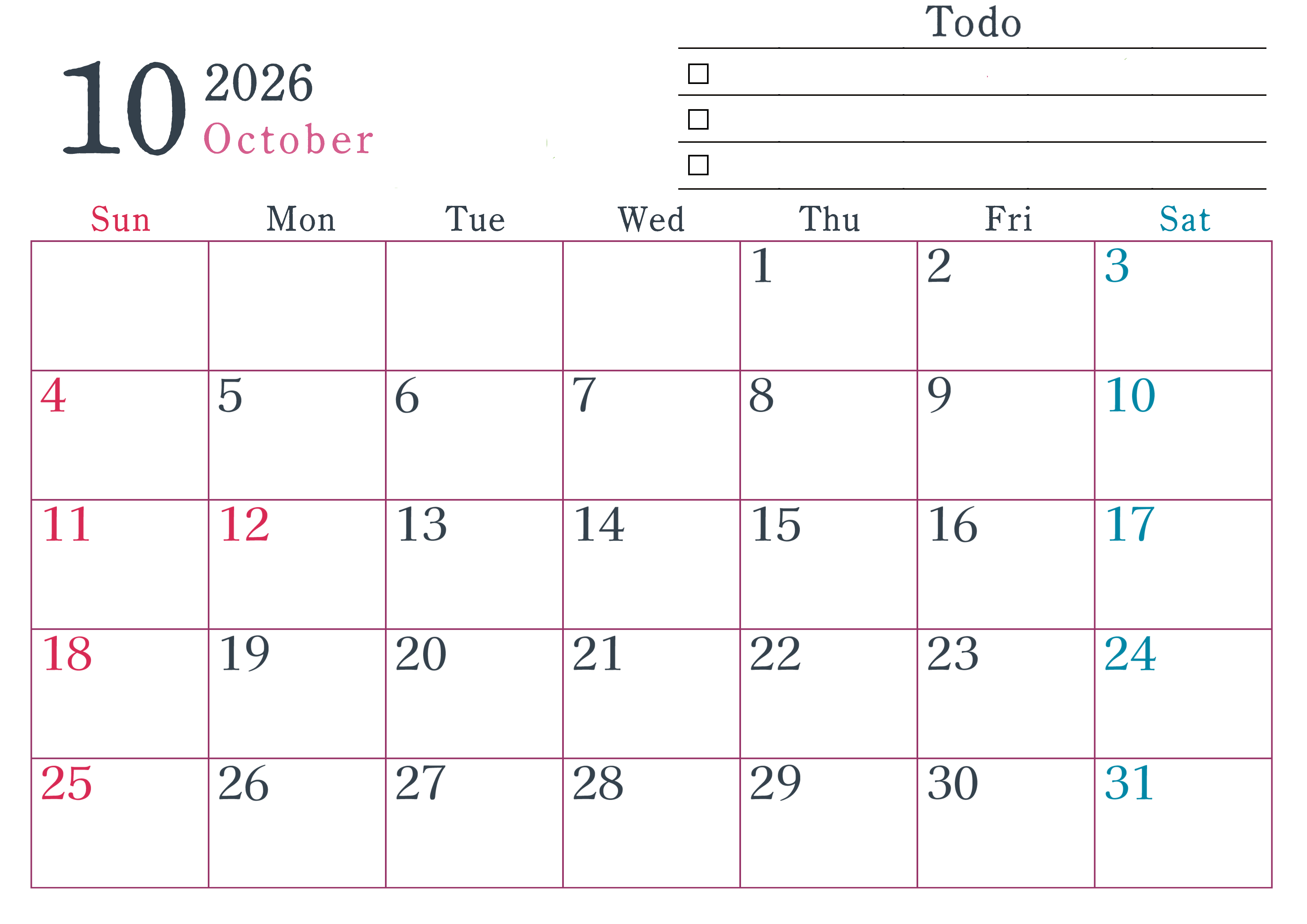 2026年・無料のカレンダーテンプレート 2026年10月カレンダーは横型日曜始まりで使い方はシンプルなToDoリストつき♪無料ダウンロード・A4印刷(2026-01441000) 素材状デザイン王 2025年4月12日 2026年10月カレンダーは横型日曜始まりで使い方はシンプルなToDoリストつきです。無料ダウンロードしてA4印刷しましょう。(2026-01441000) 10月 横型のカレンダー 日曜始まり ToDoリスト カレンダーデザイン-0144
