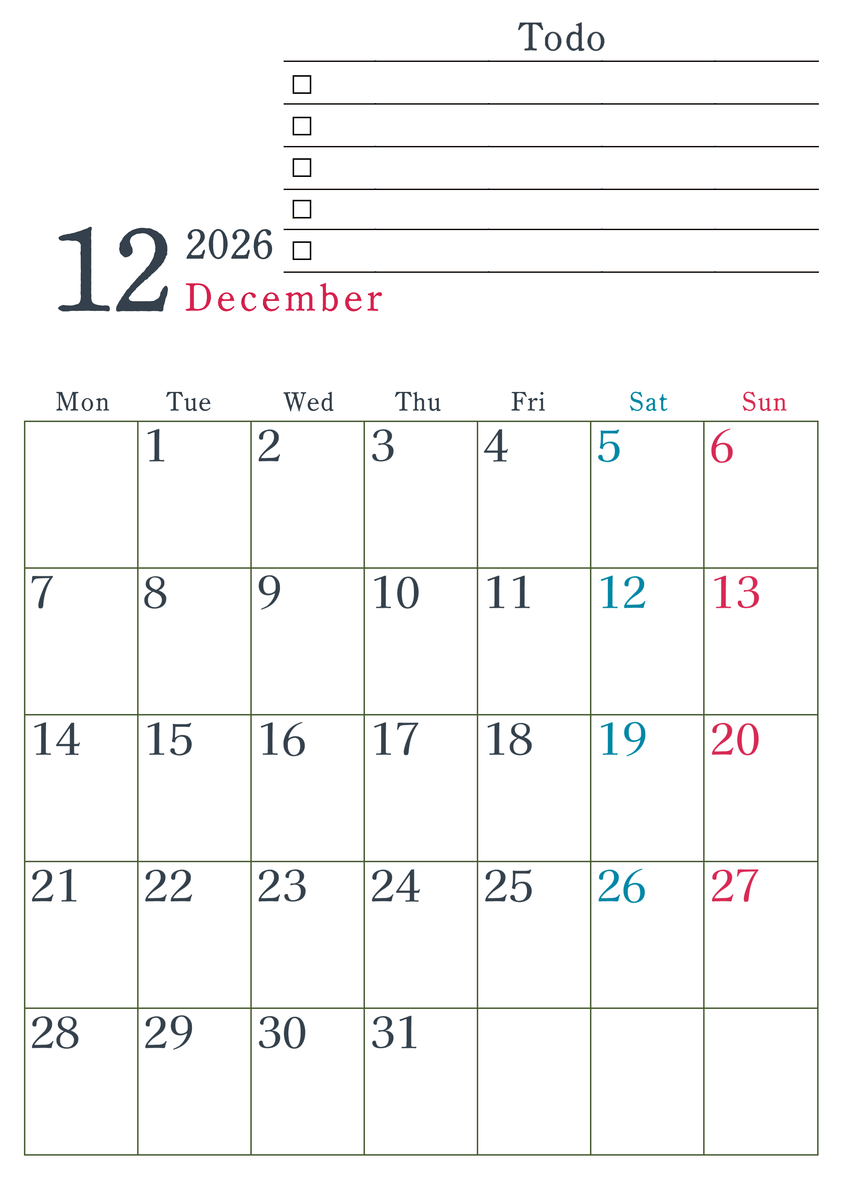 2026年・無料のカレンダーテンプレート 2026年12月カレンダーは縦型月曜始まりで使い方はシンプルなToDoリストつき♪無料ダウンロード・A4印刷(2026-01441211) 素材状デザイン王 2025年4月12日 2026年12月カレンダーは縦型月曜始まりで使い方はシンプルなToDoリストつきです。無料ダウンロードしてA4印刷しましょう。(2026-01441211) 12月 縦型のカレンダー 月曜始まり ToDoリスト カレンダーデザイン-0144