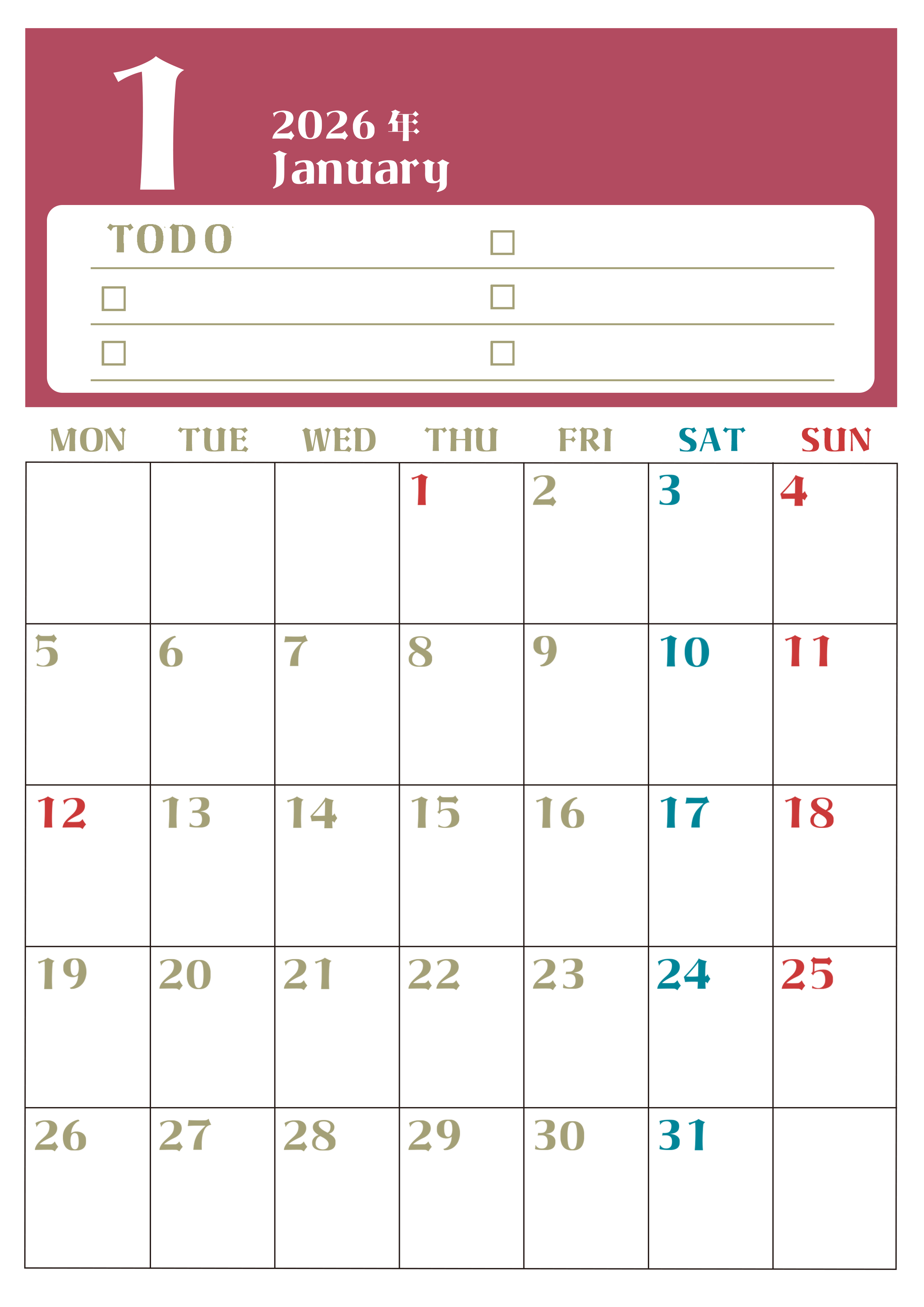 2026年1月カレンダーは縦型月曜始まりです。ToDoリストで勉強や自己啓発の継続を心がけましょう。A4サイズで無料です。(2026-01450111)